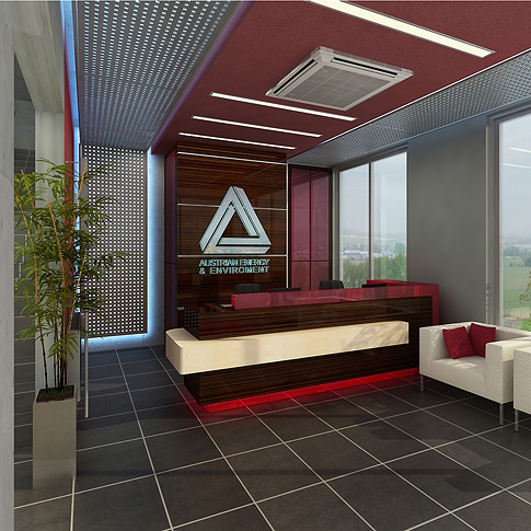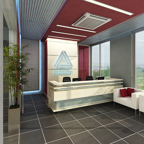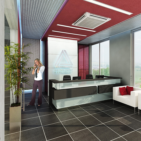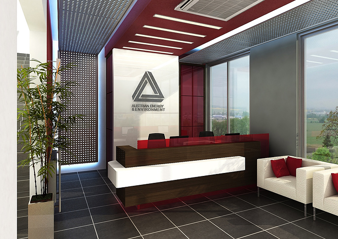 Vstupní hala a recepce vytváří první dojem. Vybrané materiály a barevné ladění by mělo odrážet firemní identitu a být dostatečně reprezentativní. Dominantní barvou v tomto prostoru je rudá, která se nachází jak na stěnách, tak i na stropě. Dokonce se vyskytuje i na doplňcích v kombinaci s bílým nábytkem. Obě tyto barvy zvýrazňuje černá podlaha.