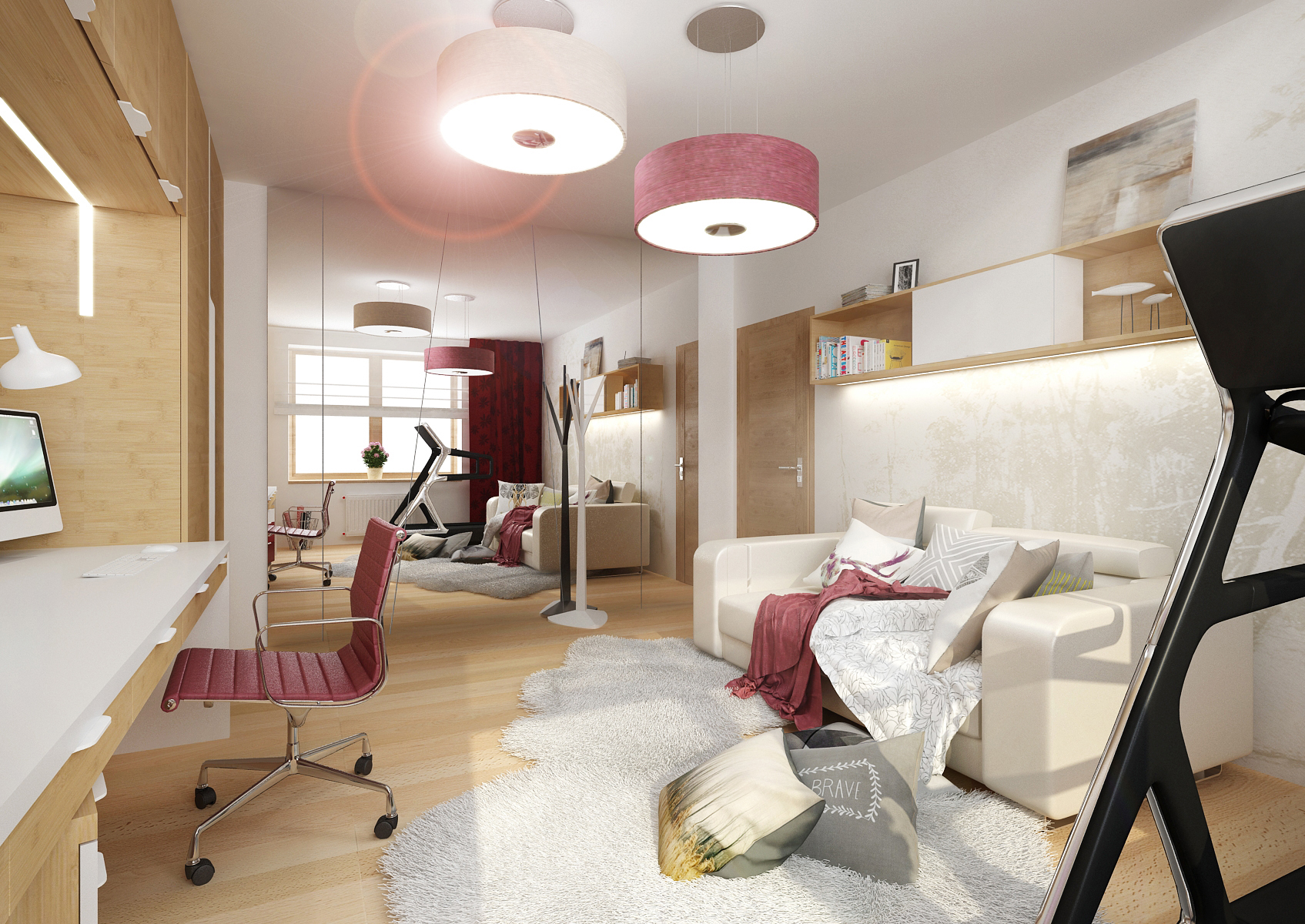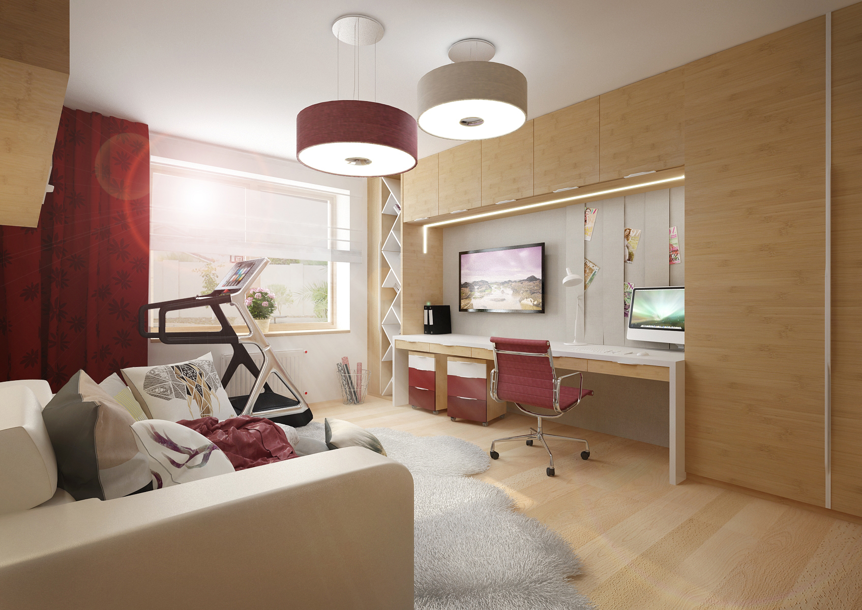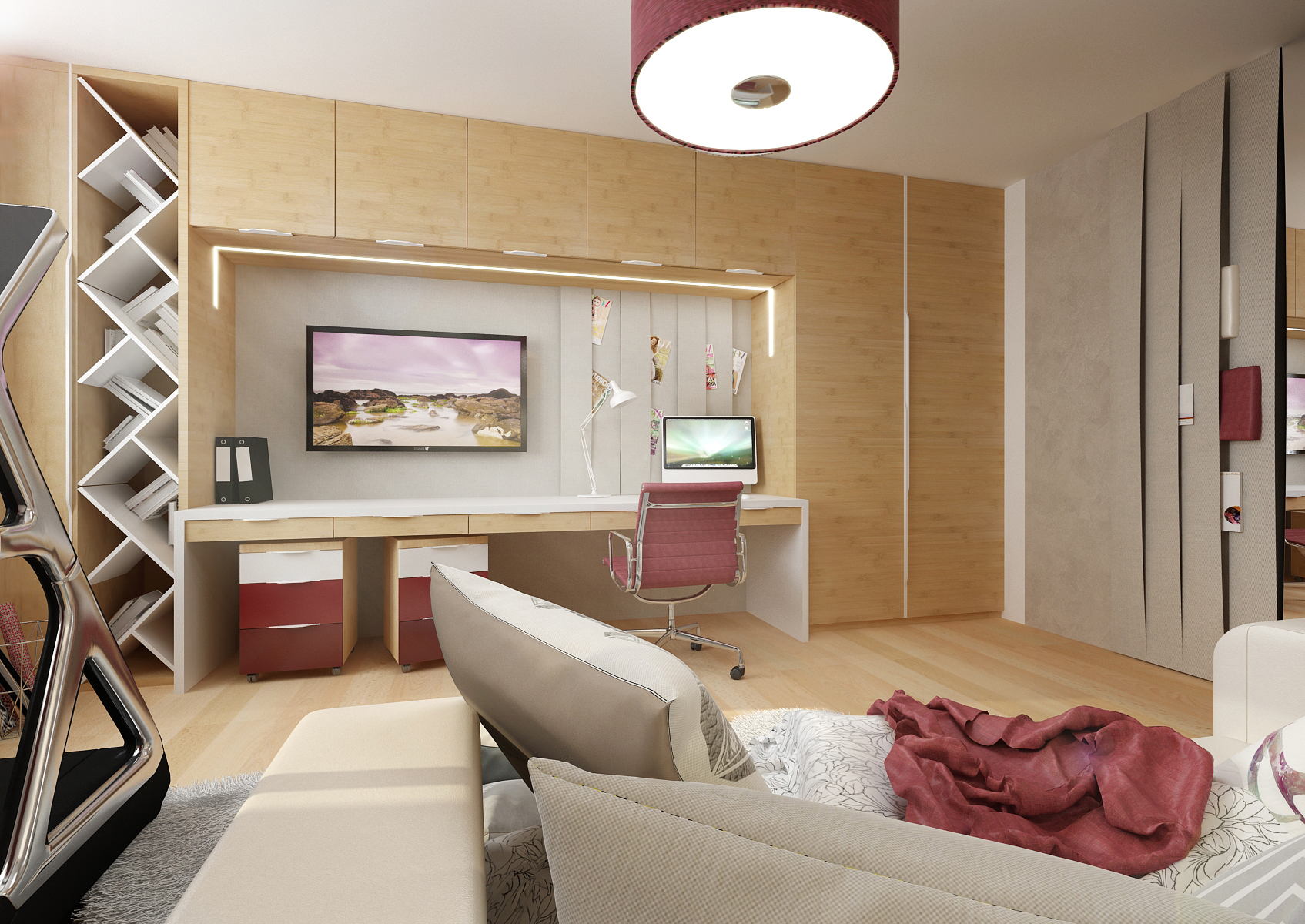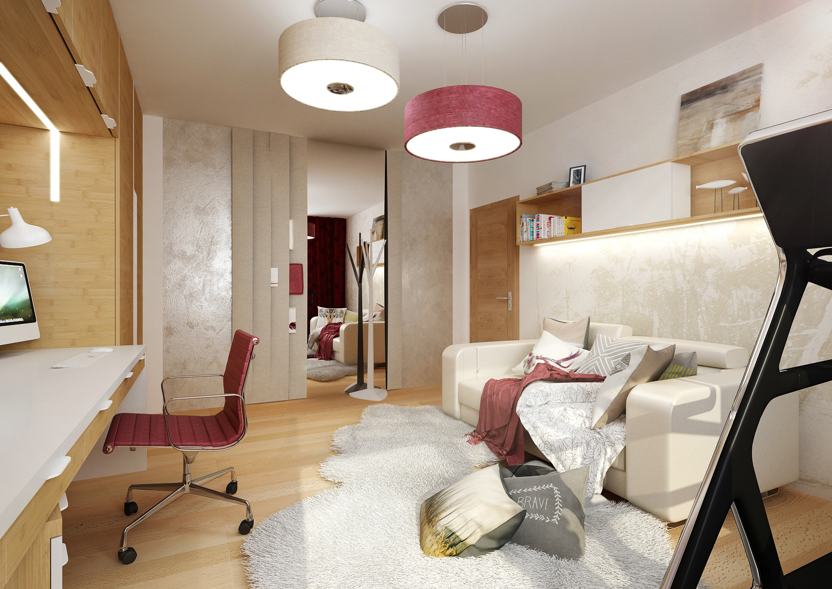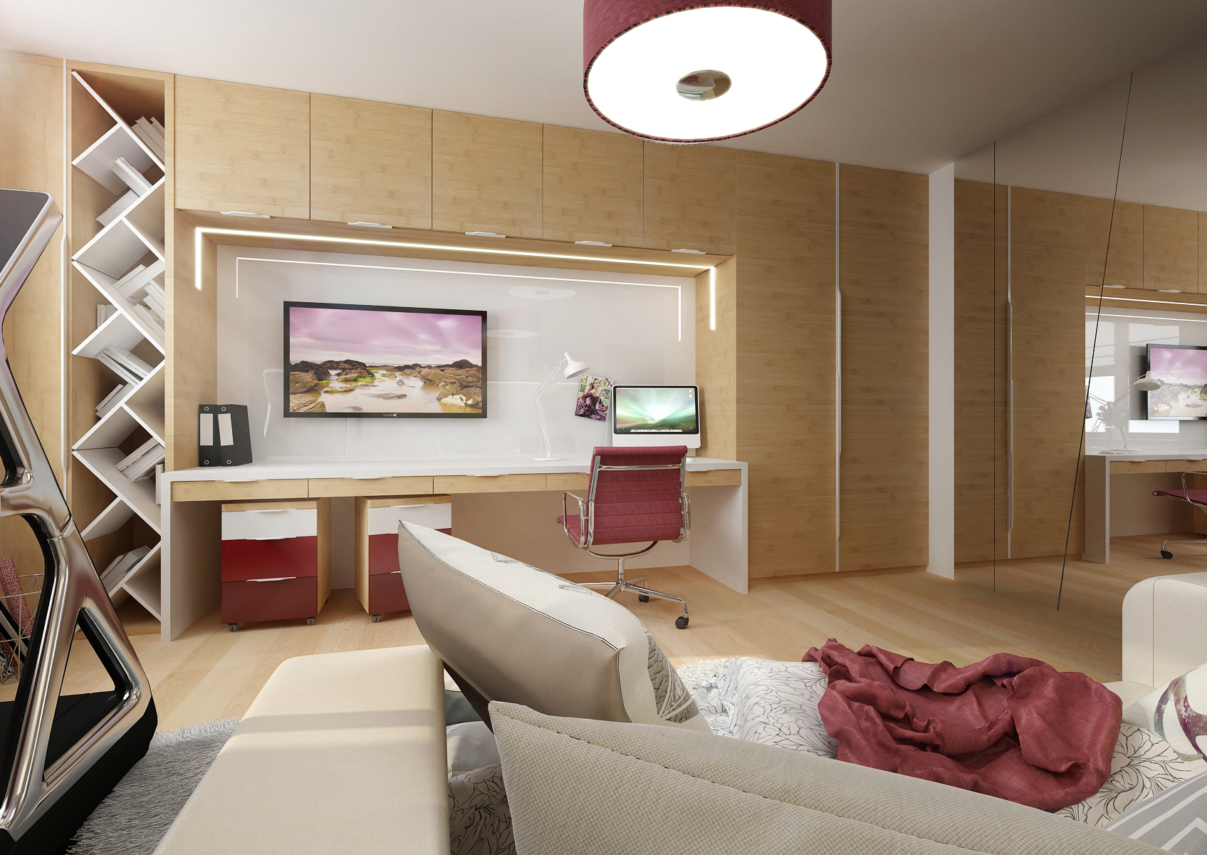 Další ze série domácích pracoven tentokrát v dámském provedení. Skříňová sestava s vestavěným stolem poskytuje dostatek úložného prostoru i místa na práci. Prostor je laděný do světlých odstínů doplněných červenými doplňky. Zrcadlové obložení stěny opticky zvětšuje místnost.