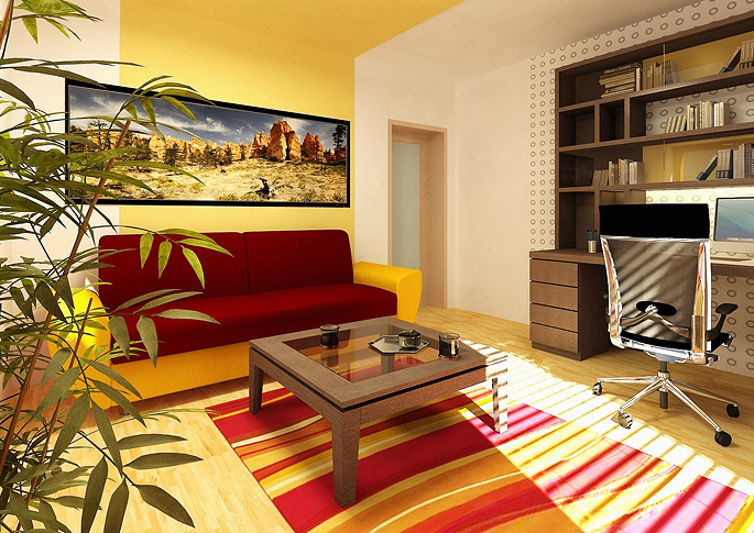 Pracovna v prostředí domova v barvách a ve stylu okolního interiéru. Pracovní stůl a police provedení ve wenge dýze. Je zde kombinována červená se žlutou a hnědou nebo se nabízí vrze v kombinaci s béžovou, která působí úhledně a čistě.