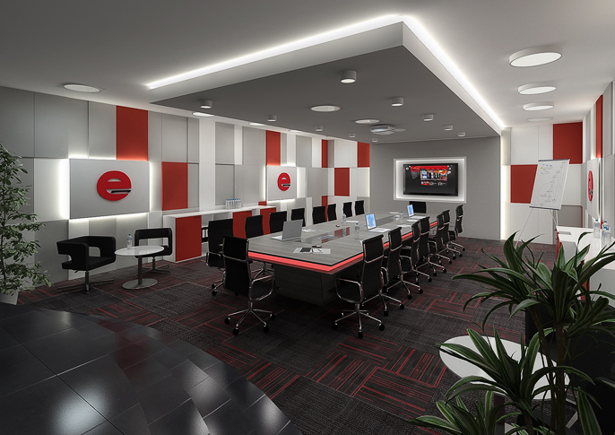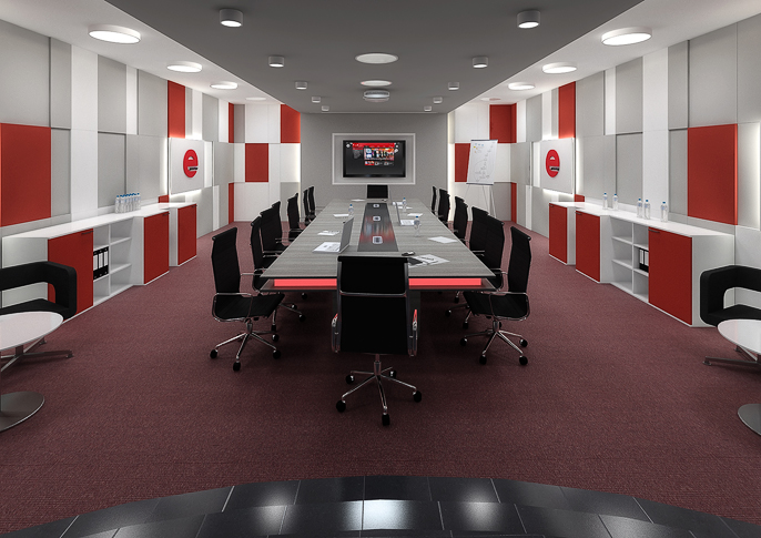 Barevné schéma návrhu koresponduje s barvami firmy zabývající se distribucí výherních automatů. Čtvercový rastr je jako blikající pixely na obrazovkách přístrojů, podsvětlení zasedacího stolu jako světelné dekorace na nich umístěné.