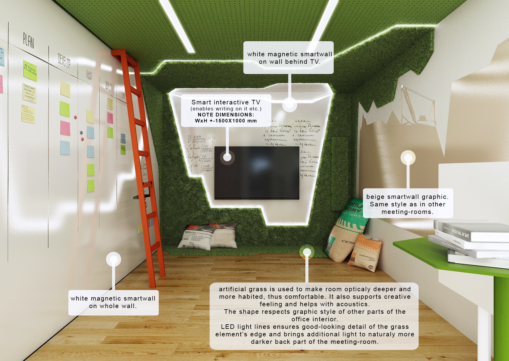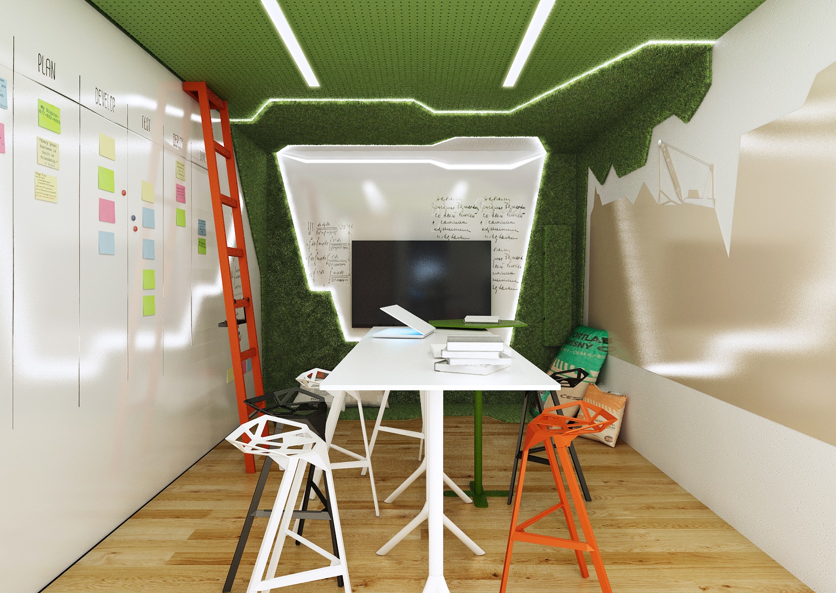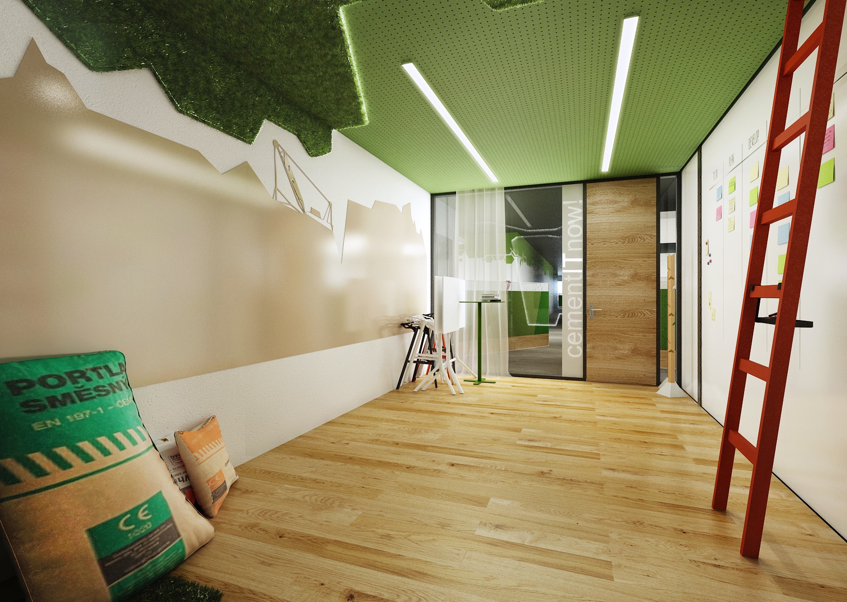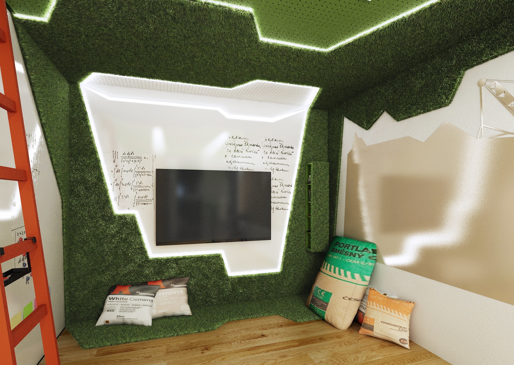 Jsou tu např. sklápěcí podnož Nemo nebo židle One. Na čelní stěně je nalepen zelený koberec z umělé trávy, jehož tvar kopíruje polygonální grafiku použitou v ostatních místnostech..