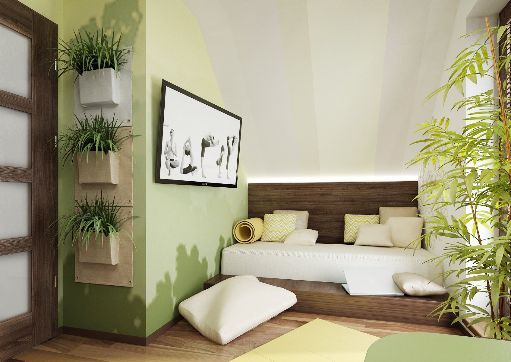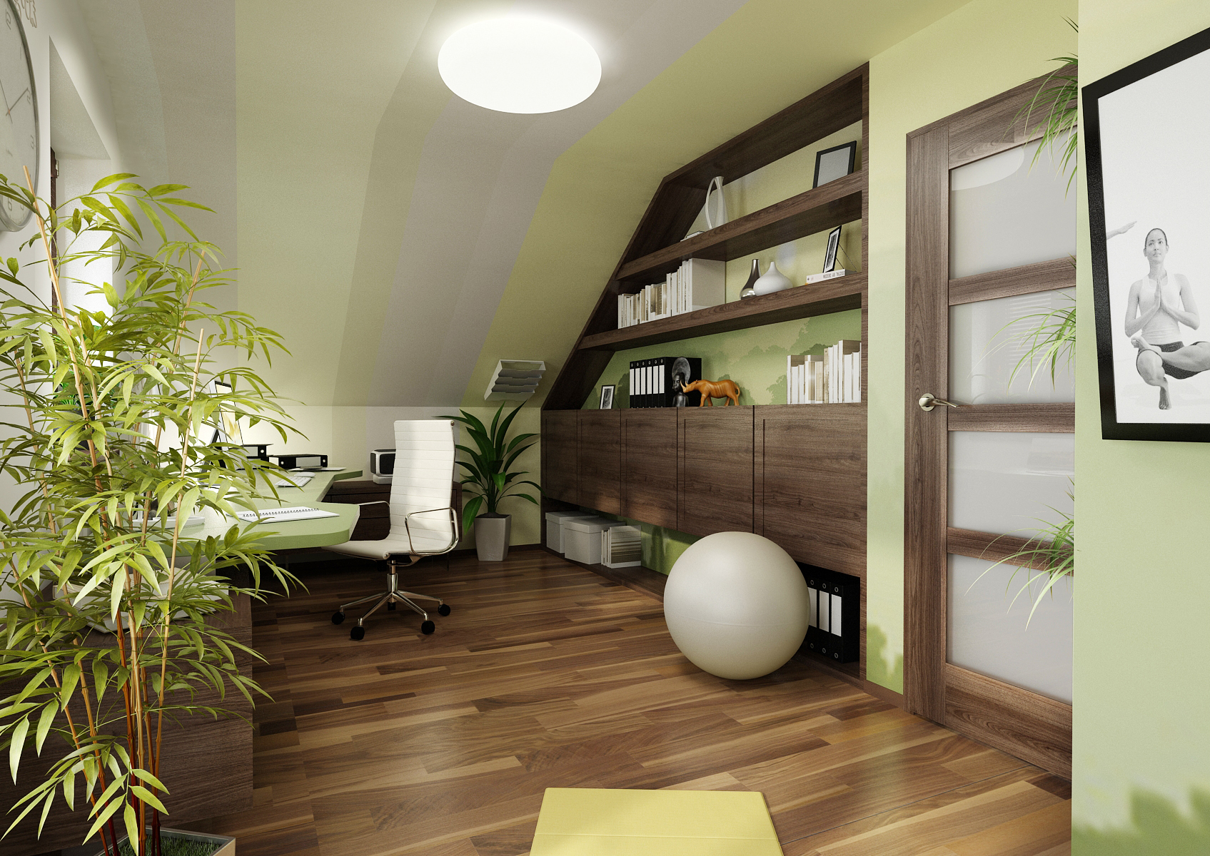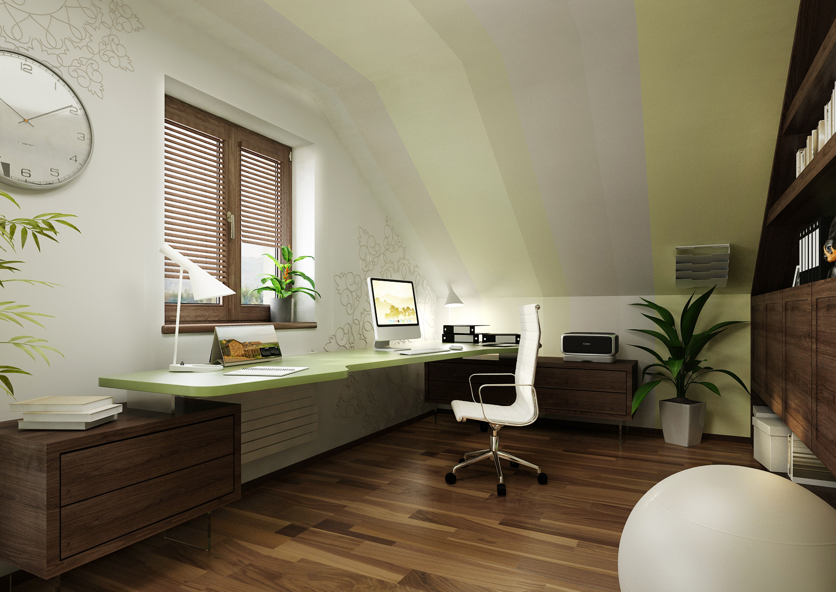 Pracovna v podkroví rodinného domu laděná do uklidňujících odstínů zelené barvy. Na nábytku dominuje tmavý odstín dubového dřeva. Stůl je podepřen skříňkami na skleněných nohách, které tak působí odlehčeně. Pro relax během práce je pod šikminou vestavná pohovka. Prostor je zútulňený květinami, které jsou vidět i v našich kapsářích Greenpockets.