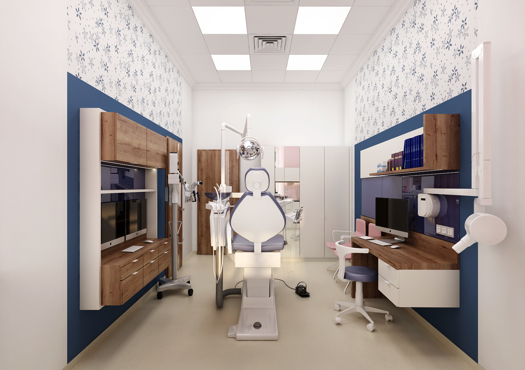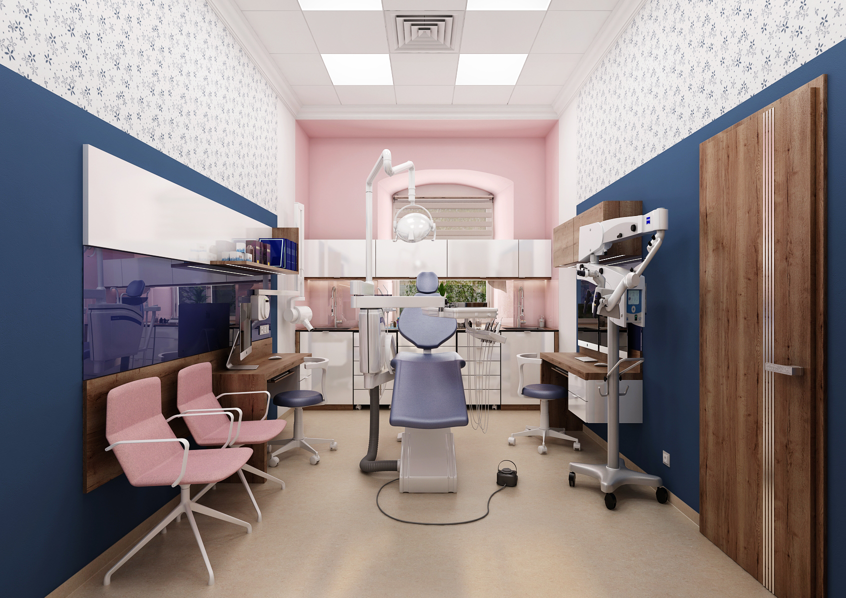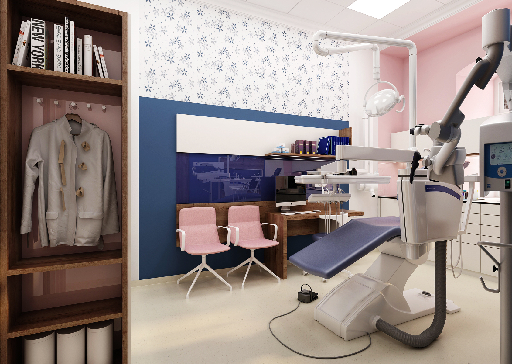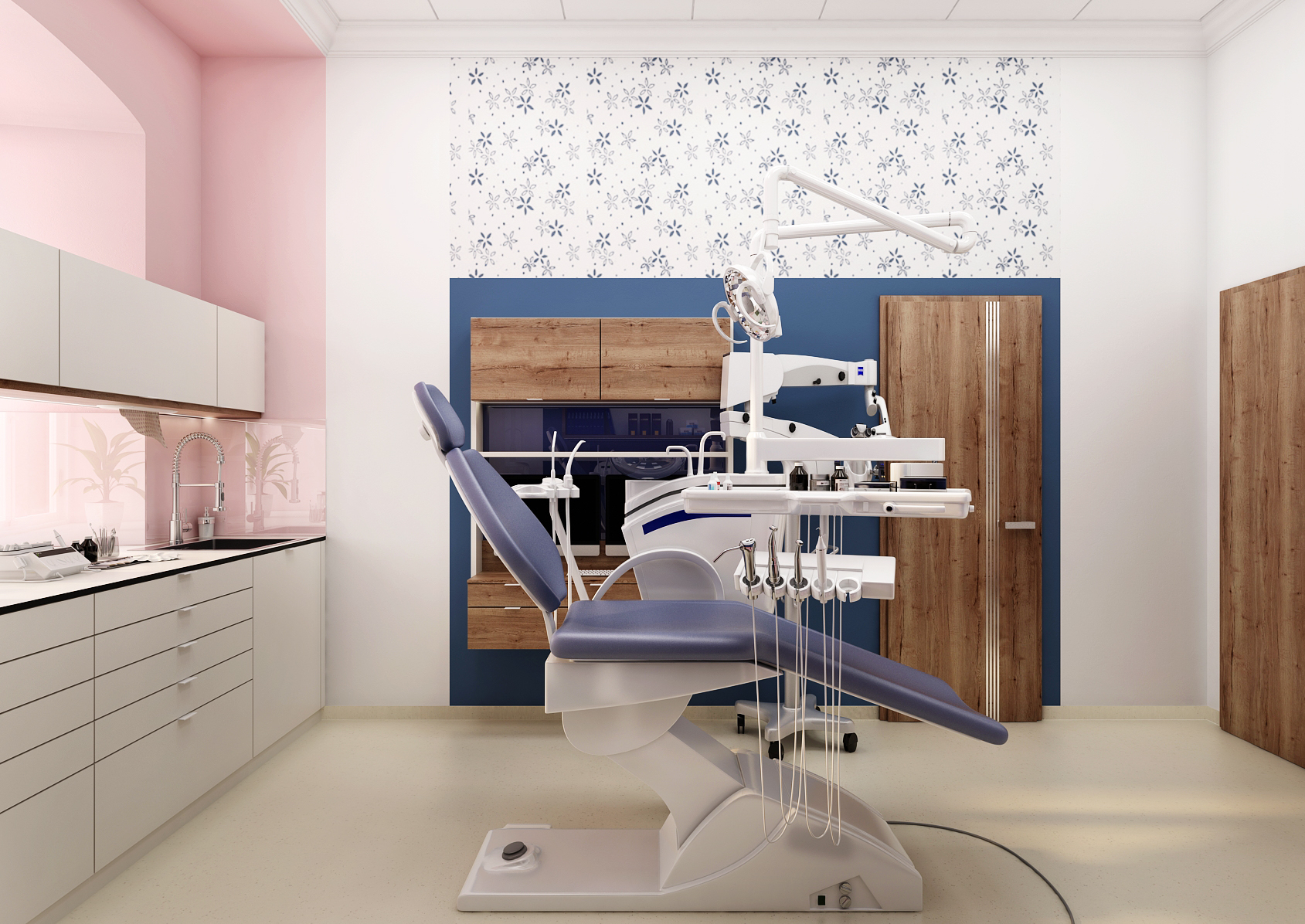 Při rekonstrukce zubařské ordinace, které je situována v historické budově, jsme se zaměřili na zpříjemnění prostoru. K tomu bylo využito kombinace barev, ale i vzorované tapety. Zároveň je potřeba dbát na ergonomii vybavení, která byla konzultována přímo se zubařem.
