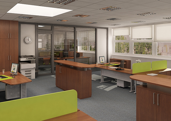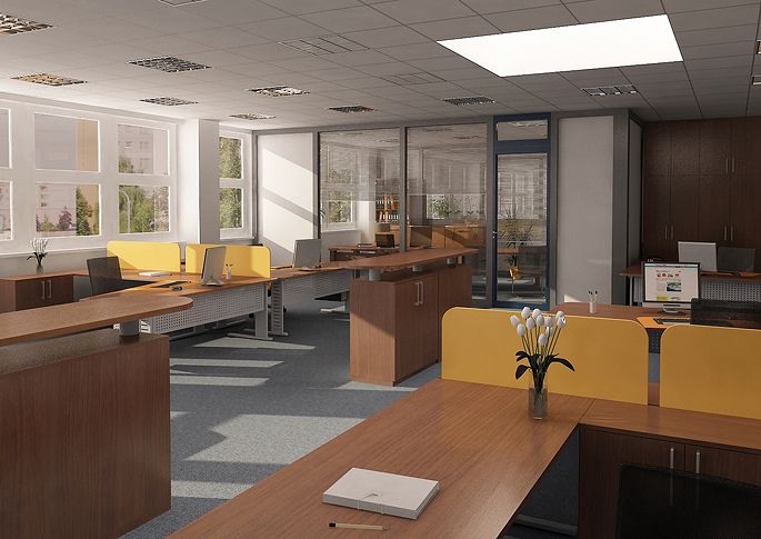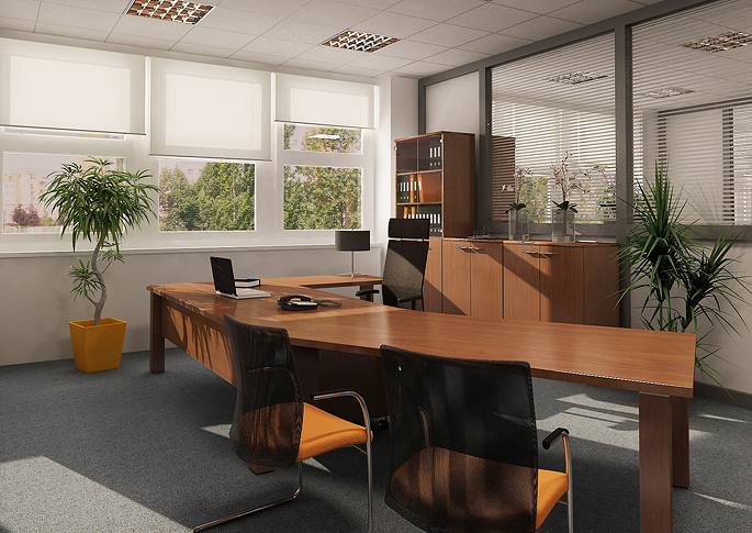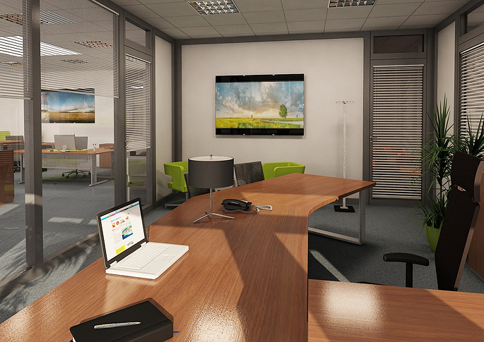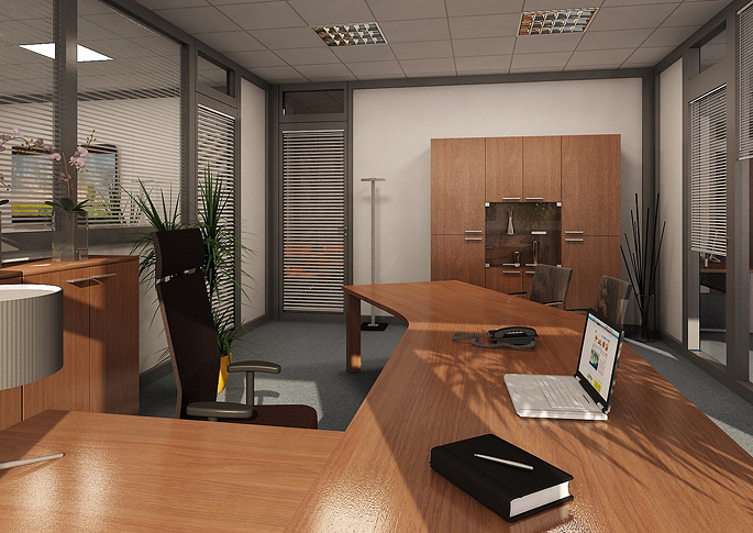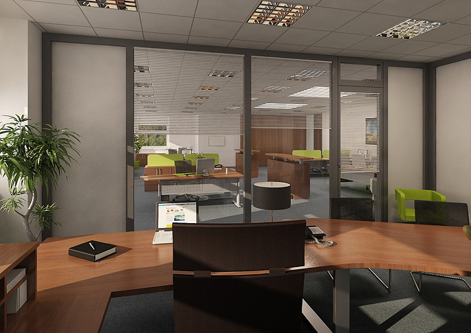 Návrh kanceláři v administrativní budově, open space i zasedací místnosti a kancelář vedoucího. Místnosti jsou laděny do tmavých barev v kombinaci s červenohnědým dřevem. Jako zpestření jsou použity zelené a žluté doplňky. Prostor působí moderně díky čistému šedému koberci a prosklenými oddělovacími stěnami s černým rámem.