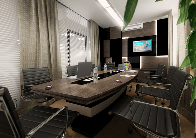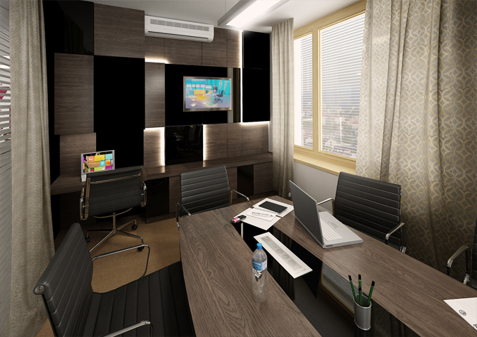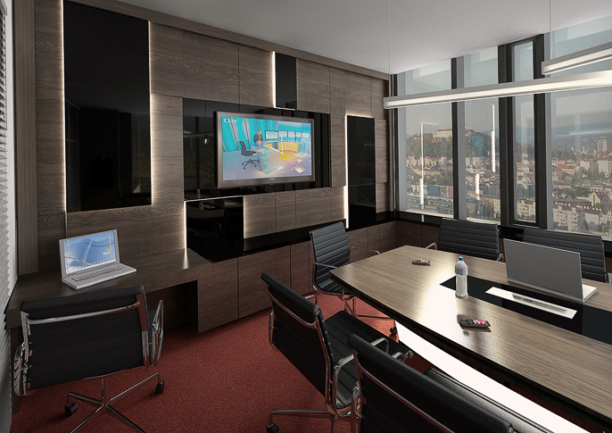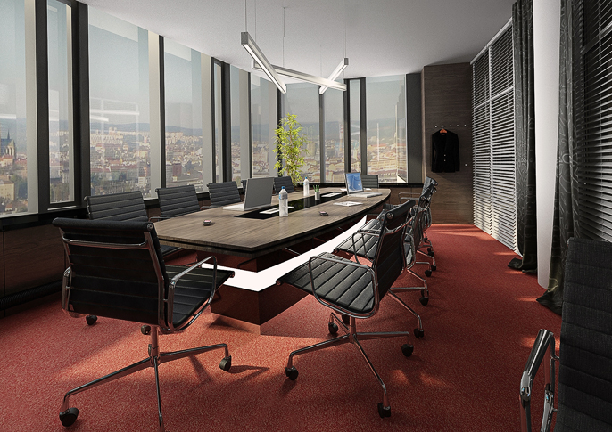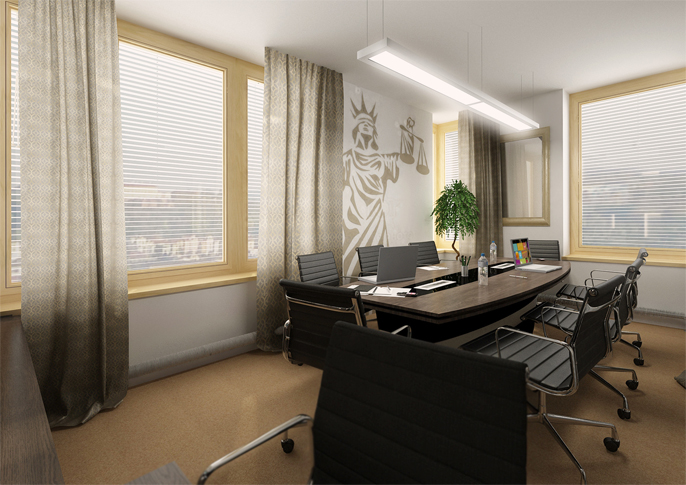 Zasedačka pro advokáty v brněnském ,,mrakodrapu,,. Krásný výhled na Brno, obklady z tmavého dubu a černého lacobelu s podsvícením LED dodávají místnosti elegantní a seriózní dojem. Nechybí ani moderní vybavení. Velká okna po celé délce stěny dodávají místnosti dostatek přirozeného světla. Tmavé barvy jsou kombinovány s červeným kobercem v jedné variantě a v druhé je volena světlá podlaha projasňující místnost.