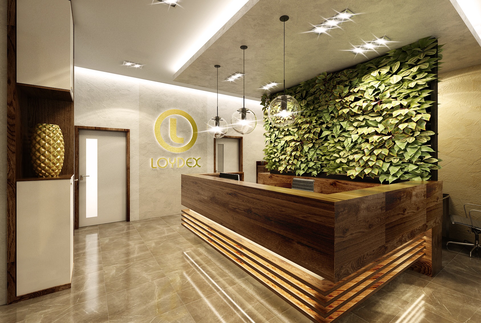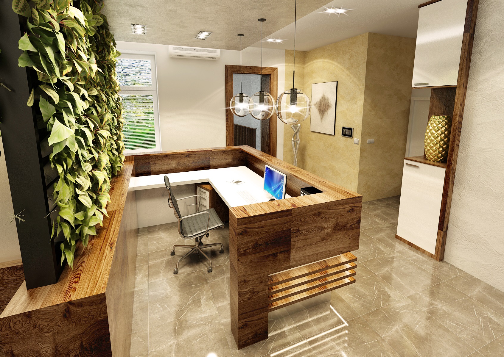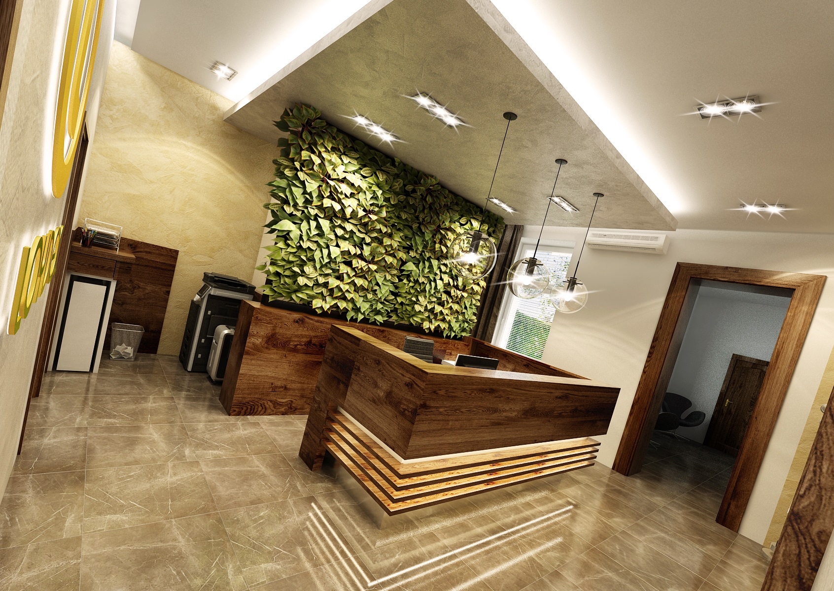 Vstupní prostor s recepcí, který je nábytkovou příčkou rozdělený na několik funkčních zón. Část stěny za recepcí je obložena stabilizovaným mechem, na kterém je ještě podsvícené logo firmy. V levém rohu od recepce je prostor na nezbytnou kanc. techniku. Vpravo se nachází menší zasedací prostor na rychlá jednání s archivem.