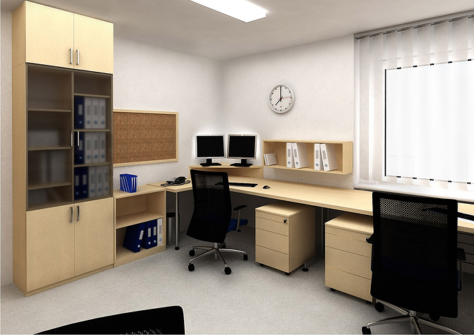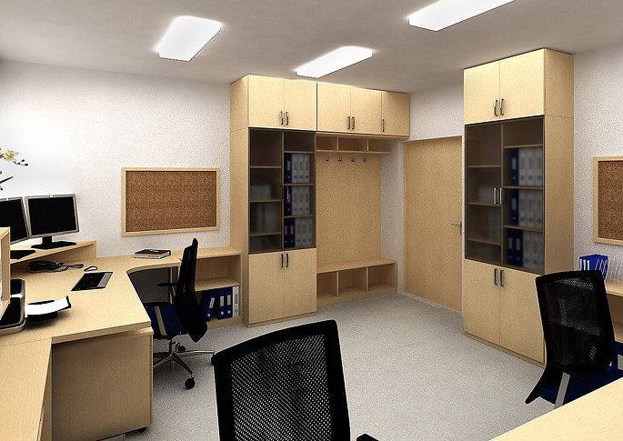Jednoduché světlé interiéry kanceláří s typovým nábytkem