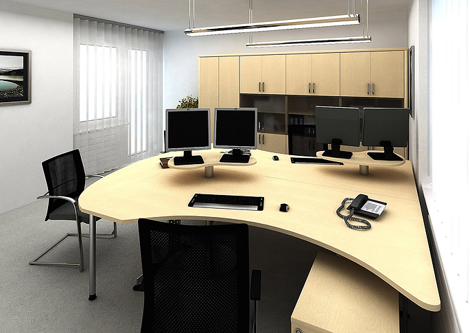 V těchto kancelářích je volen typový nábytek. Místnosti jsou navrženy ve stejném stylu. Jsou laděny do světlých barev v kombinaci s tmavými nábytkovými prvky. Světlá podlaha místnost projasňuje. Zajímavými prvky jsou atypicky tvarované zaoblené stolové desky. Je zde také dostatek úložného prostoru v podobě vysokých skříní se zatmaveným sklem na dvířkách.