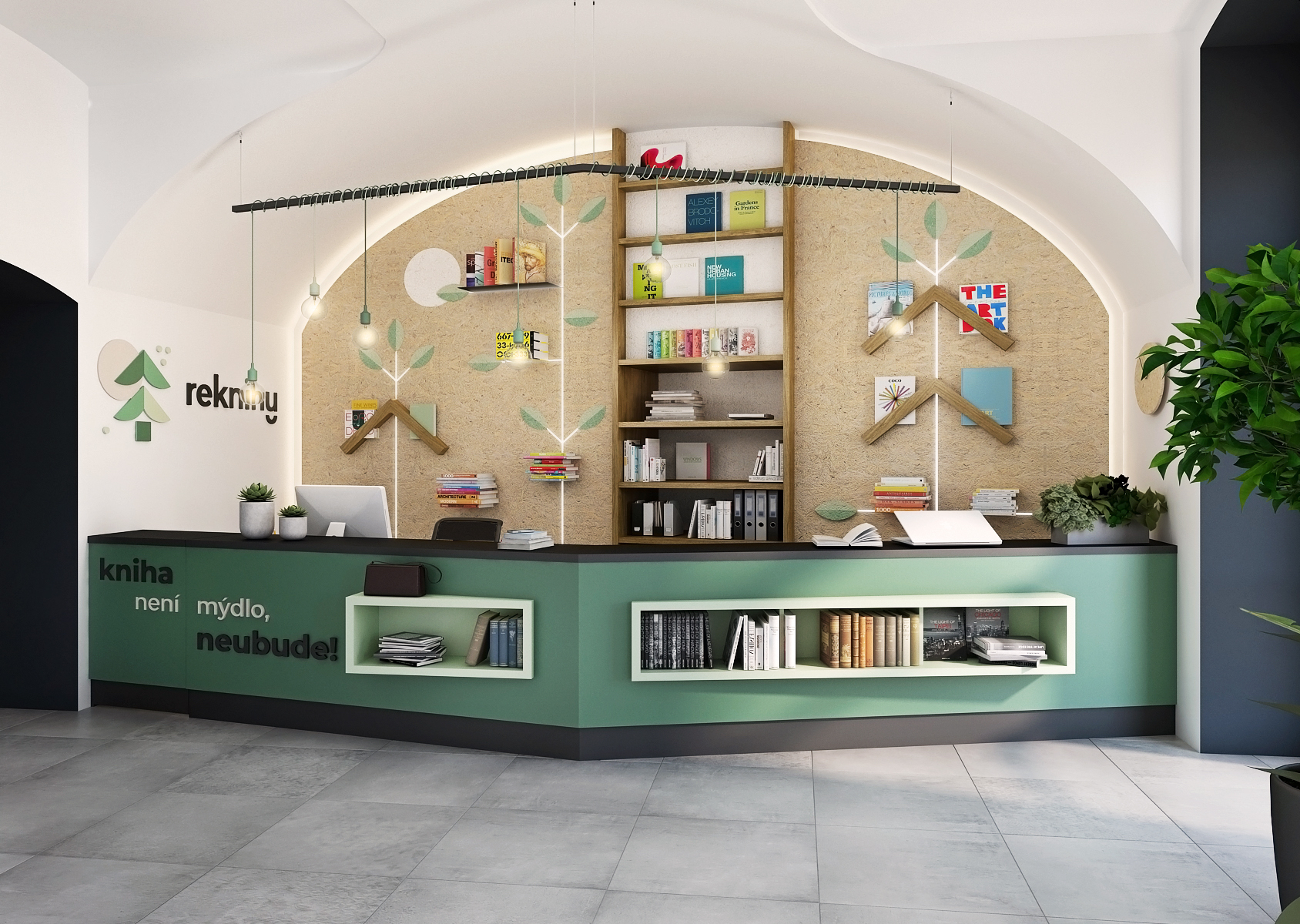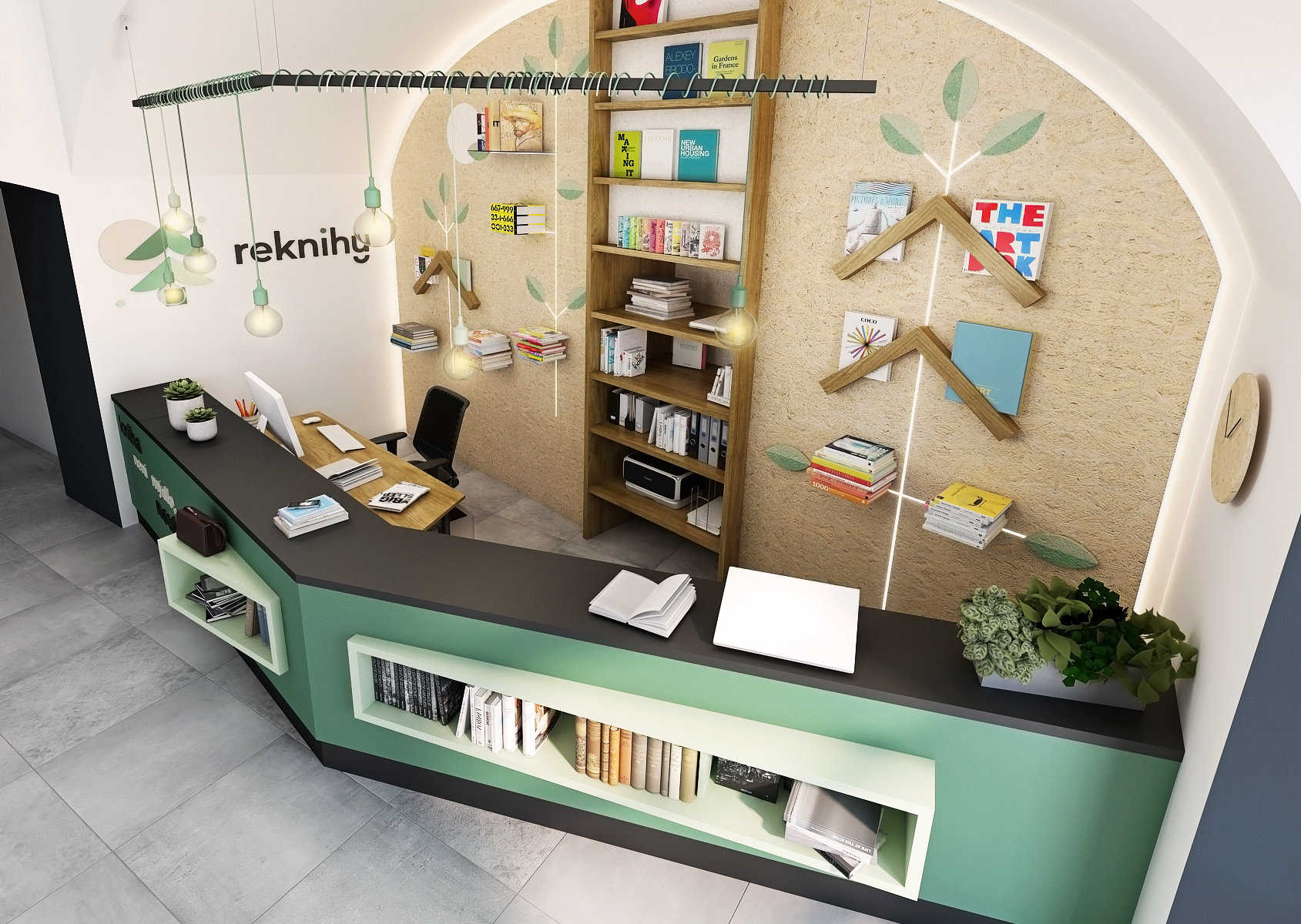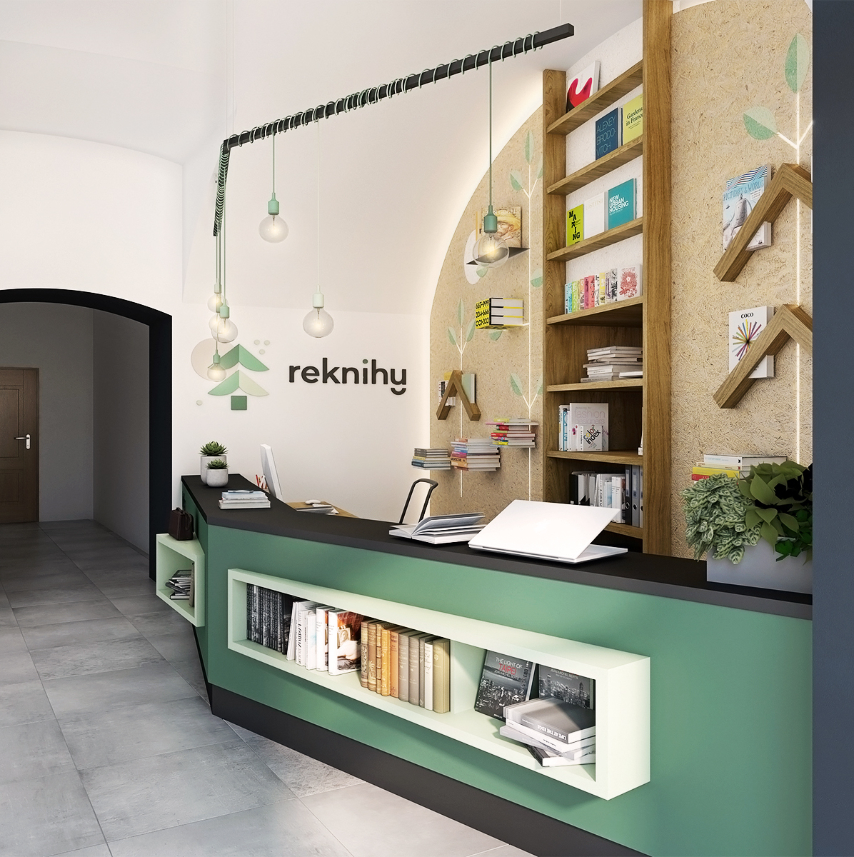 Při návrhu kanceláří knihkupectví Reknihy byla jako dominantní barva využita zelená v různých odstínech podtrhující tak ekologickou myšlenku Reknih.