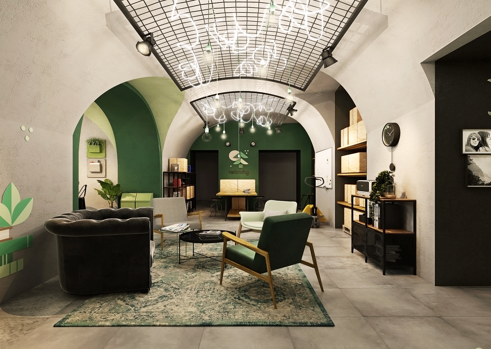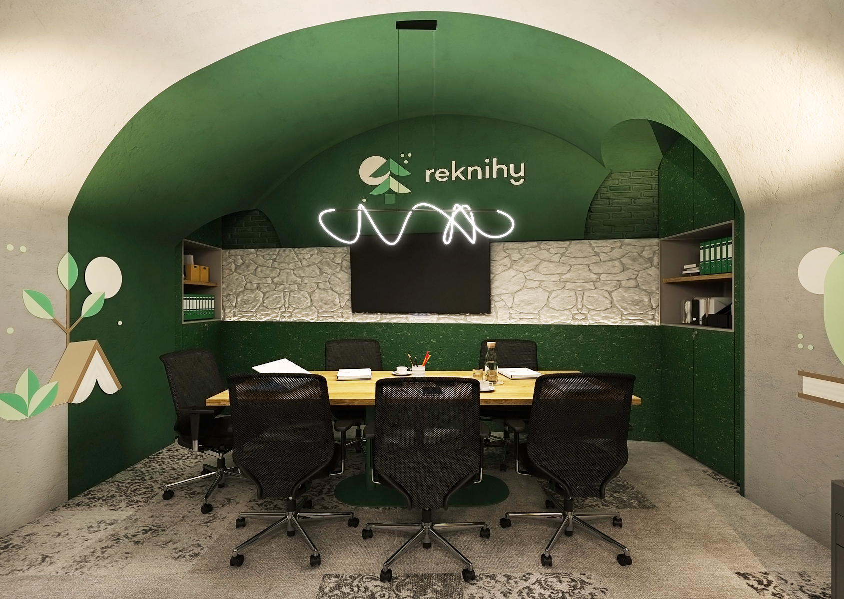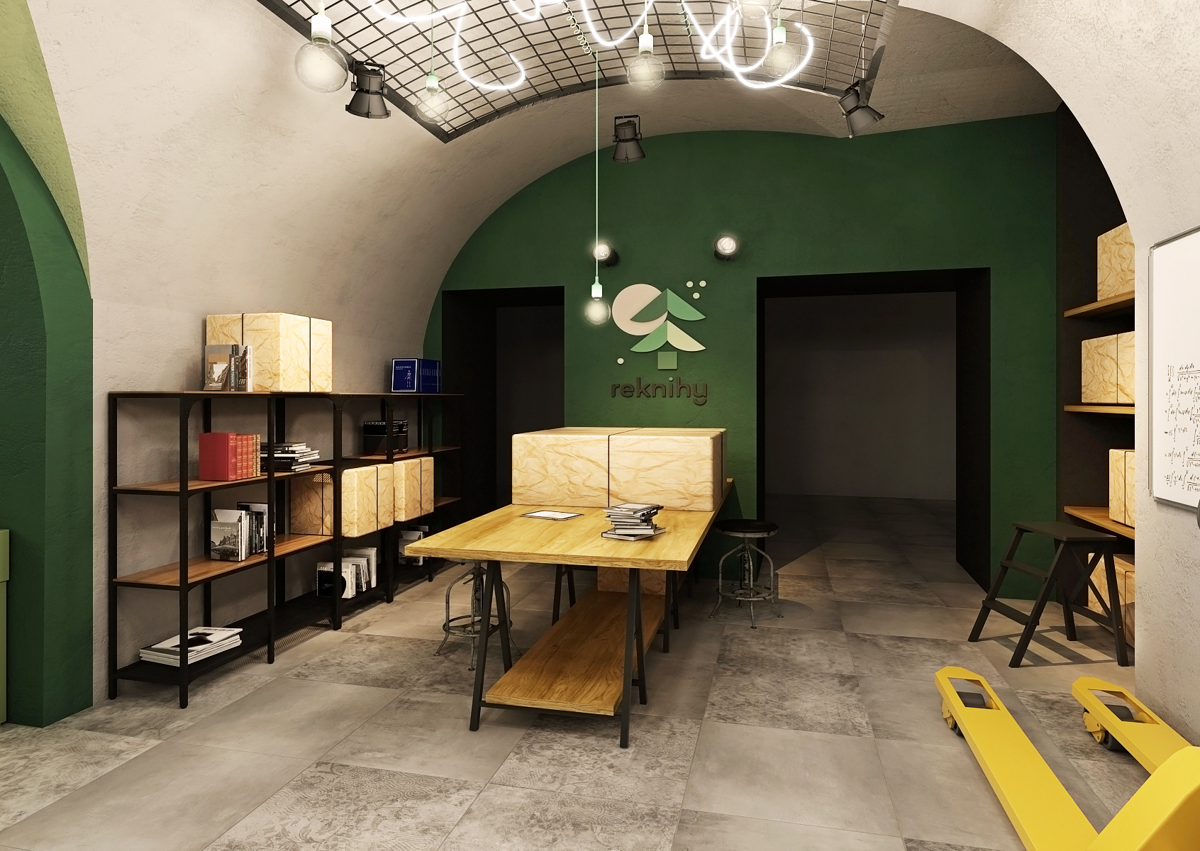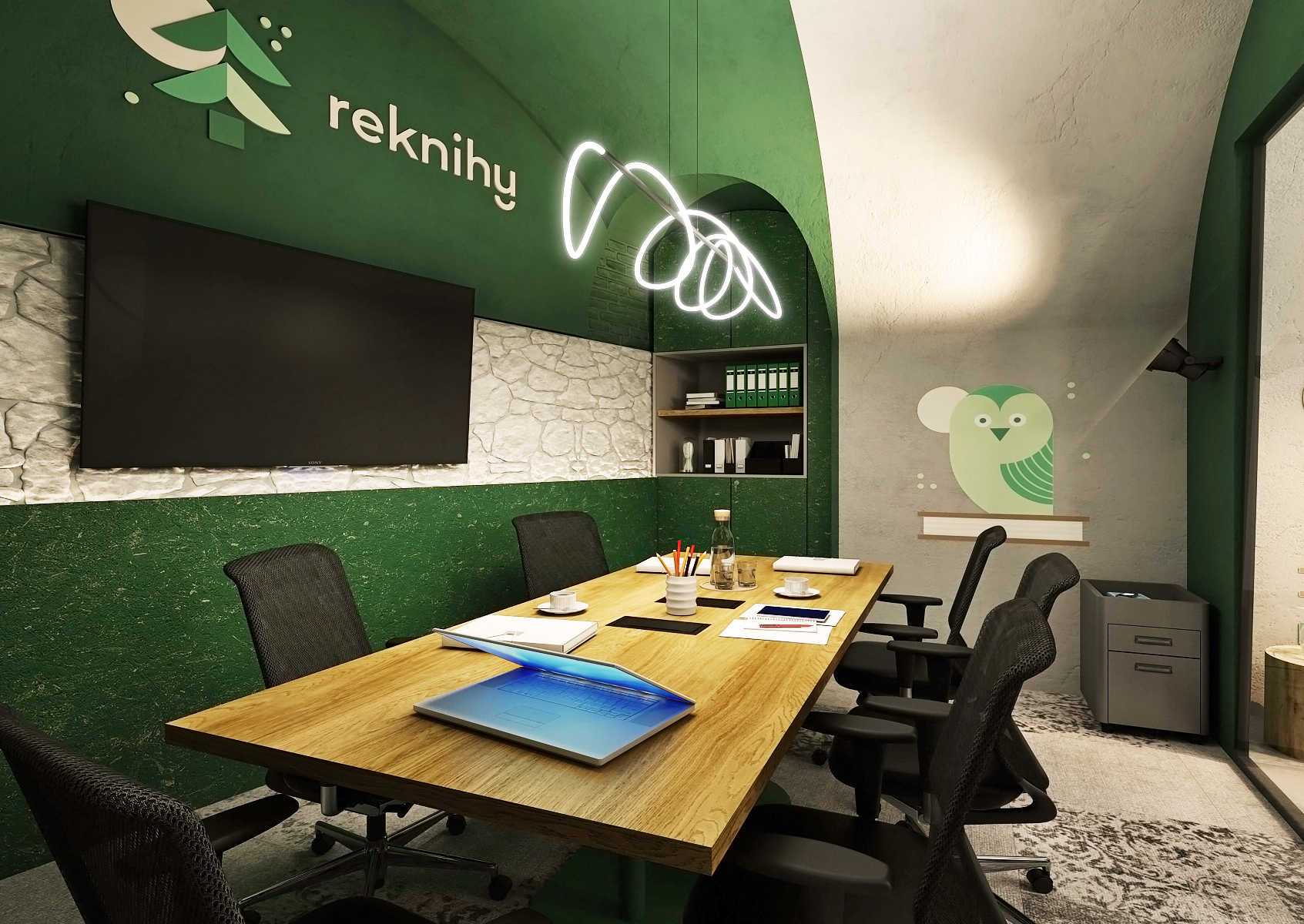 Při návrhu kanceláří knihkupectví Reknihy byla jako dominantní barva využita zelená v různých odstínech podtrhující tak ekologickou myšlenku Reknih.