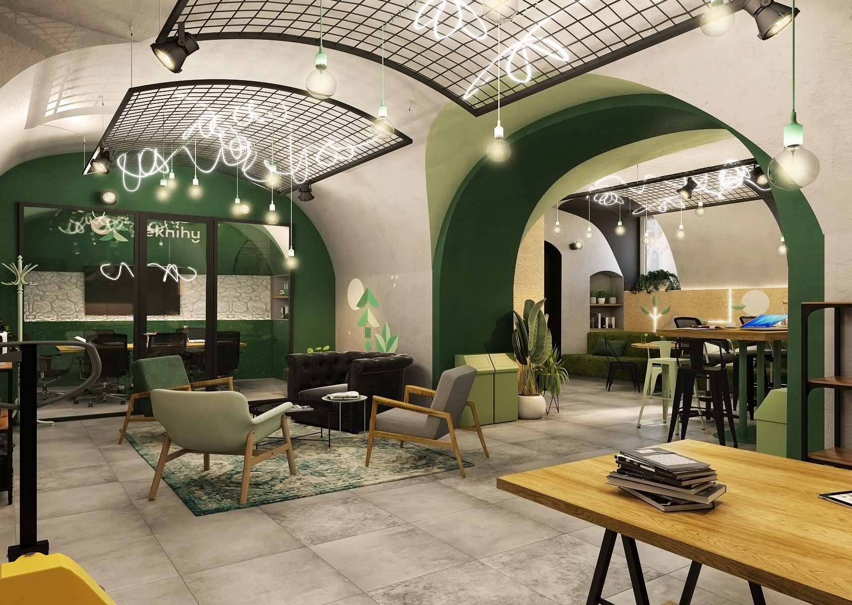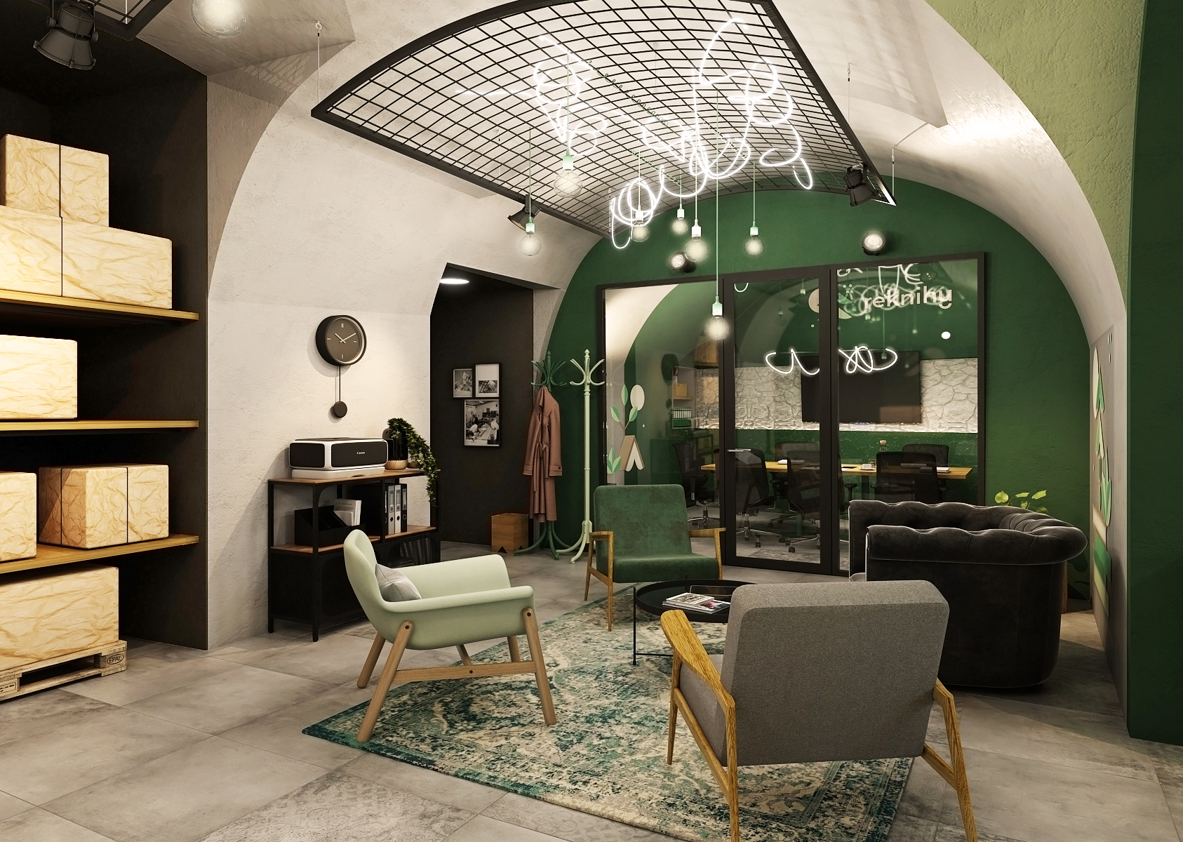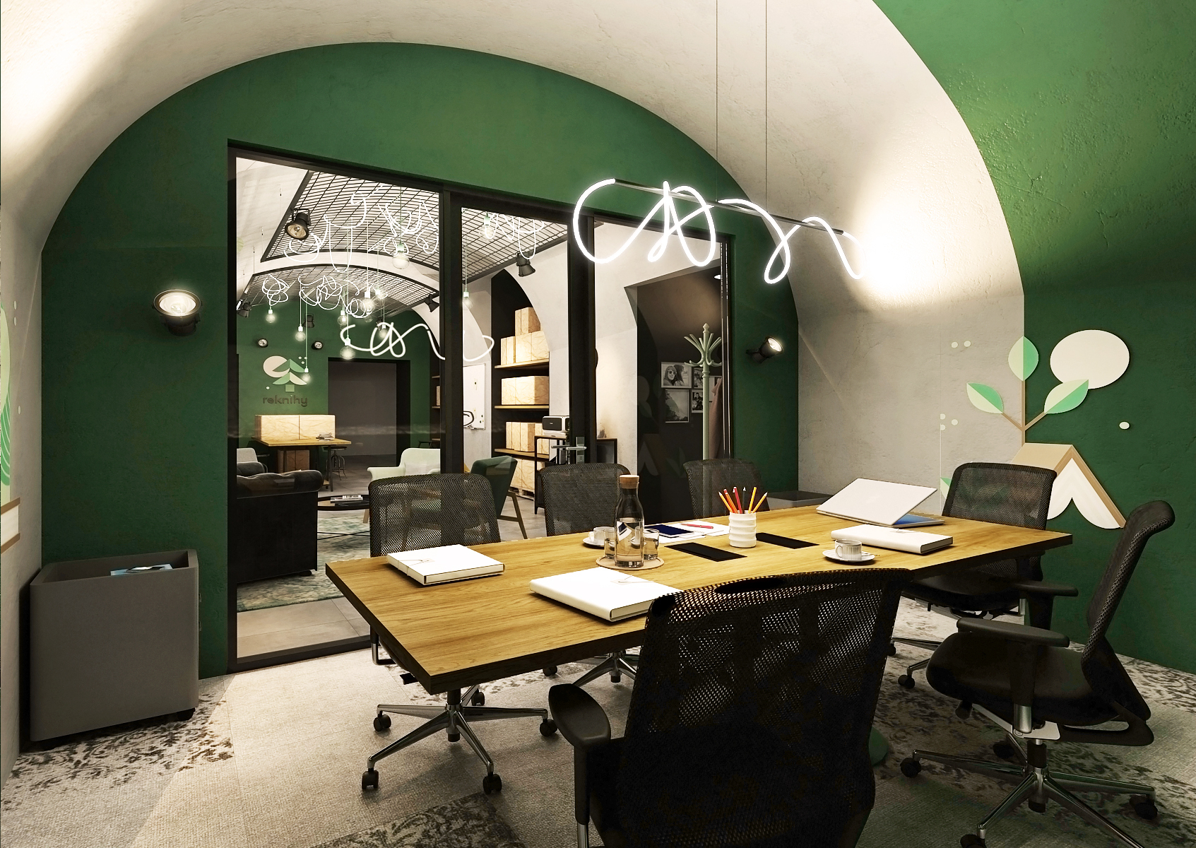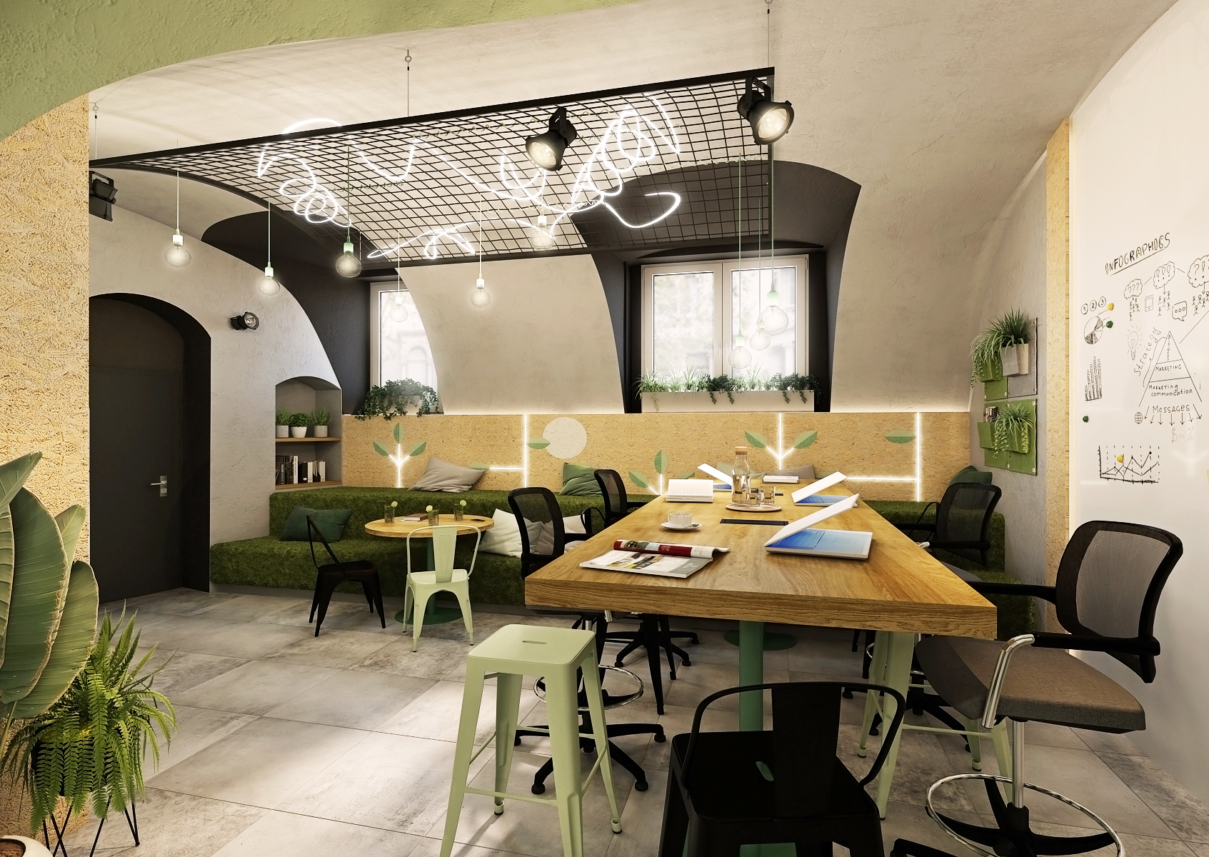Kanceláře jsou situovány v historické budově s klenutými stropy, jejichž tvar kopírují rámové konstrukce se síťovou výplní, do které jsou zamotána LED svítidla, reflektory a závěsná svítidla v podobě žárovek. Nepřímé osvětlení je zajištěno i LED pásky zafrézovanými v OSB desce pod okny se zdobením listů.