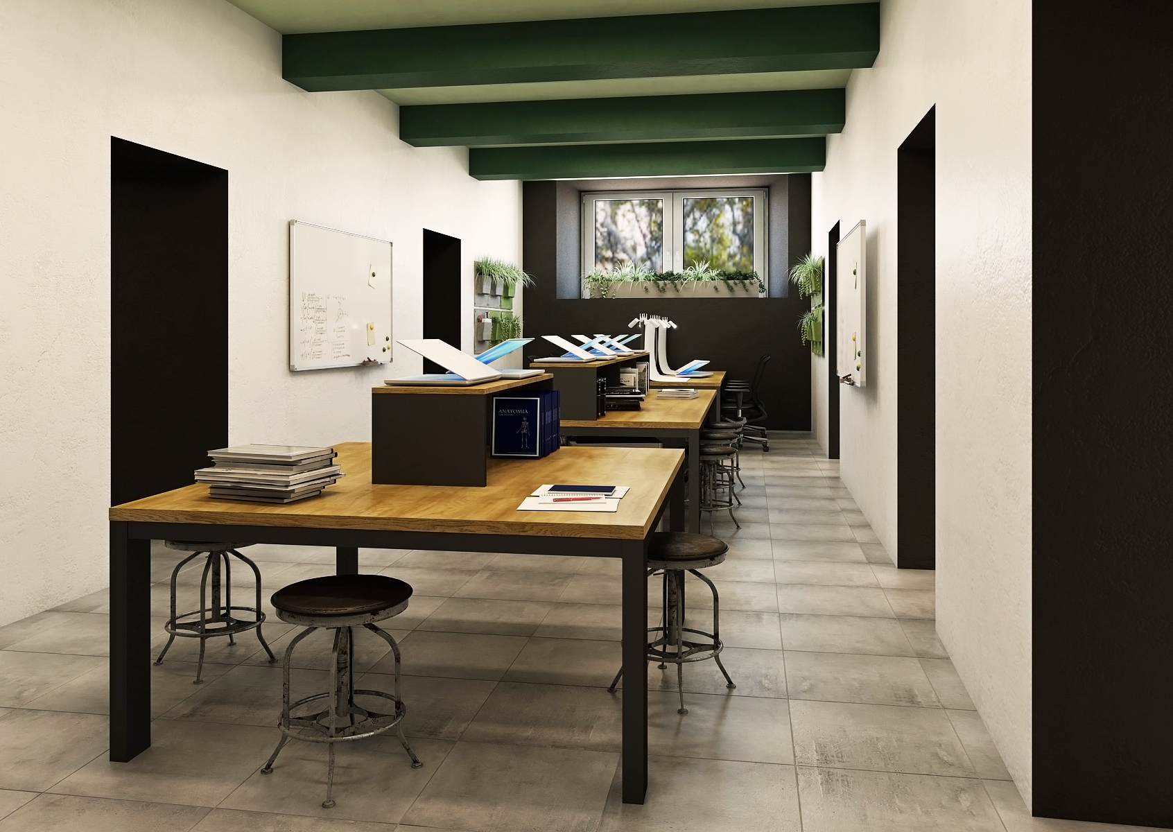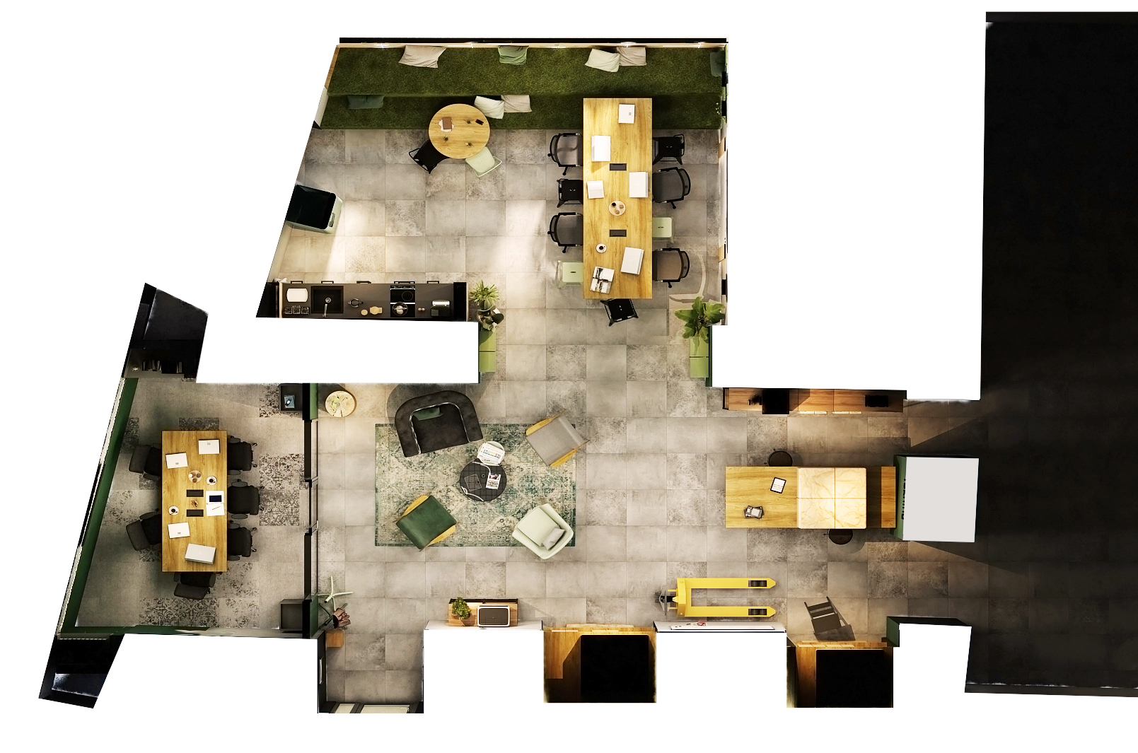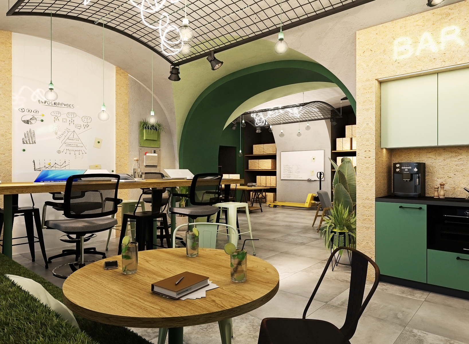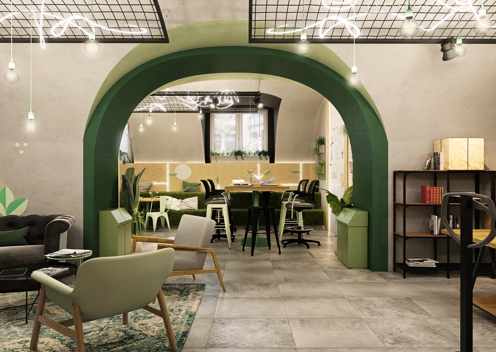 Kanceláře jsou situovány v historické budově s klenutými stropy, jejichž tvar kopírují rámové konstrukce se síťovou výplní, do které jsou zamotána LED svítidla, reflektory a závěsná svítidla v podobě žárovek. Nepřímé osvětlení je zajištěno i LED pásky zafrézovanými v OSB desce pod okny se zdobením listů.