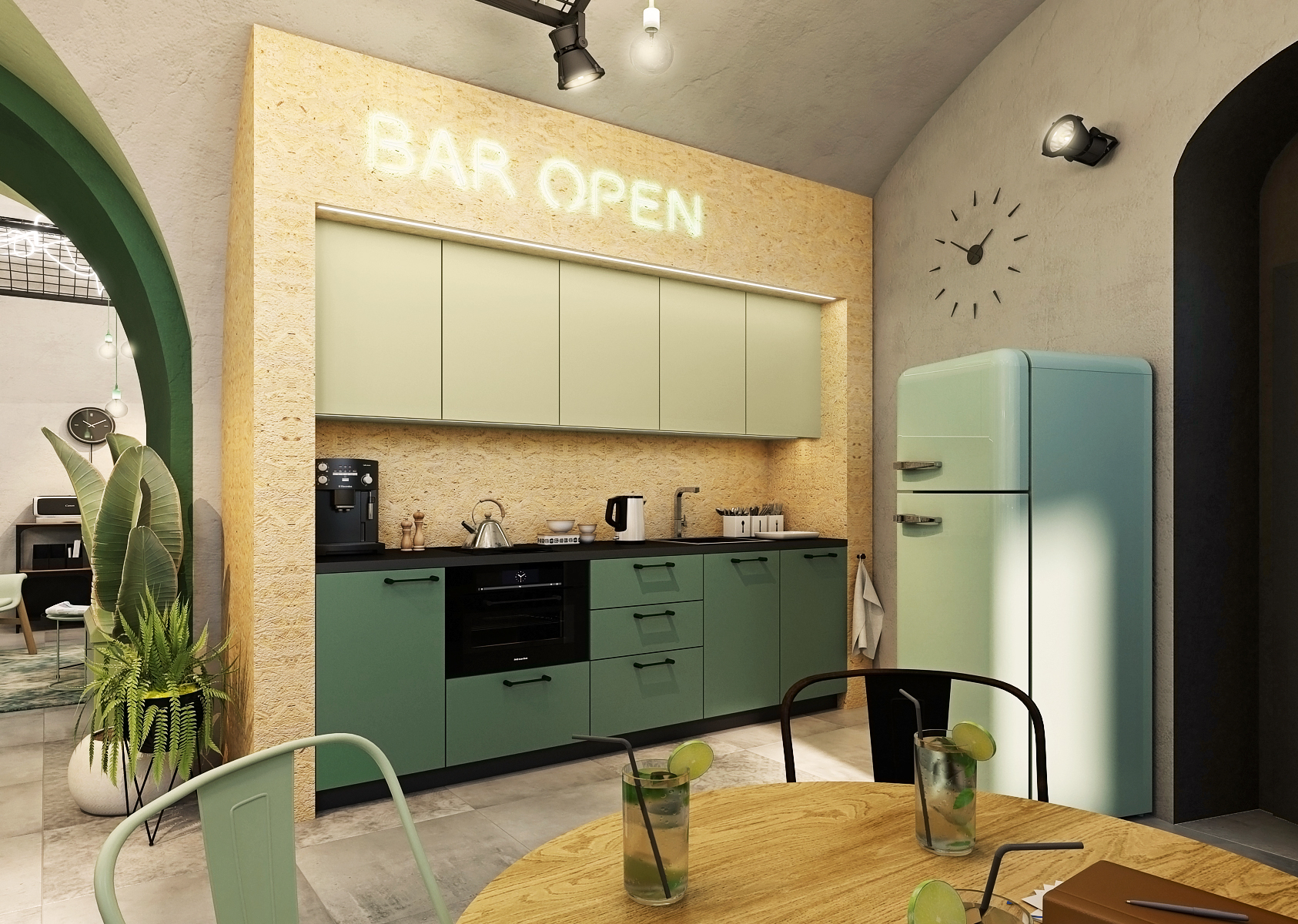Místa k sezení jsou řešena různorodě. Ať už se jedná o pracovní stůl s barovými židlemi nebo křesílky u odkládacího stolku, nejzajímavějším prvkem je lavice s umělým trávovým kobercem. Nechybí ani kuchyňka vestavěná do výklenku z OSB desky s neonovým nápisem.