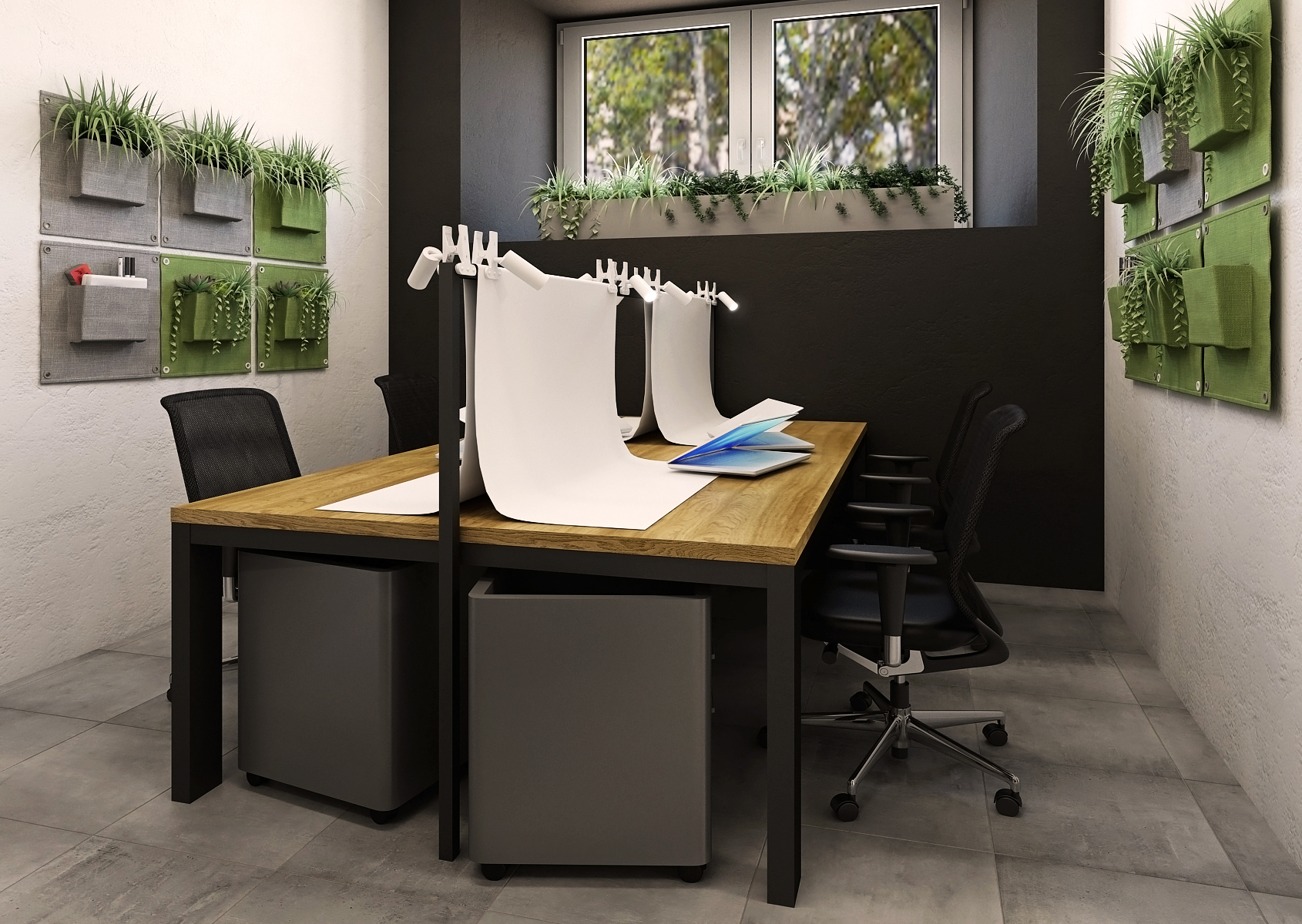 Prostory nabízí i jednací místnost za prosklenými dveřmi a pracovní stoly sloužící k focení a balení produktů.