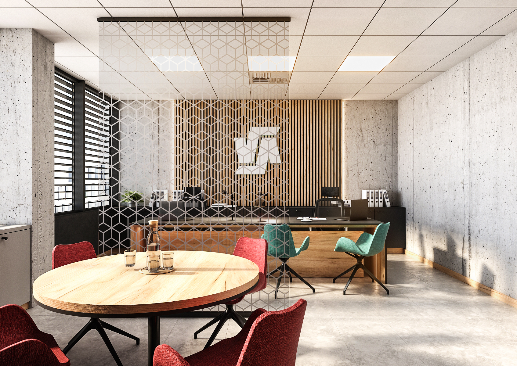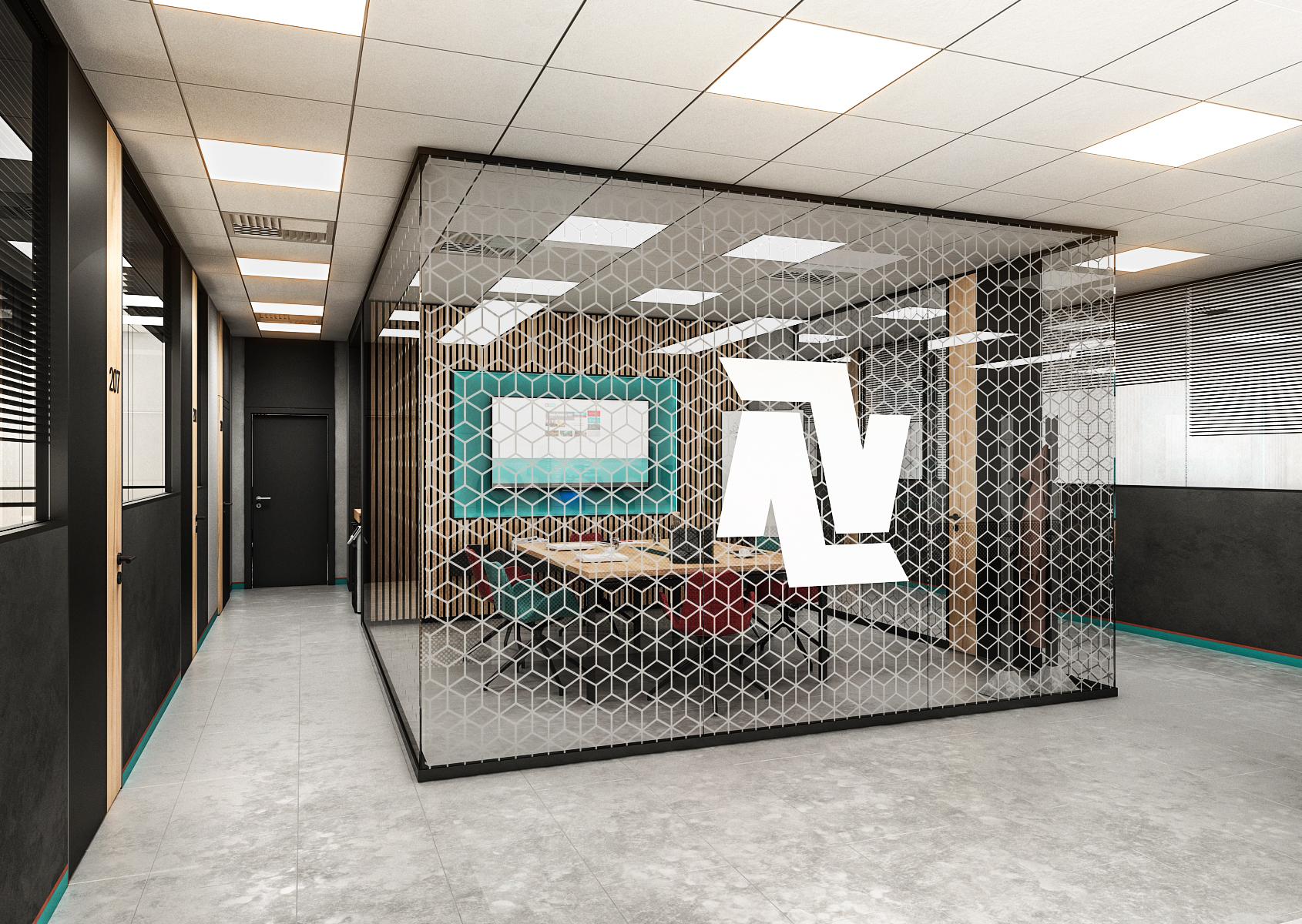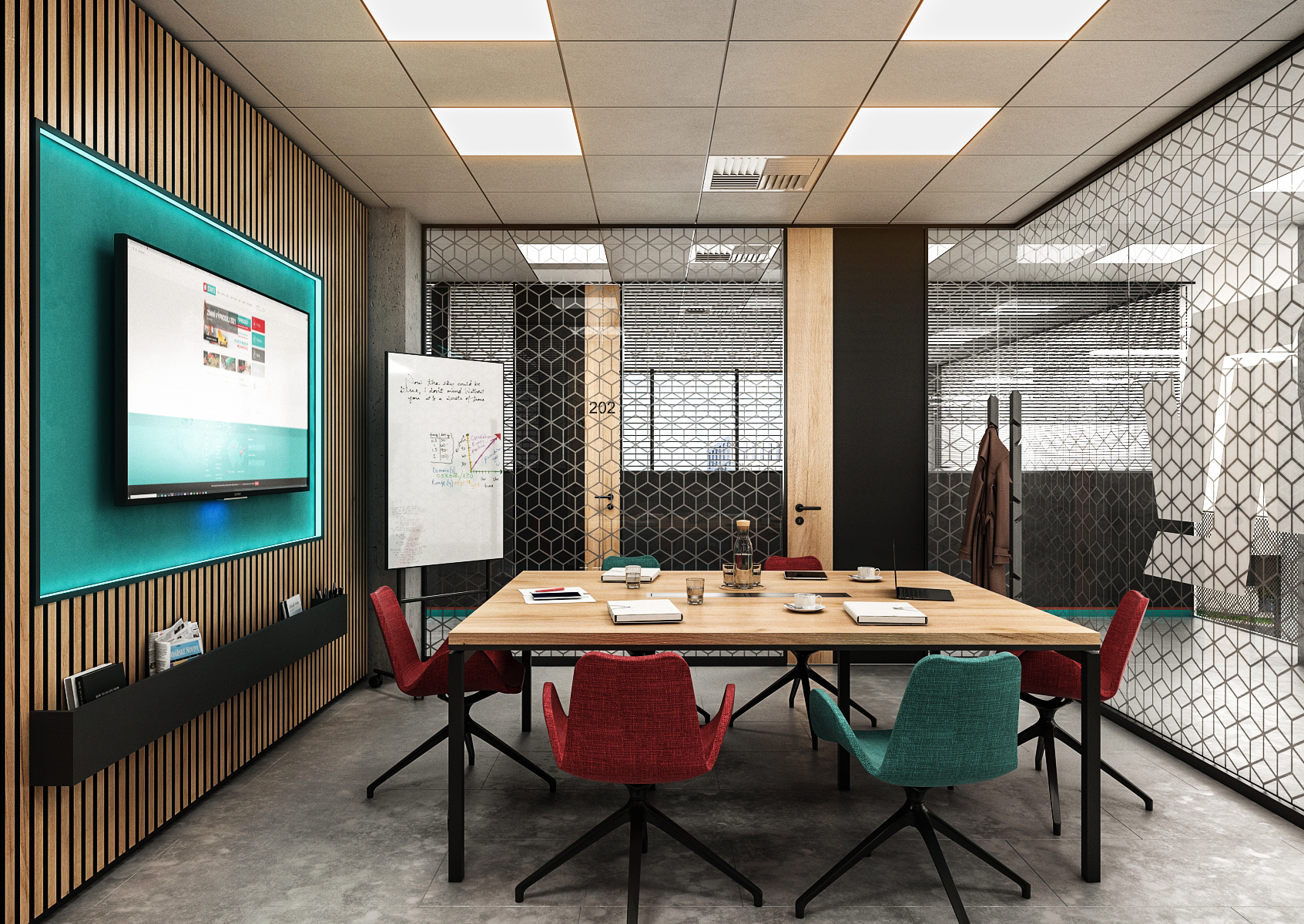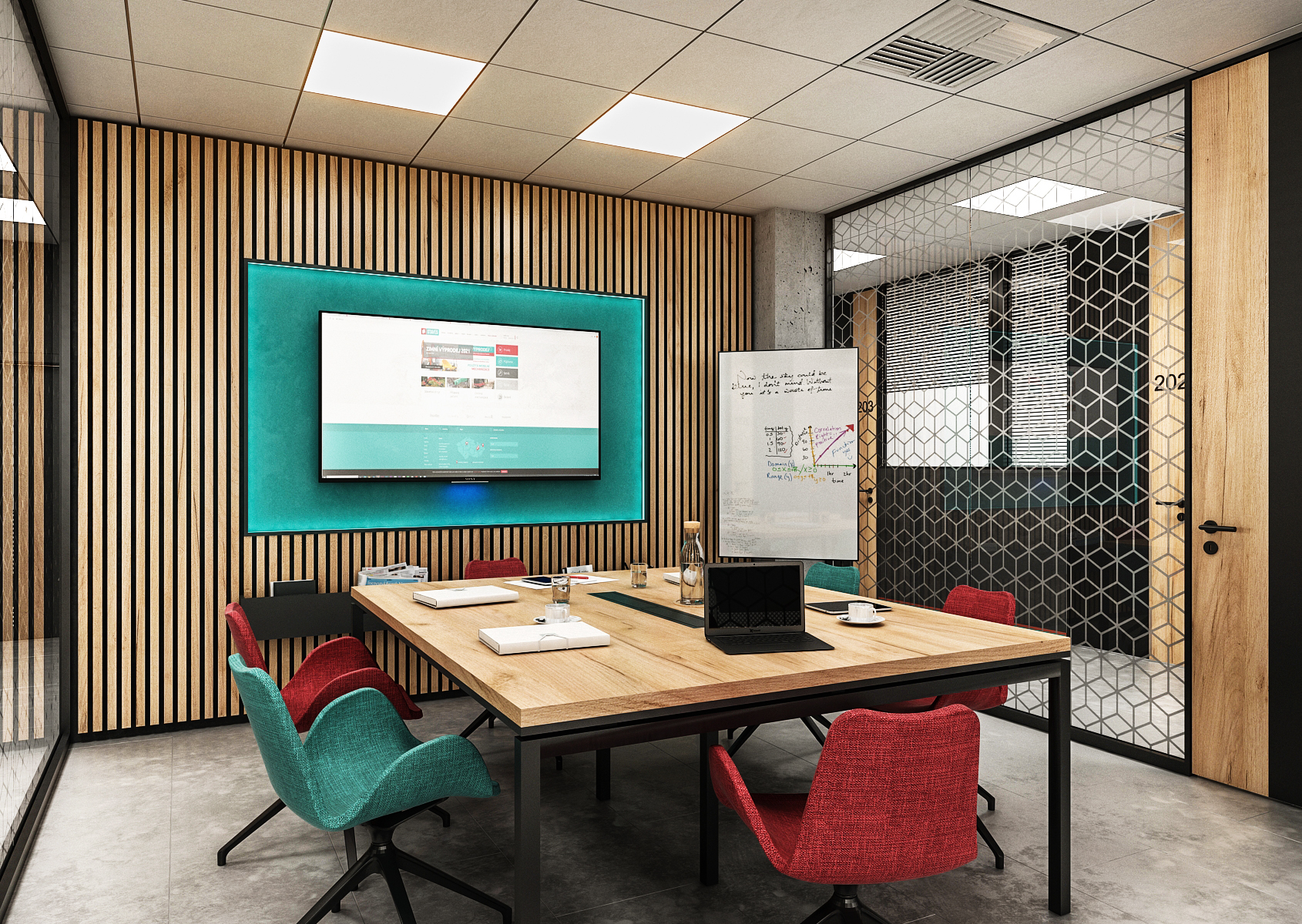 V zasedací místnosti je využito akustických lamelových obkladů a skleněných oddělovačů se vzorem, na které je umístěno logo. Křesílka u jednacího stolu jsou opět v barvách firmy, stejně tak i pozadí za televizí.