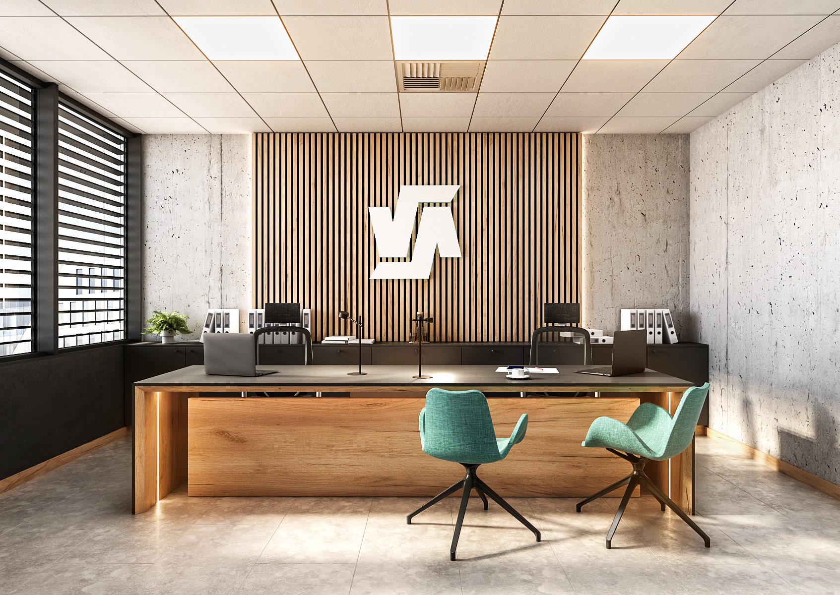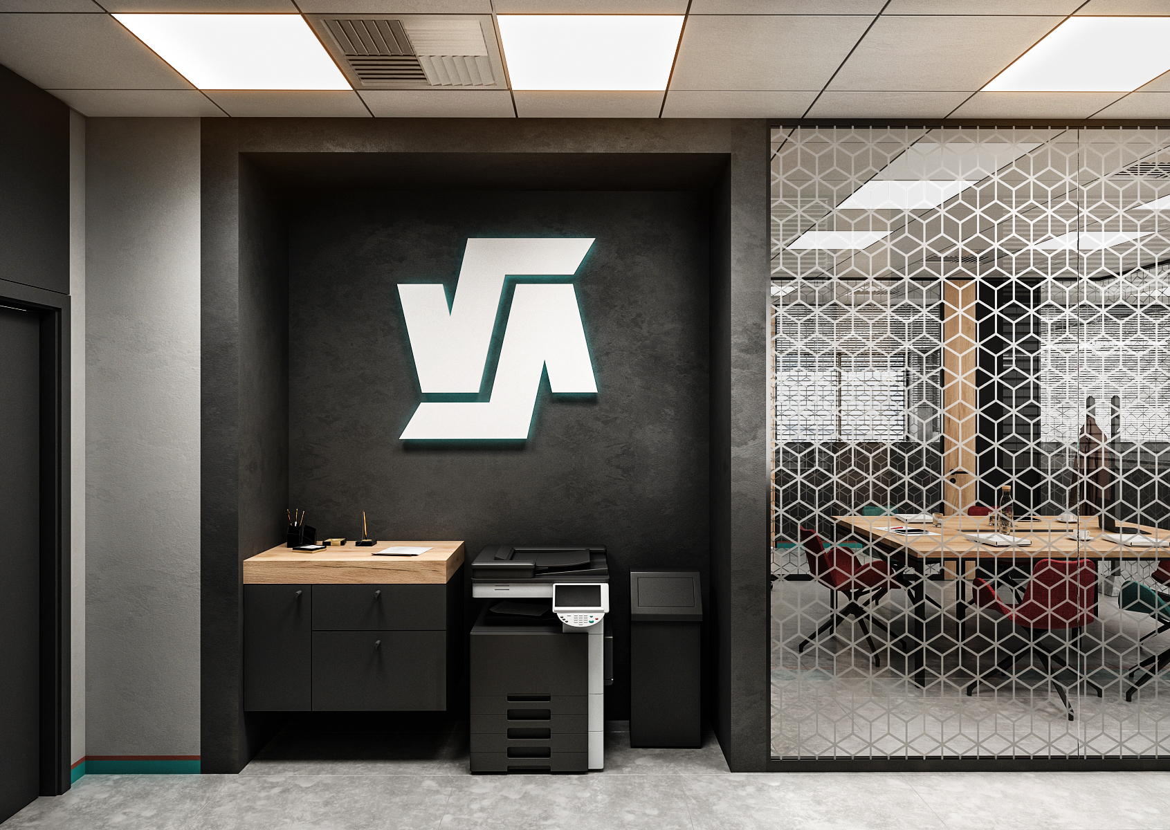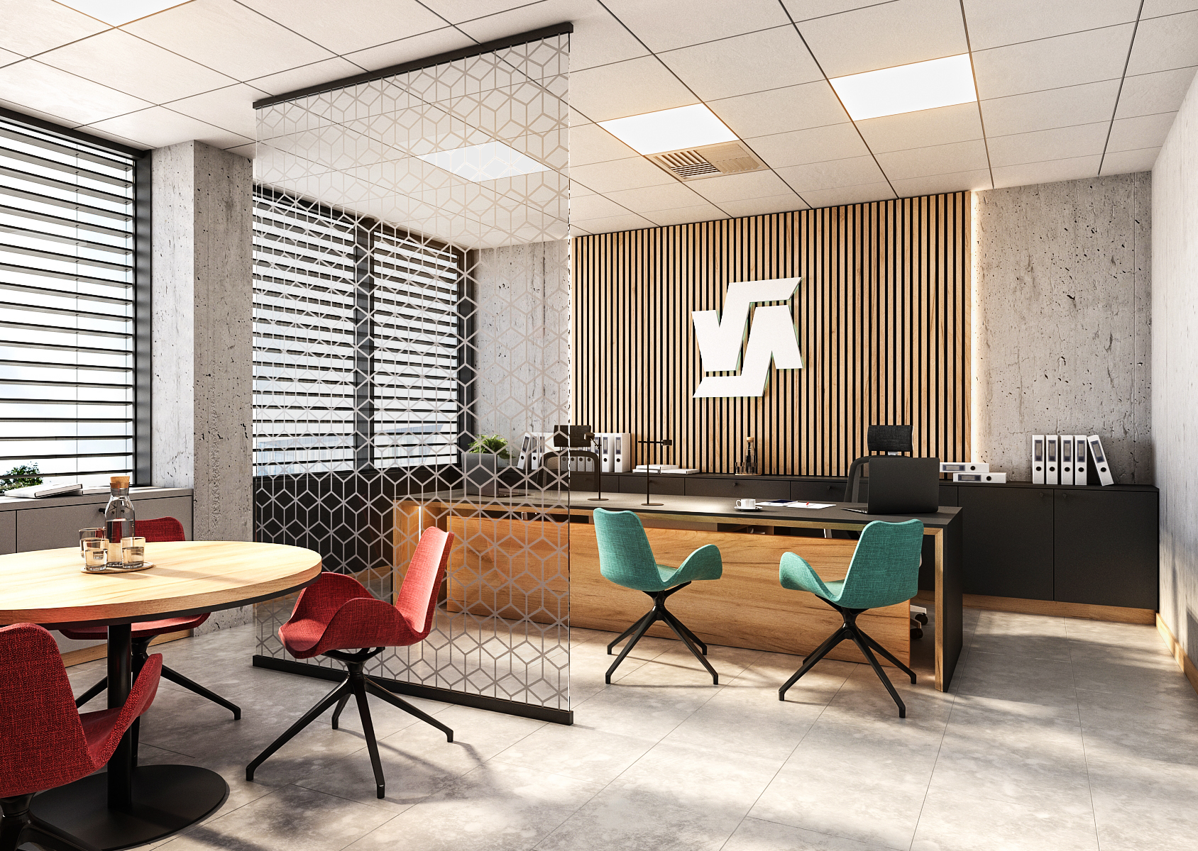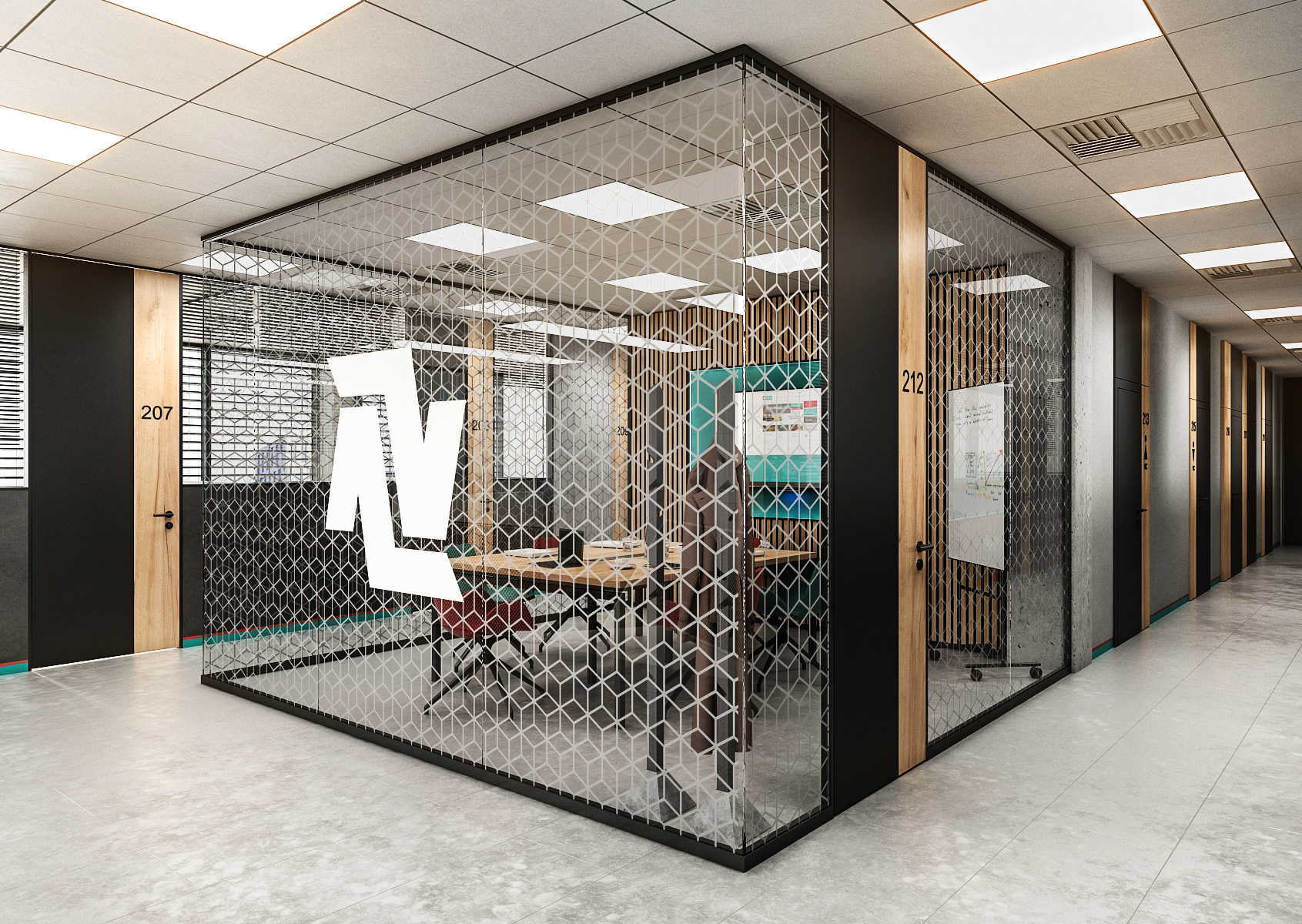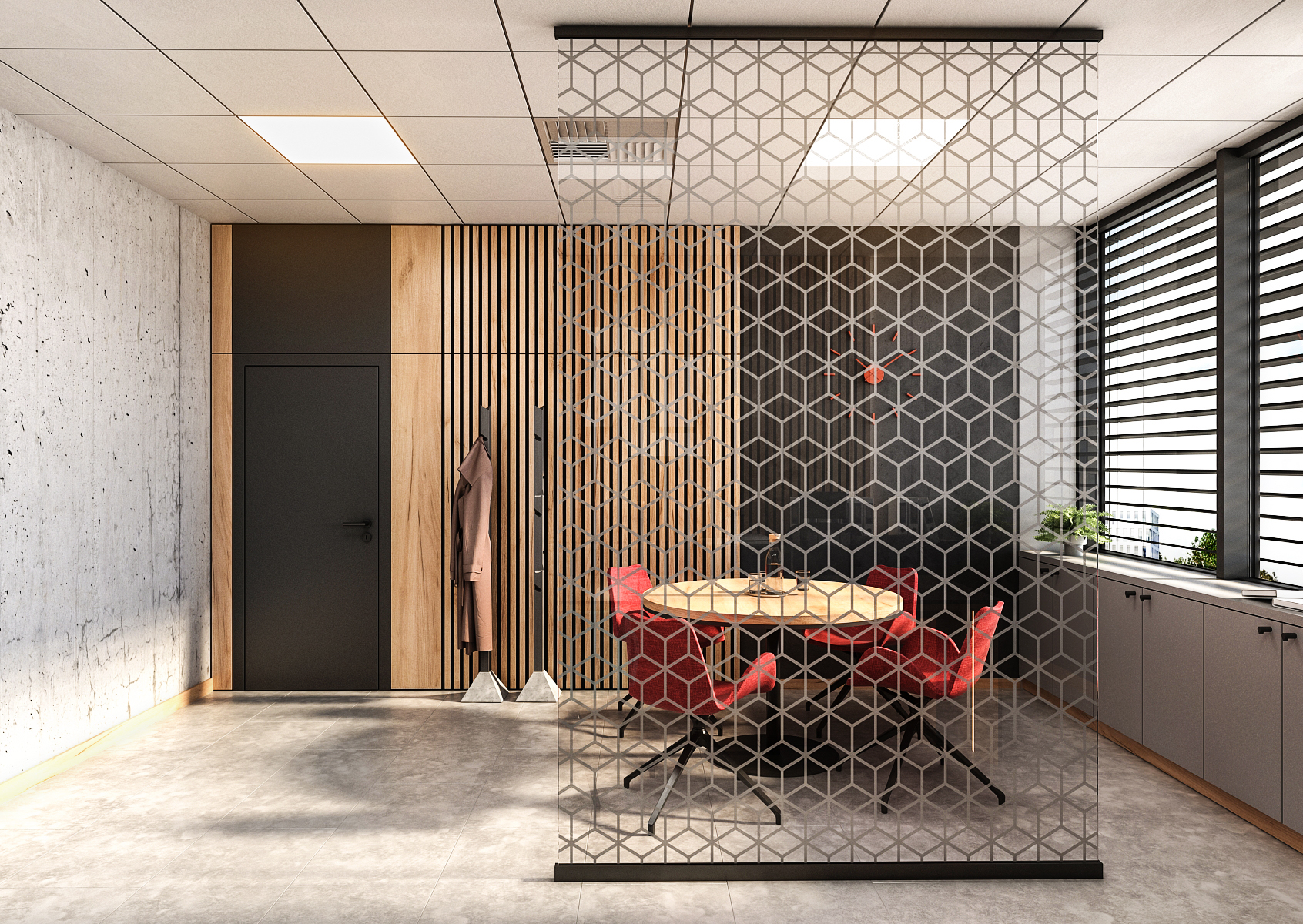 V zasedací místnosti je využito akustických lamelových obkladů a skleněných oddělovačů se vzorem, na které je umístěno logo. Křesílka u jednacího stolu jsou opět v barvách firmy, stejně tak i pozadí za televizí.