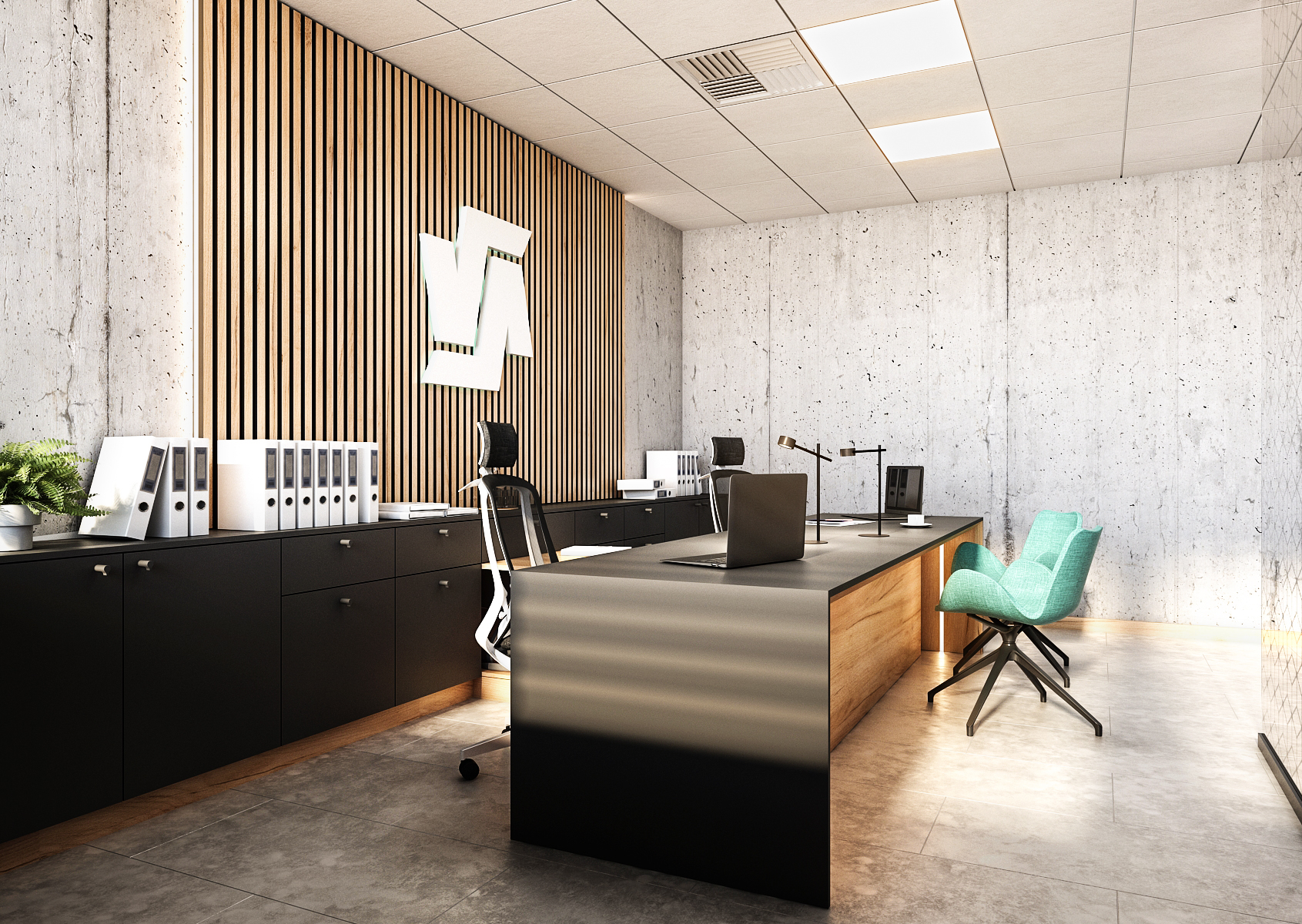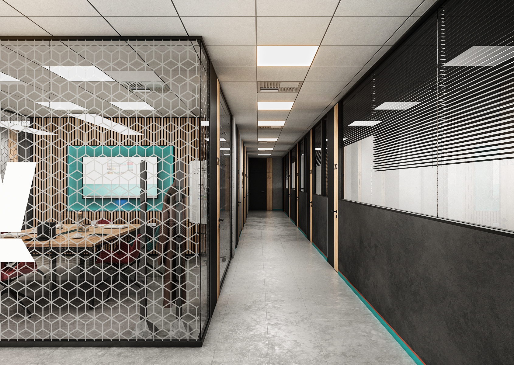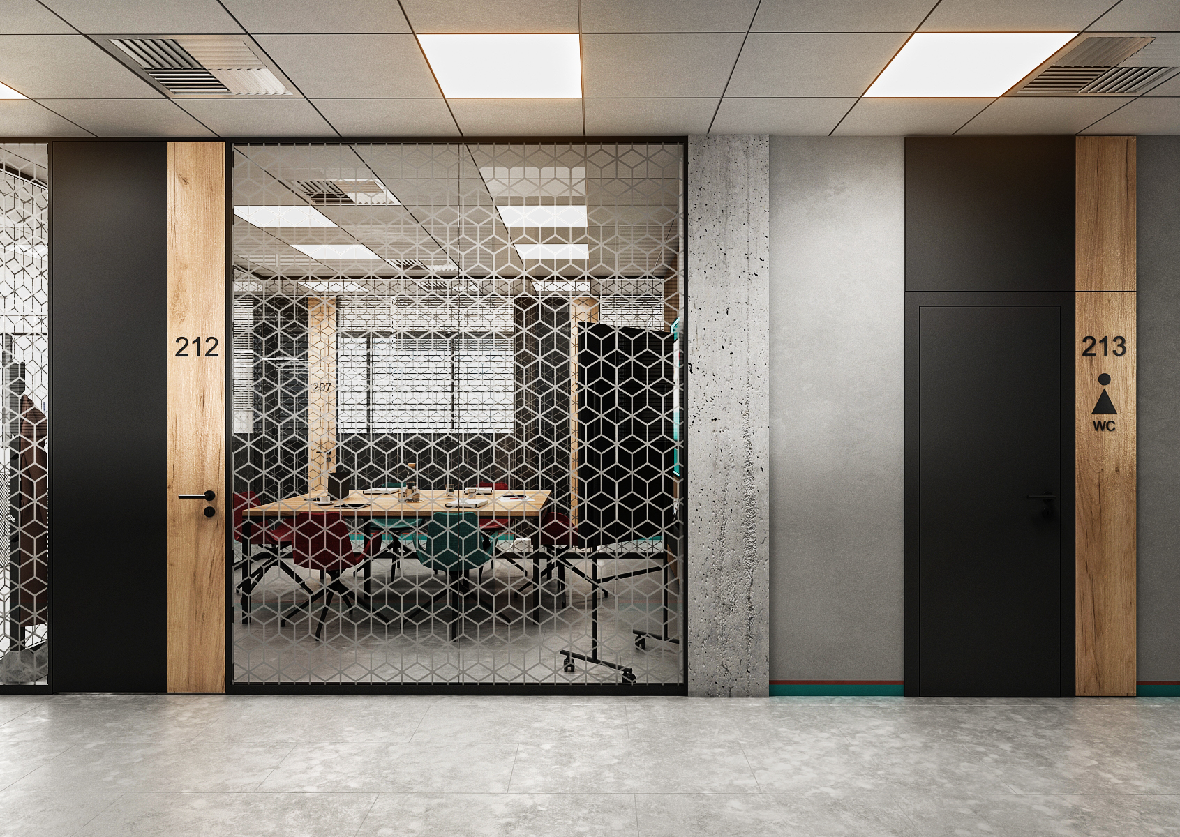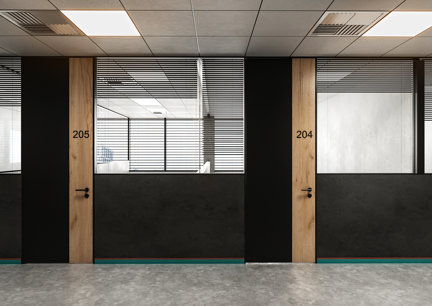 Chodby jsou laděny do matné černé v kombinaci s přírodním dubem, betonem a velkoformátovou dlažbou. Dveře s čísly místností se táhnou od země až ke stropu, ve výklenku s černou stěrkou je pak kromě loga umístěn i stolek s psacími potřebami a tiskárna.