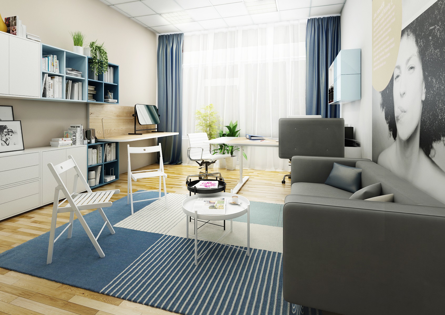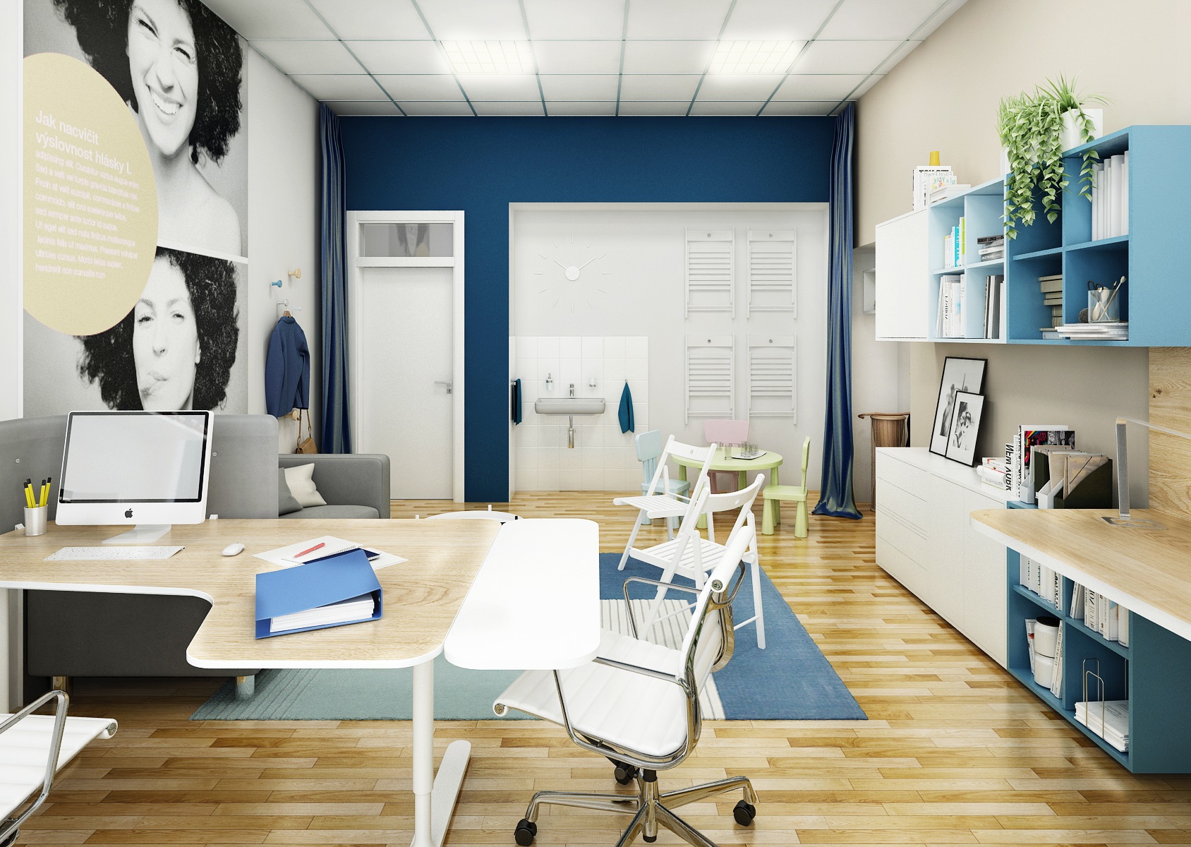 Při návrhu logopedická ordinace jsme typově vycházeli především z nábytku Ikea v bílém, modrém a dubovém provedení. Vybrali jsme pracovní stůl BEKANT, pro úložné prostory slouží sestavy skříněk EKET. Ze sedacího nábytku je zde například pohovka KLIPPAN, skládací židle TERJE a pro nejmenší židličky a stolek MAMMUT.