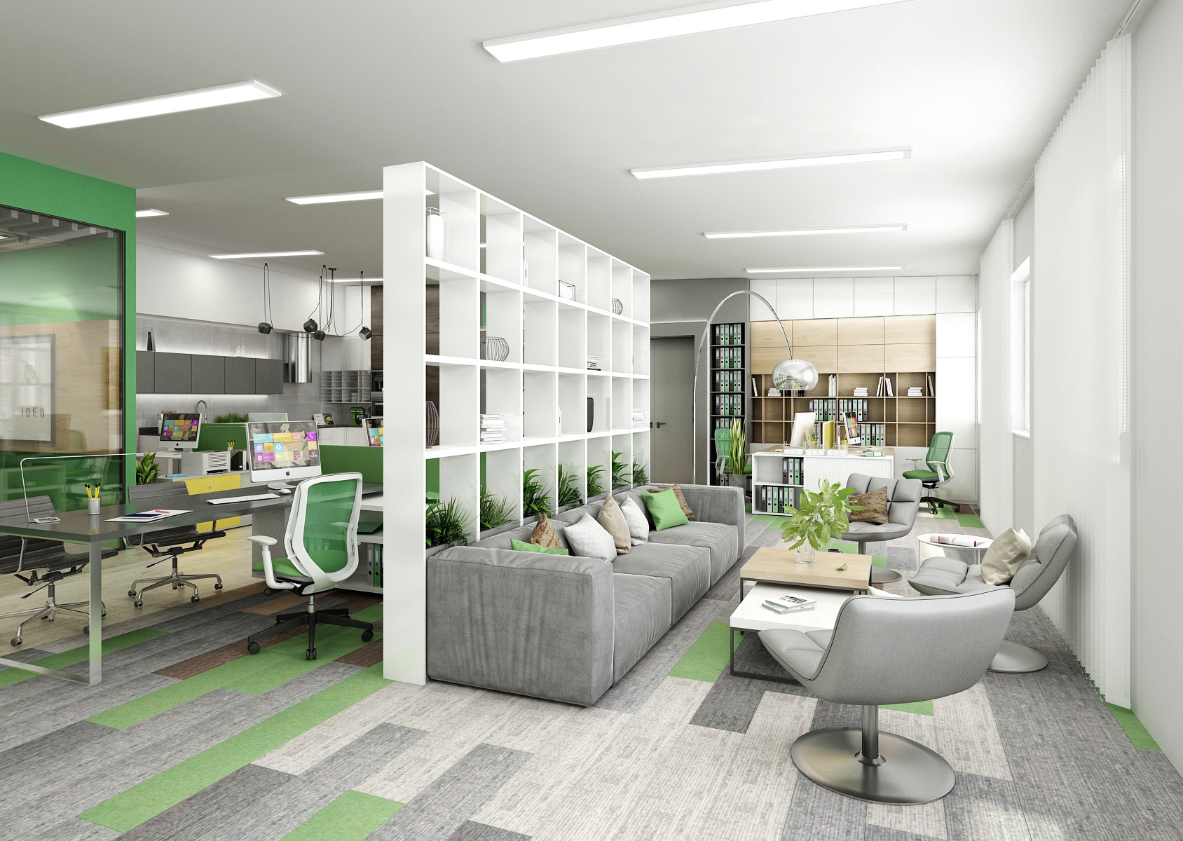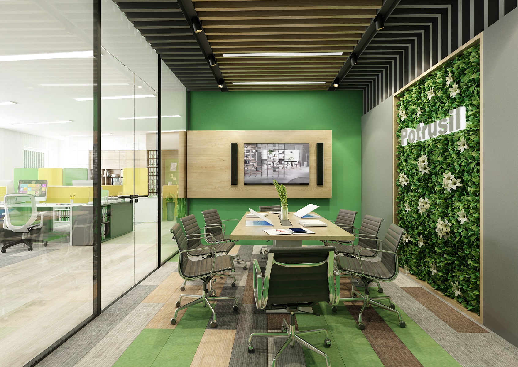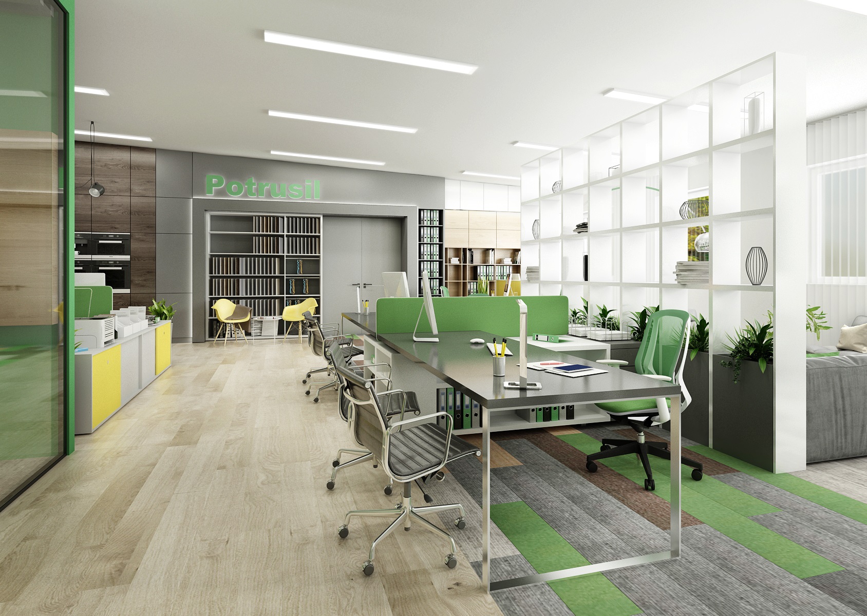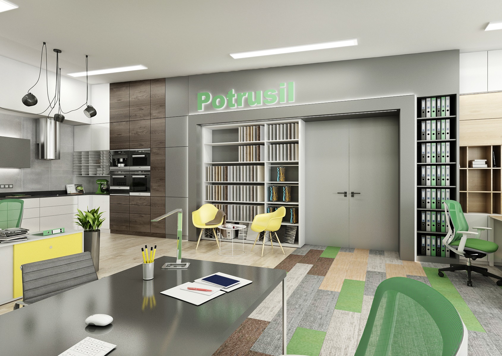 Prostor slouží jak k prezentaci nabízených služeb, produktů či materiálů, tak zároveň i kancelář nebo zasedací místnost pro zaměstnance, které tak přímo v areálu ukazují jejich kancelářské řady. V návrhu interiéru jsme využili kromě neutrální šedé, bílé a dřeva hlavně firemní zelenou barvu, která se objevuje třeba na výmalbě, čalounění nebo i částí kobercových pásů.