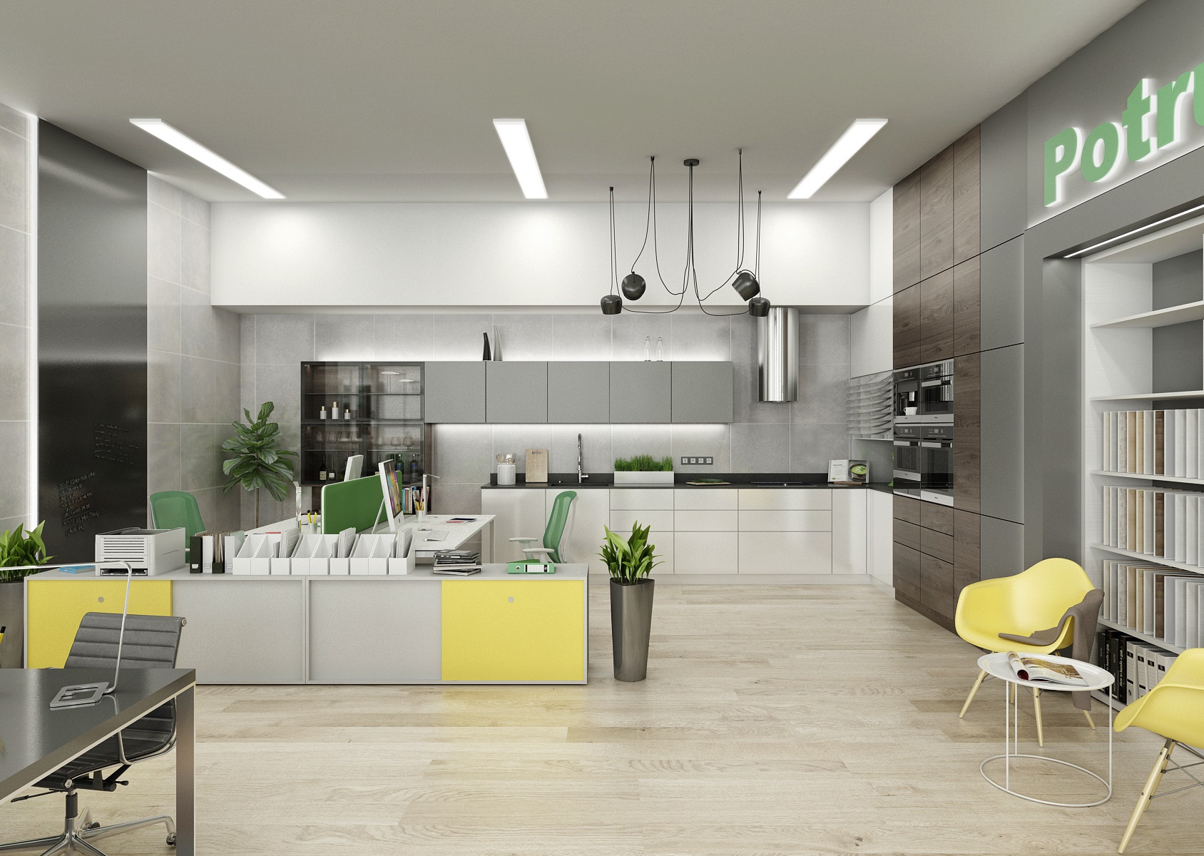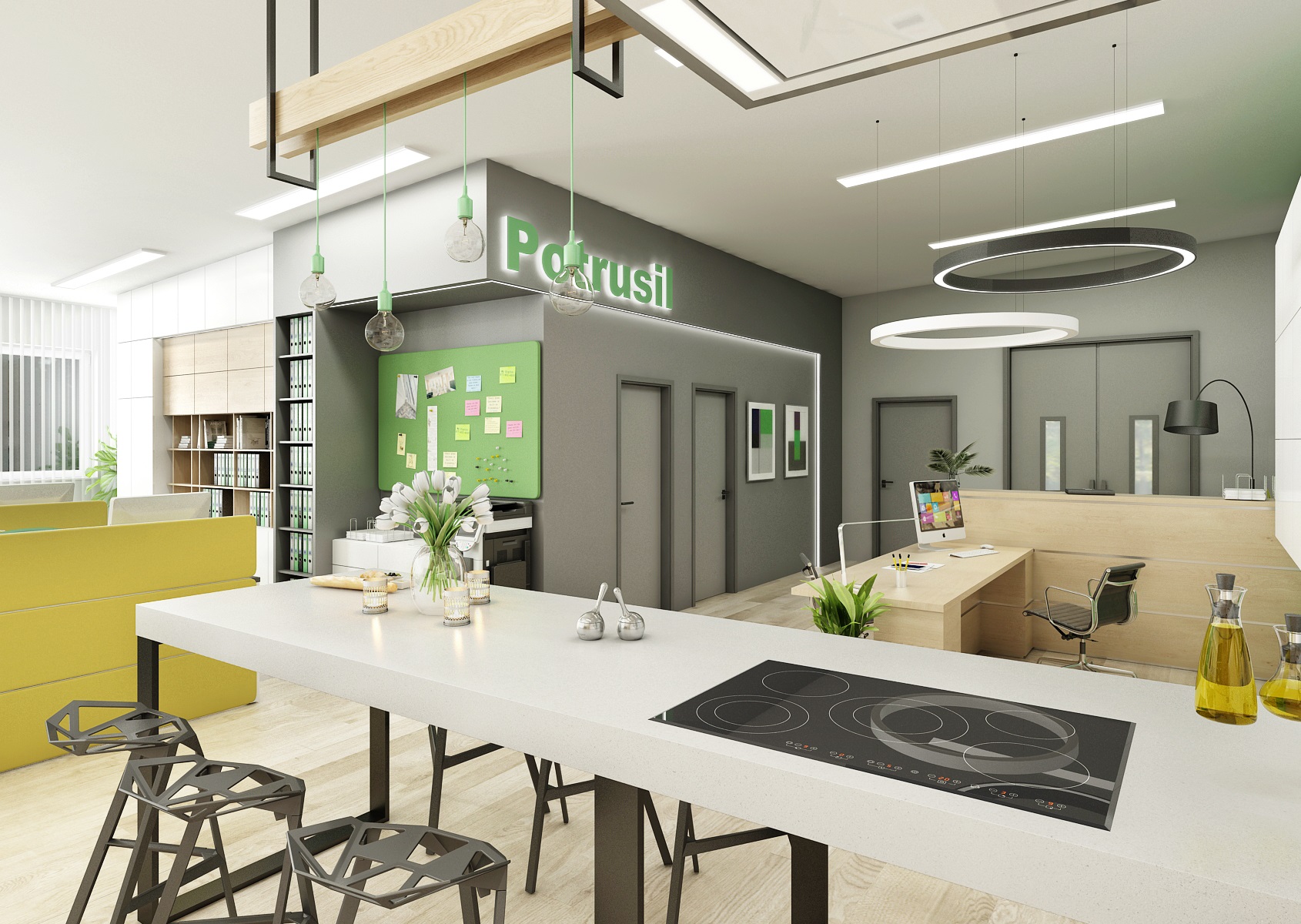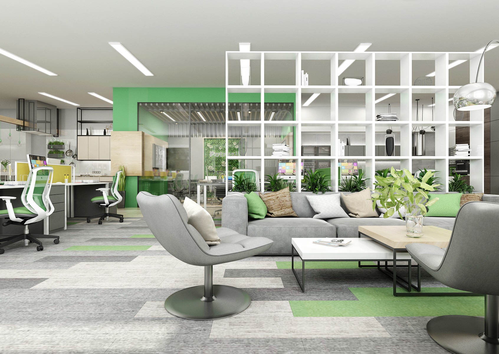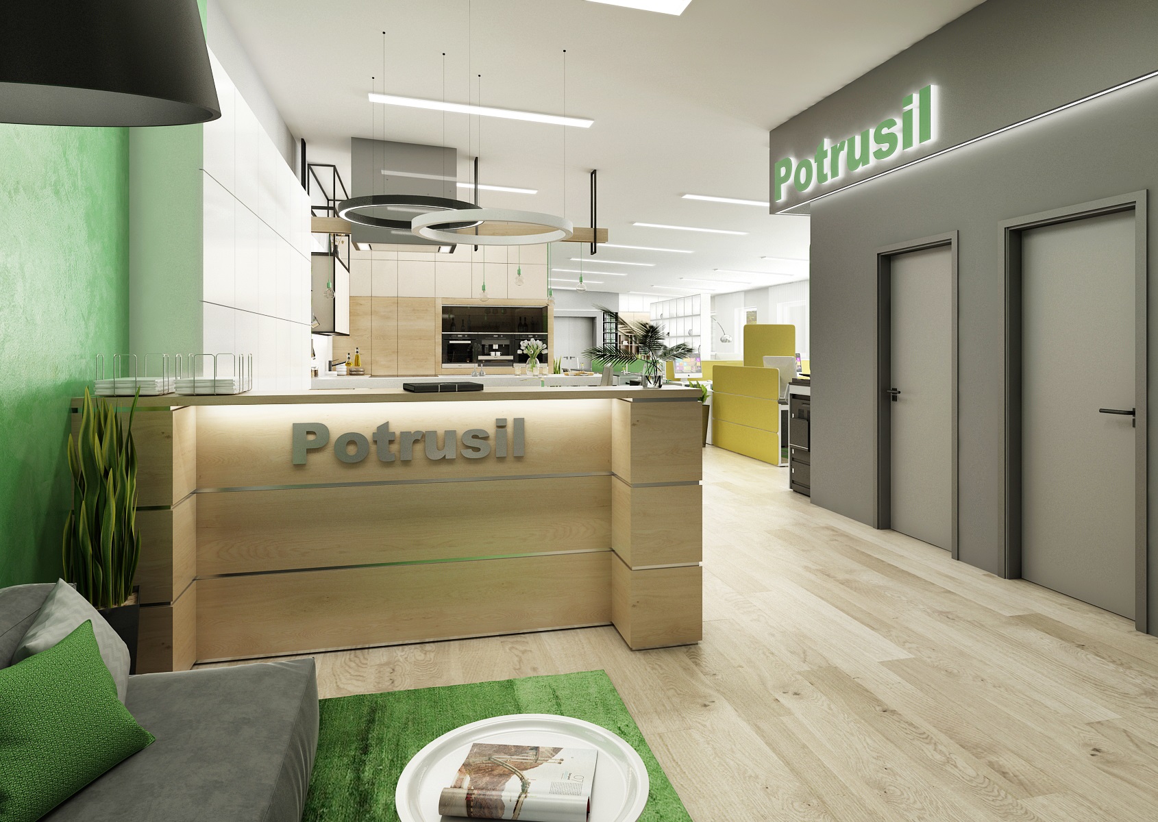 Prostor slouží jak k prezentaci nabízených služeb, produktů či materiálů, tak zároveň i kancelář nebo zasedací místnost pro zaměstnance, které tak přímo v areálu ukazují jejich kancelářské řady. V návrhu interiéru jsme využili kromě neutrální šedé, bílé a dřeva hlavně firemní zelenou barvu, která se objevuje třeba na výmalbě, čalounění nebo i částí kobercových pásů.