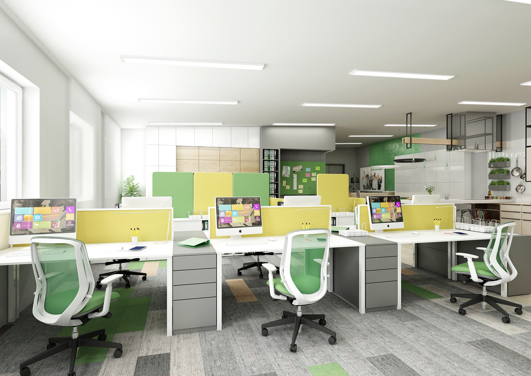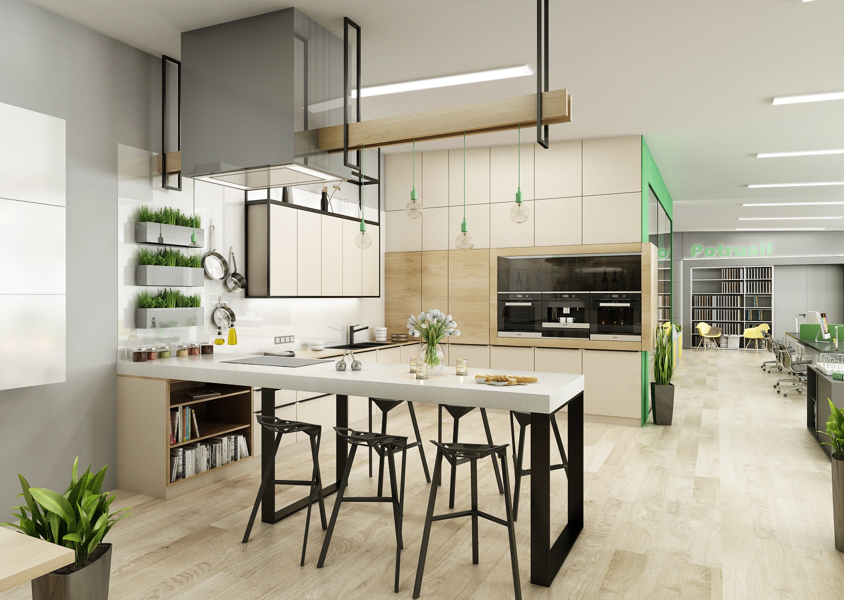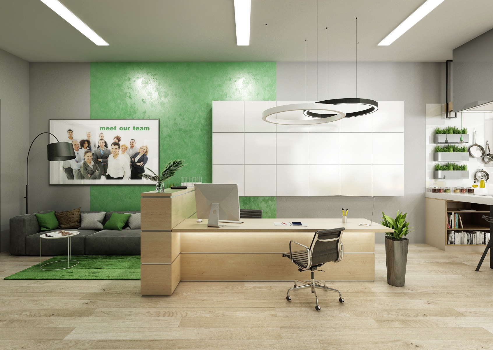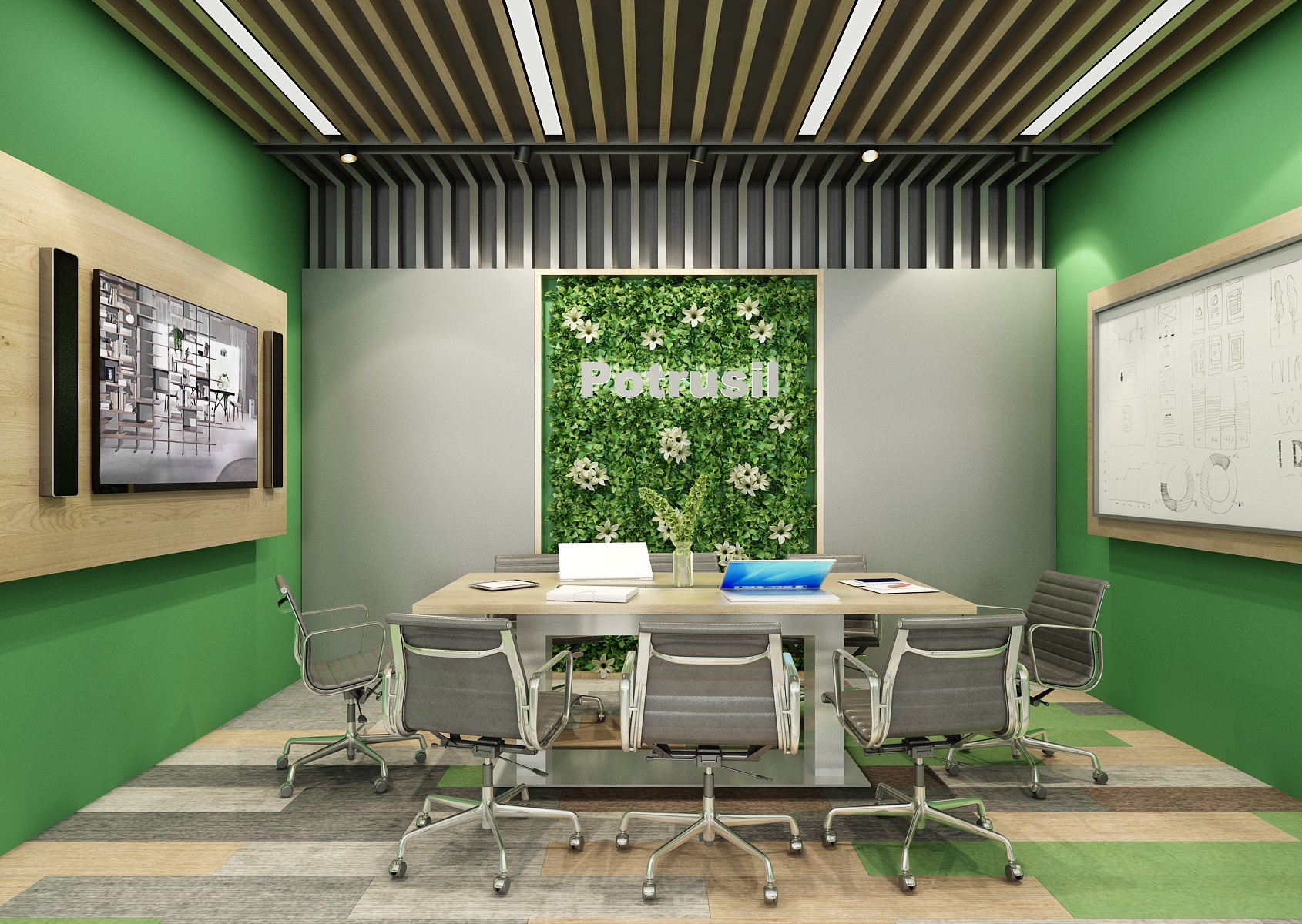Prostor slouží jak k prezentaci nabízených služeb, produktů či materiálů, tak zároveň i kancelář nebo zasedací místnost pro zaměstnance, které tak přímo v areálu ukazují jejich kancelářské řady. V návrhu interiéru jsme využili kromě neutrální šedé, bílé a dřeva hlavně firemní zelenou barvu, která se objevuje třeba na výmalbě, čalounění nebo i částí kobercových pásů.