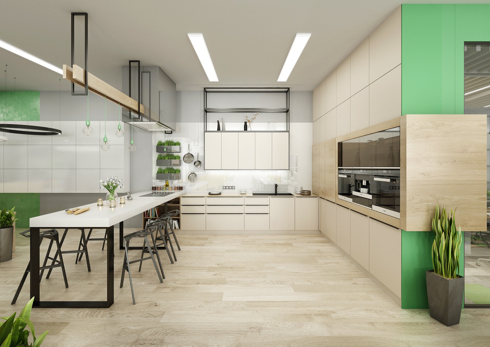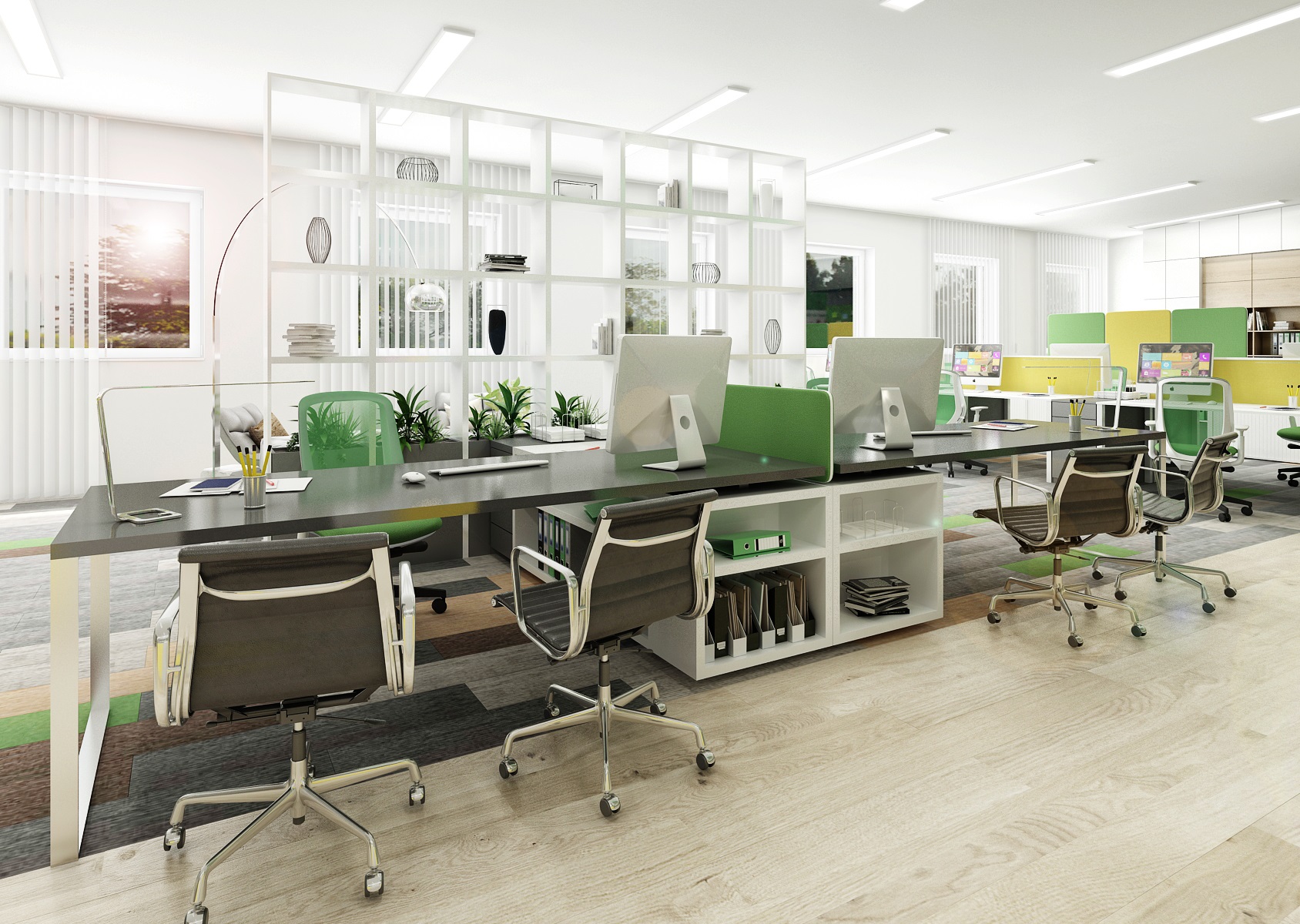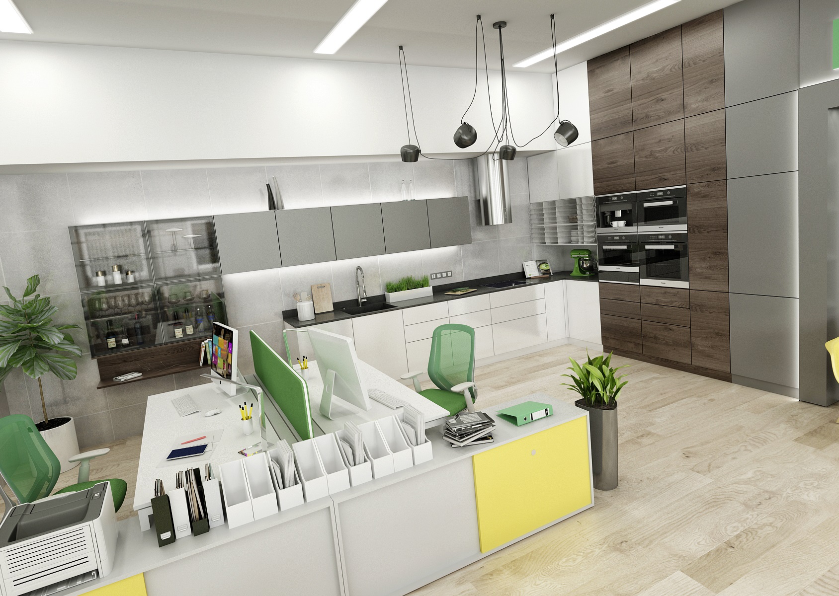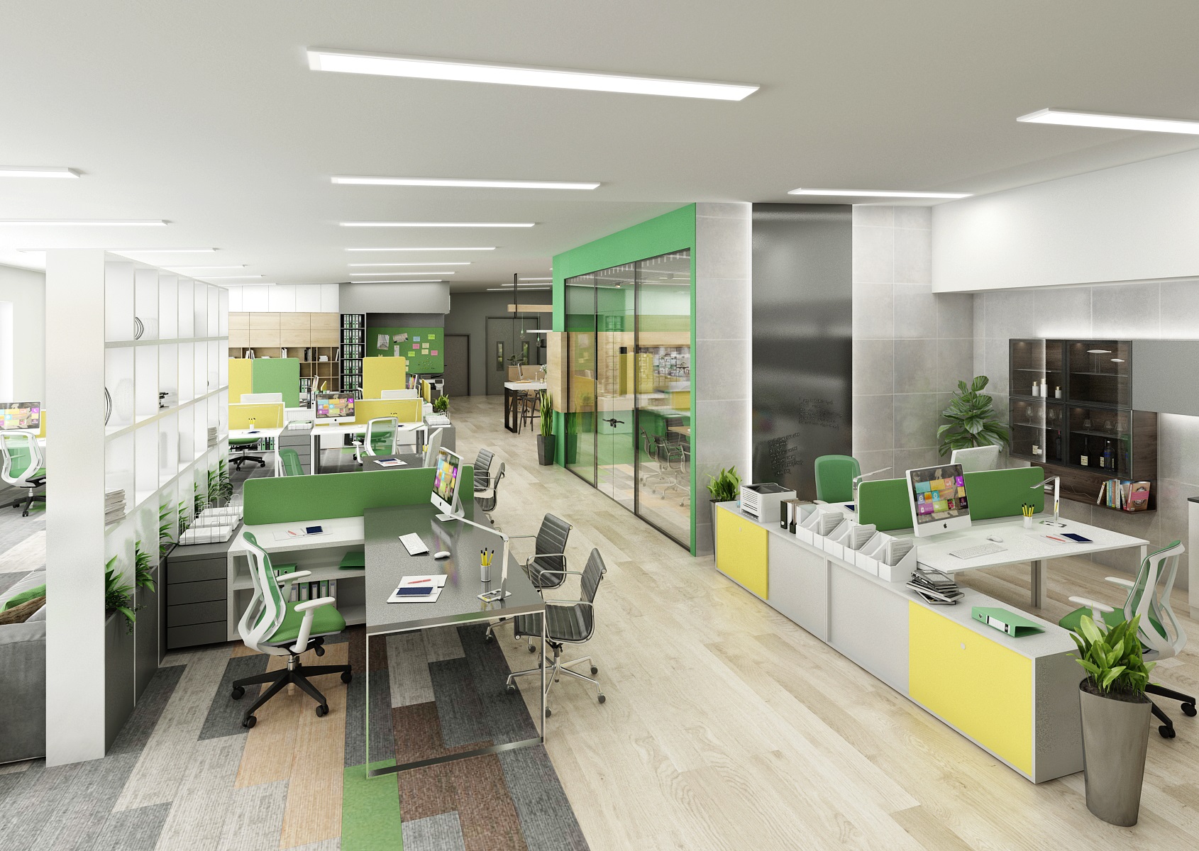 Prostor slouží jak k prezentaci nabízených služeb, produktů či materiálů, tak zároveň i kancelář nebo zasedací místnost pro zaměstnance, které tak přímo v areálu ukazují jejich kancelářské řady. V návrhu interiéru jsme využili kromě neutrální šedé, bílé a dřeva hlavně firemní zelenou barvu, která se objevuje třeba na výmalbě, čalounění nebo i částí kobercových pásů.