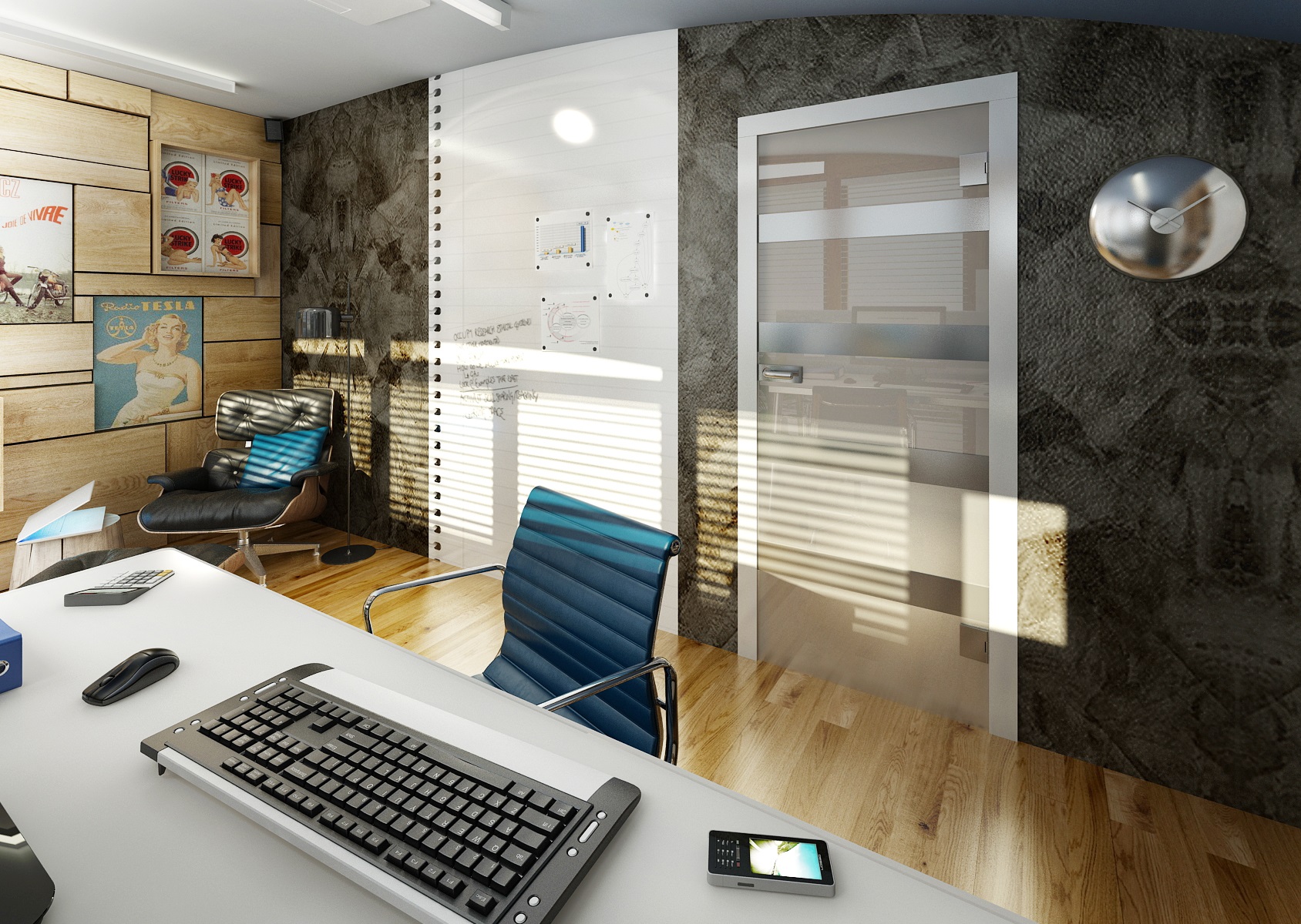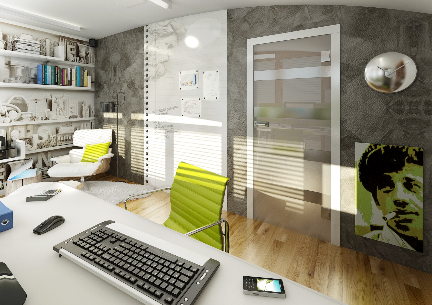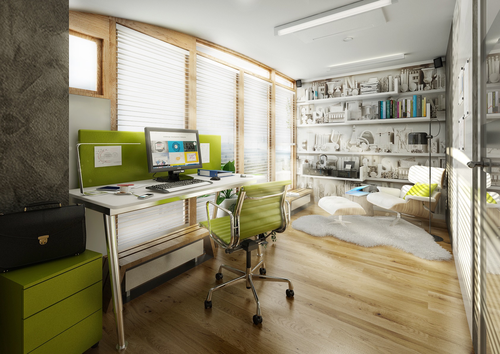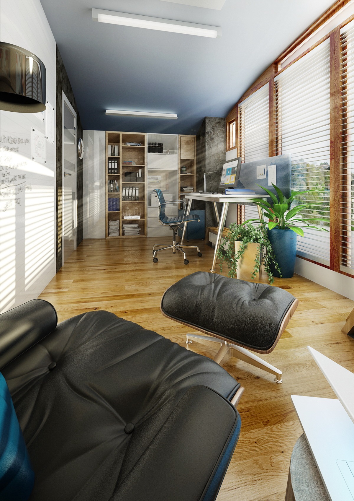 Jedna pracovna pro majitele domu a dvě její varianty provedení. Pracovně dominují francouzská okna, která poskytují výhled do okolí a dostatek přirozeného světla. Pracovní stůl má jednoduchý subtilní design – nerezová podnož a tenká bílá deska. Součástí místnosti je knihovna a křeslo s podnožkou ke čtení či relaxaci. Stěny jsou dokončeny dekorační stěrkou, dle varianty obrazovou tapetou nebo dubovým obkladem. Na psaní poznámek je pás stěny upravený bílou magnetickou tabulovou barvou.