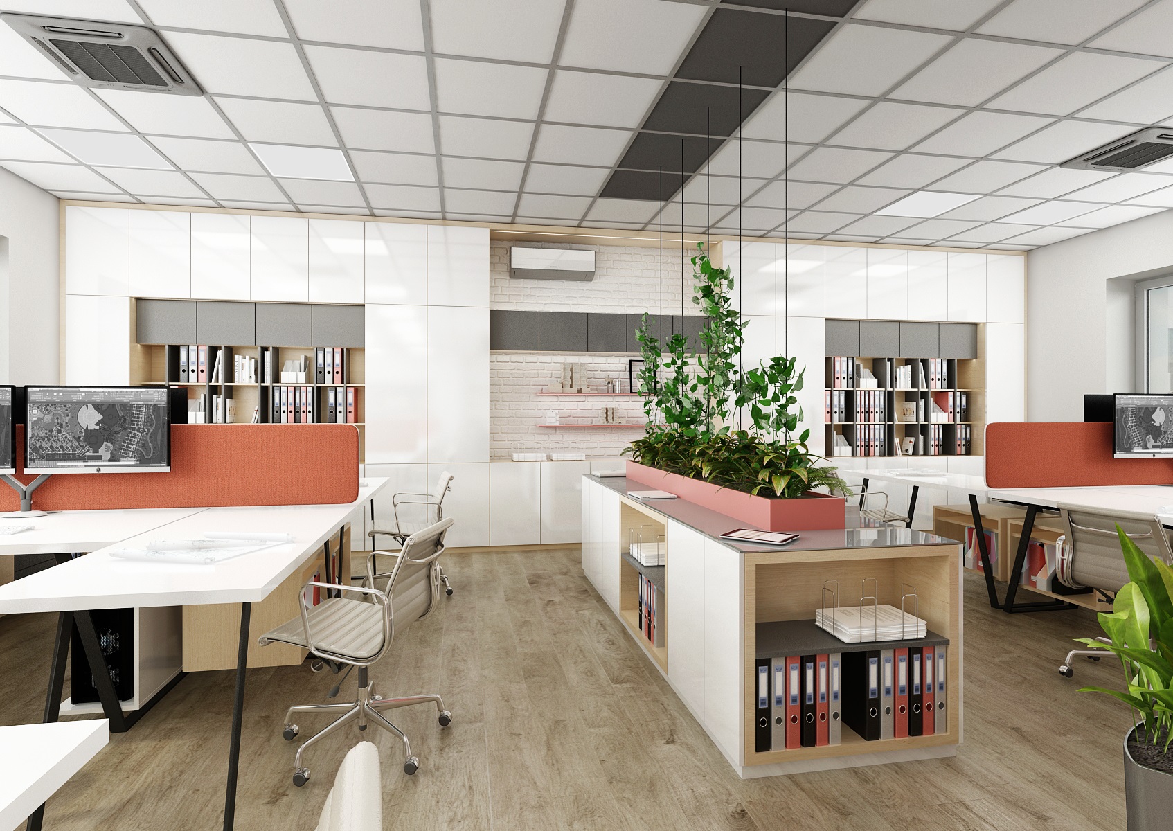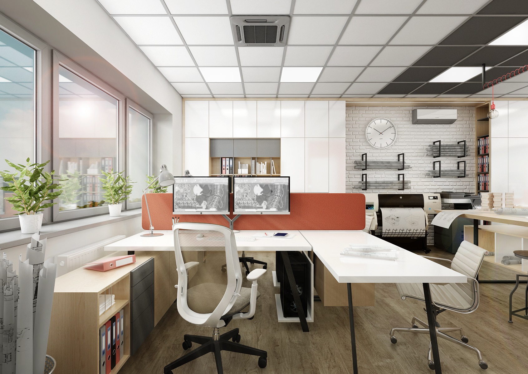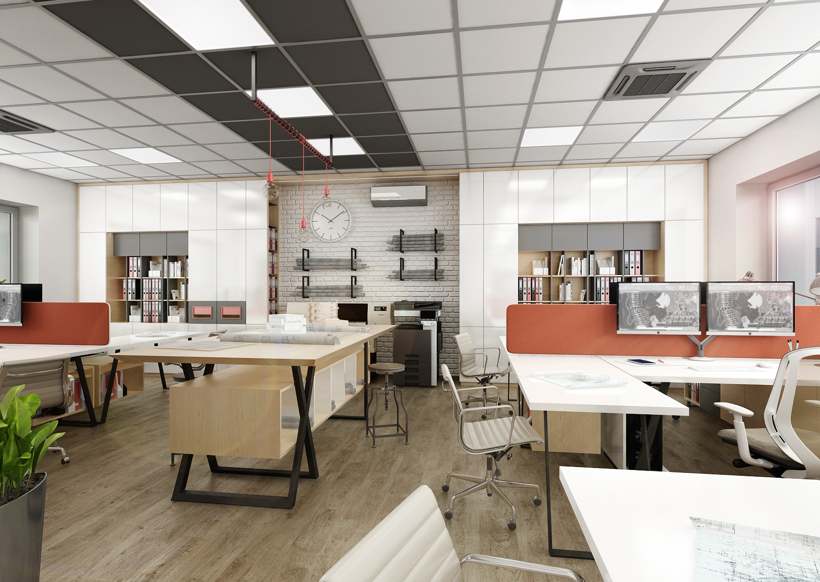 Kancelář stavební firmy je vybavena atypickým nábytkem v polo-industriálním stylu. Kombinace nábytku v bílé, šedé a dekoru dubu z LTD, černé kovové podnože, konzolové police či rampy na závěsná svítidla a bílé cihlové obklady klinker.