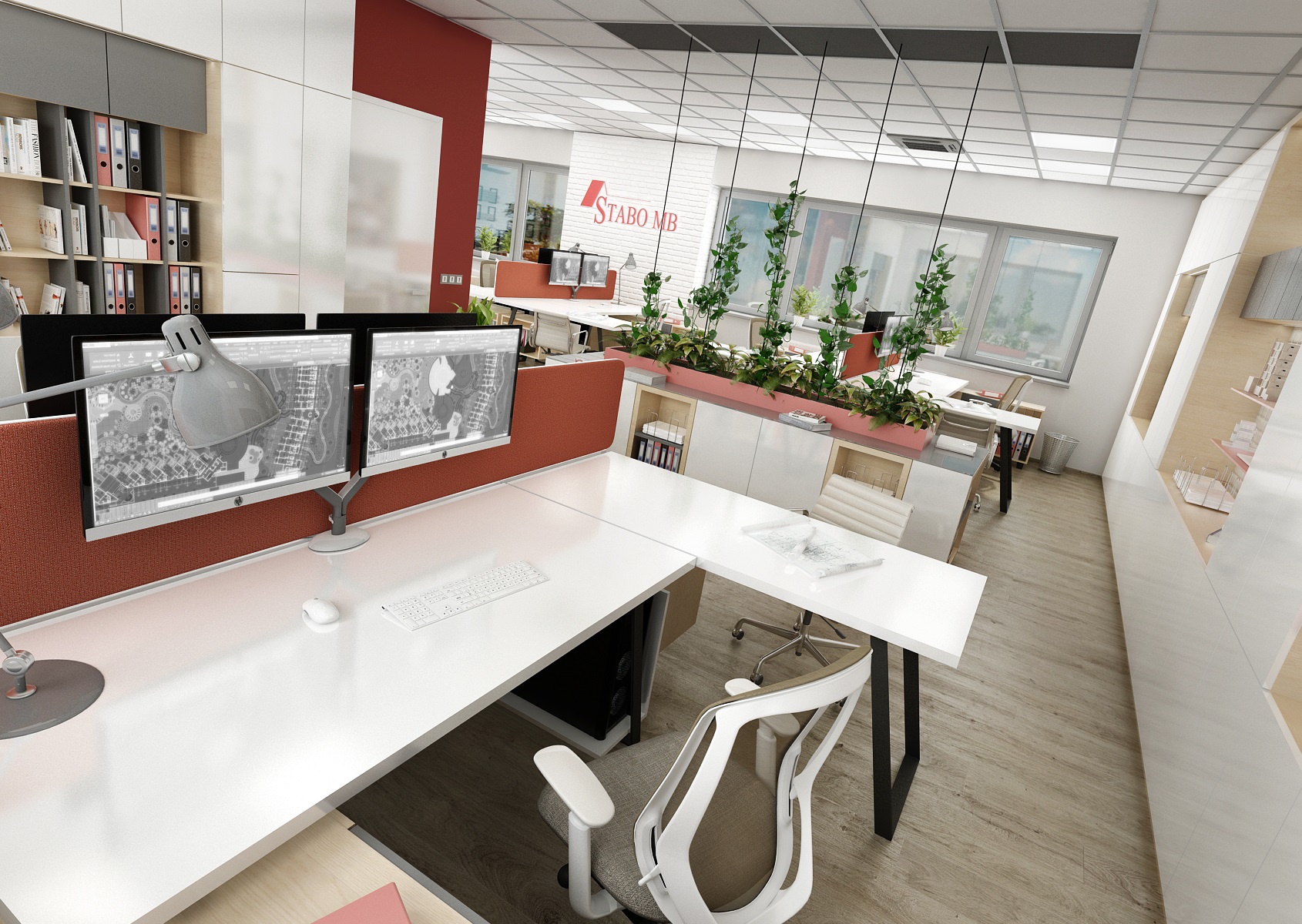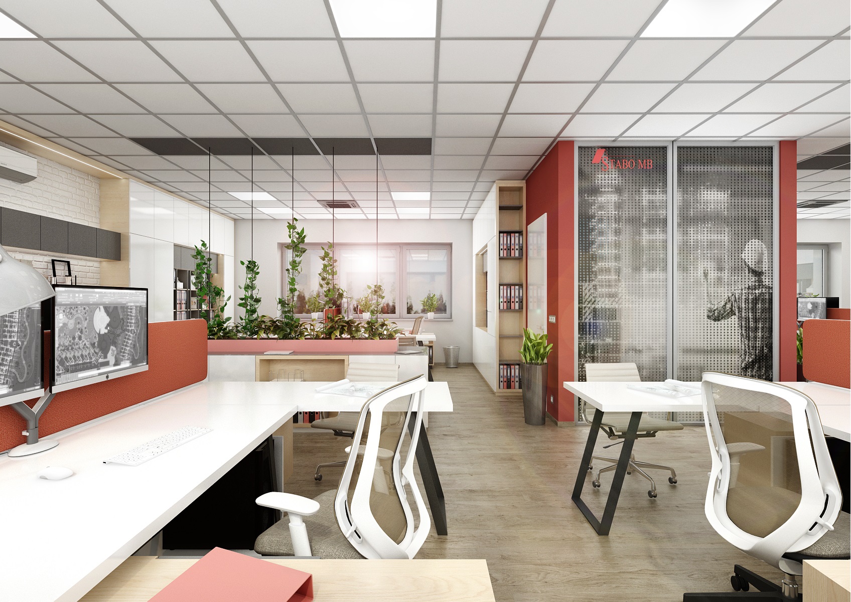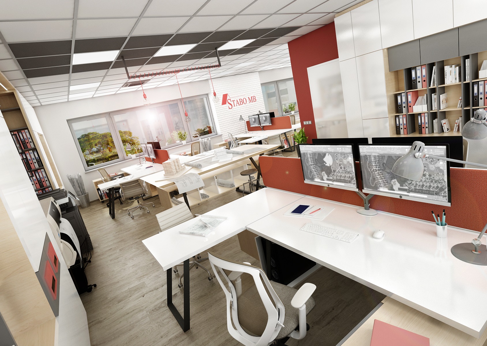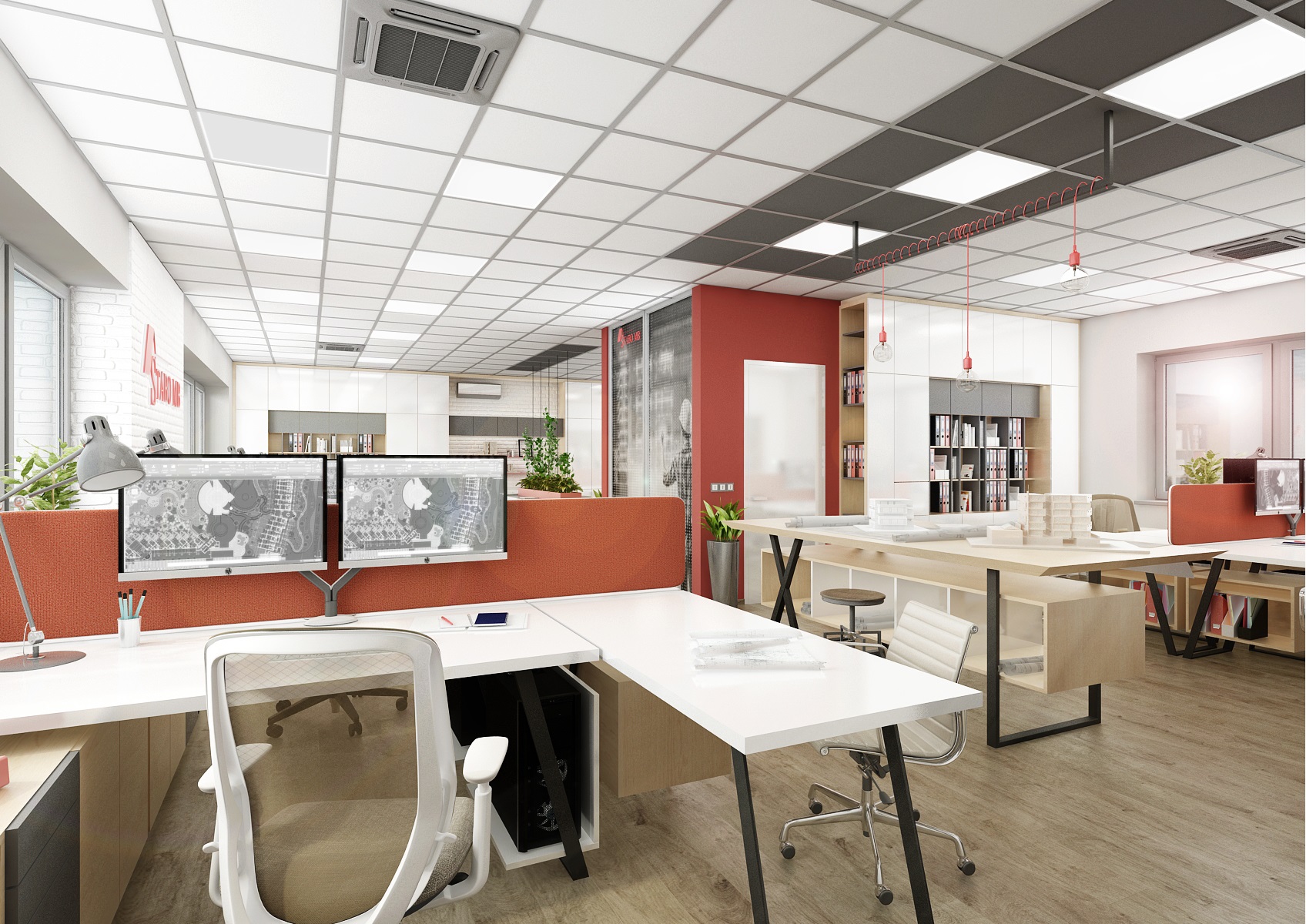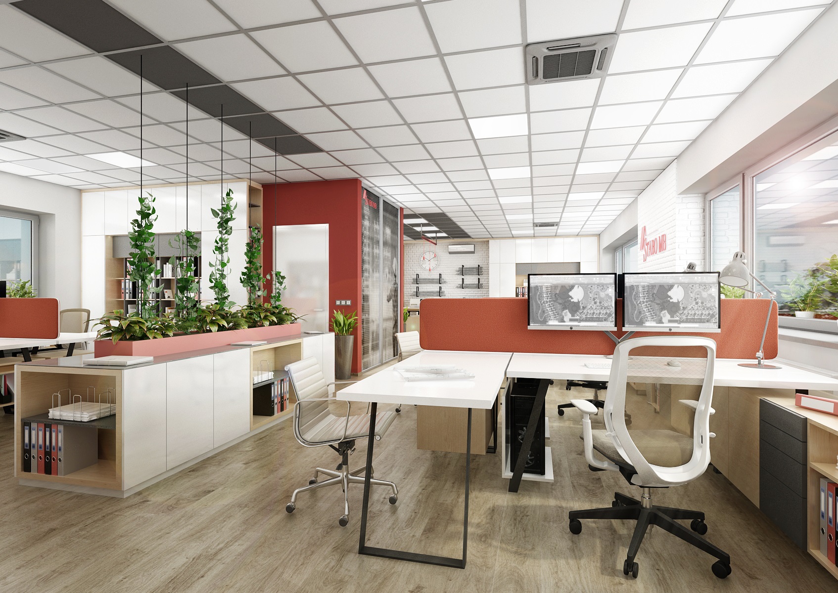 Firemní červená barevnost se odráží na části výmalby stěn, barevnosti paravánů a závěsných žárovkových svítidel E27.