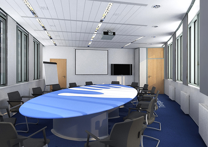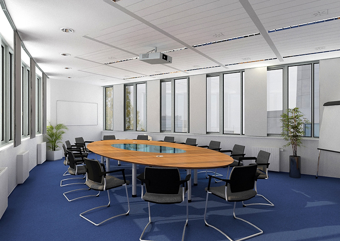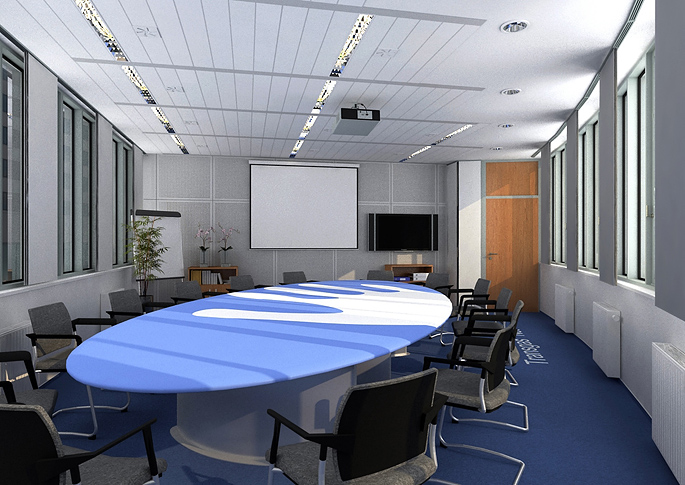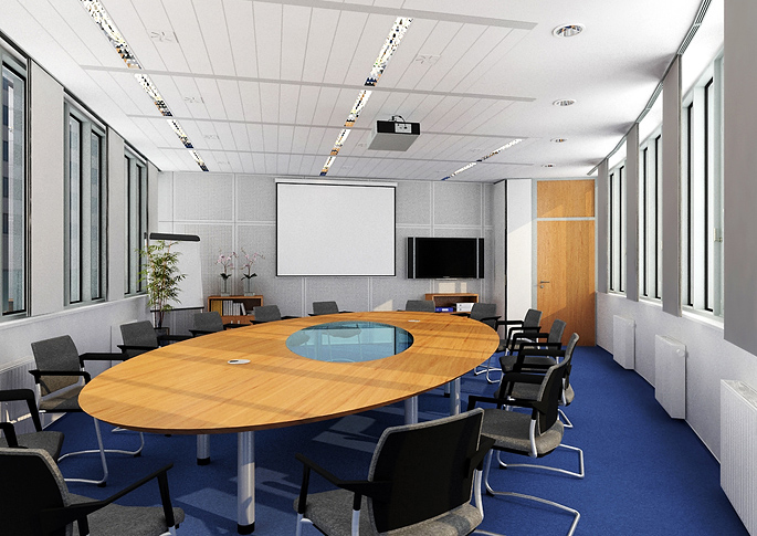Interiér zasedací místnosti s oválným stolem