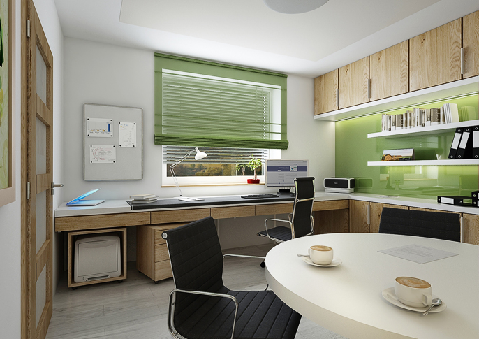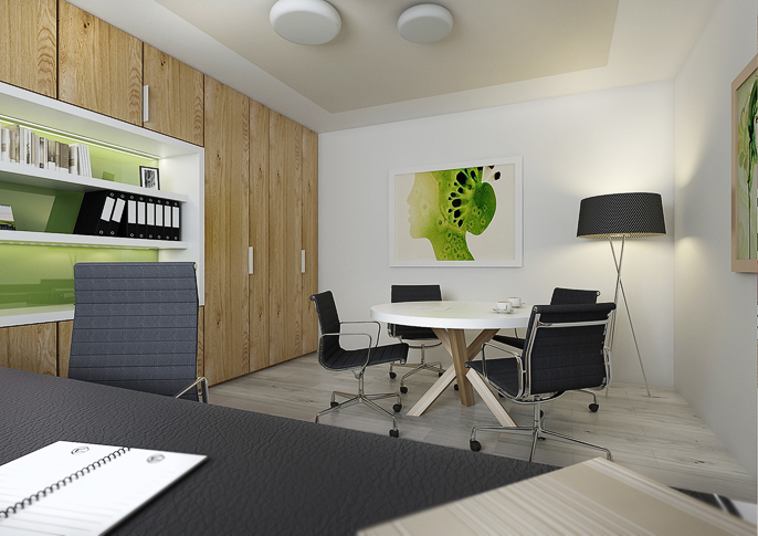 Soukromá pracovna pro účetní je řešena vysoce účelně, ale je myšleno i na estetický dojem, aby se zákazníci při konzultacích cítili dobře. Hlavním materiálem je dubová dýha v přírodním odstínu, která zatepluje celý interiér. Je zde v kombinaci s bílými prvky. Obě barevné varianty jsou navrženy ve stejném stylu. První varianta kombinuje přírodní materiál s růžovou barvou, druhá naopak se svěží zelenou.