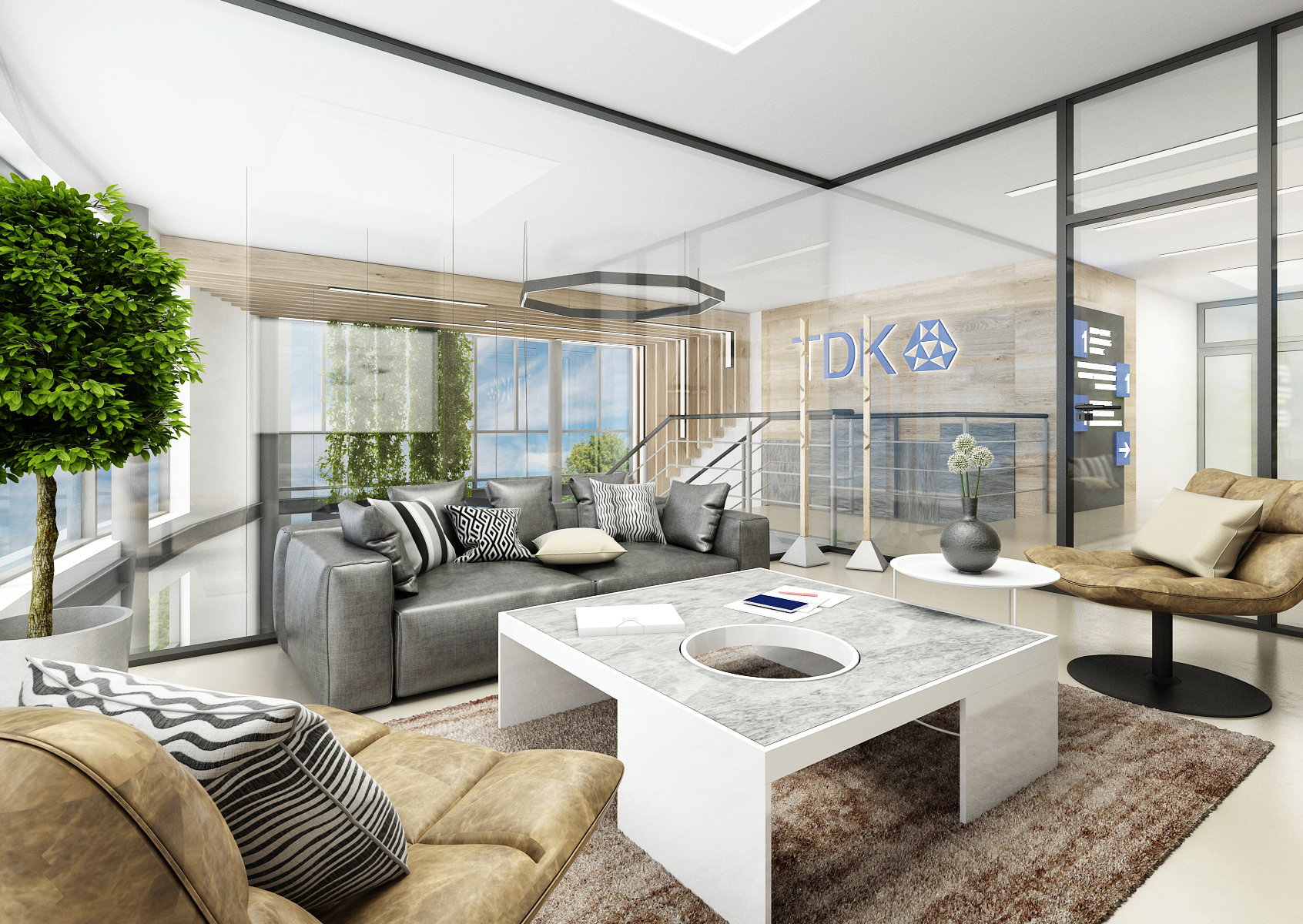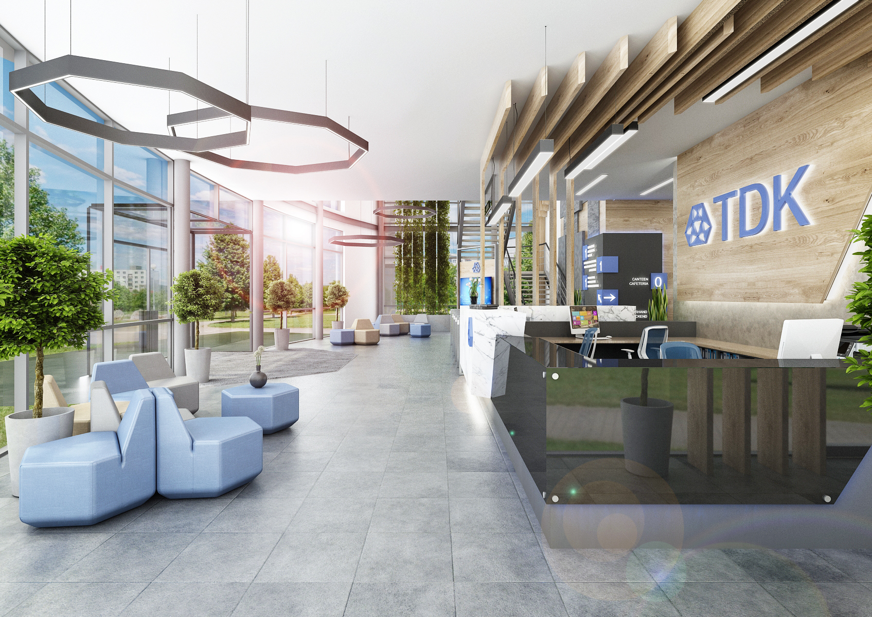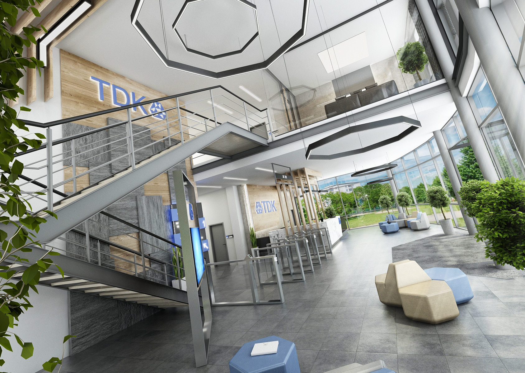 Podle vstupní haly a recepce si tvoříme první dojem. Materiály jako černý Lacobel, žula a dřevěné obložení je dostatečně reprezentativní. Taburety v loby mají tvar nepravidelného šestiúhelníky, kopírují tak tvar firemního znaku. Prosklená jednací místnost nad schodištěm připomíná spíše obývací pokoj. Stejně vkusně je zařízena i kuchyňka s posezením pro zaměstnance, vystavěná v nevzužitém technickém prostoru.