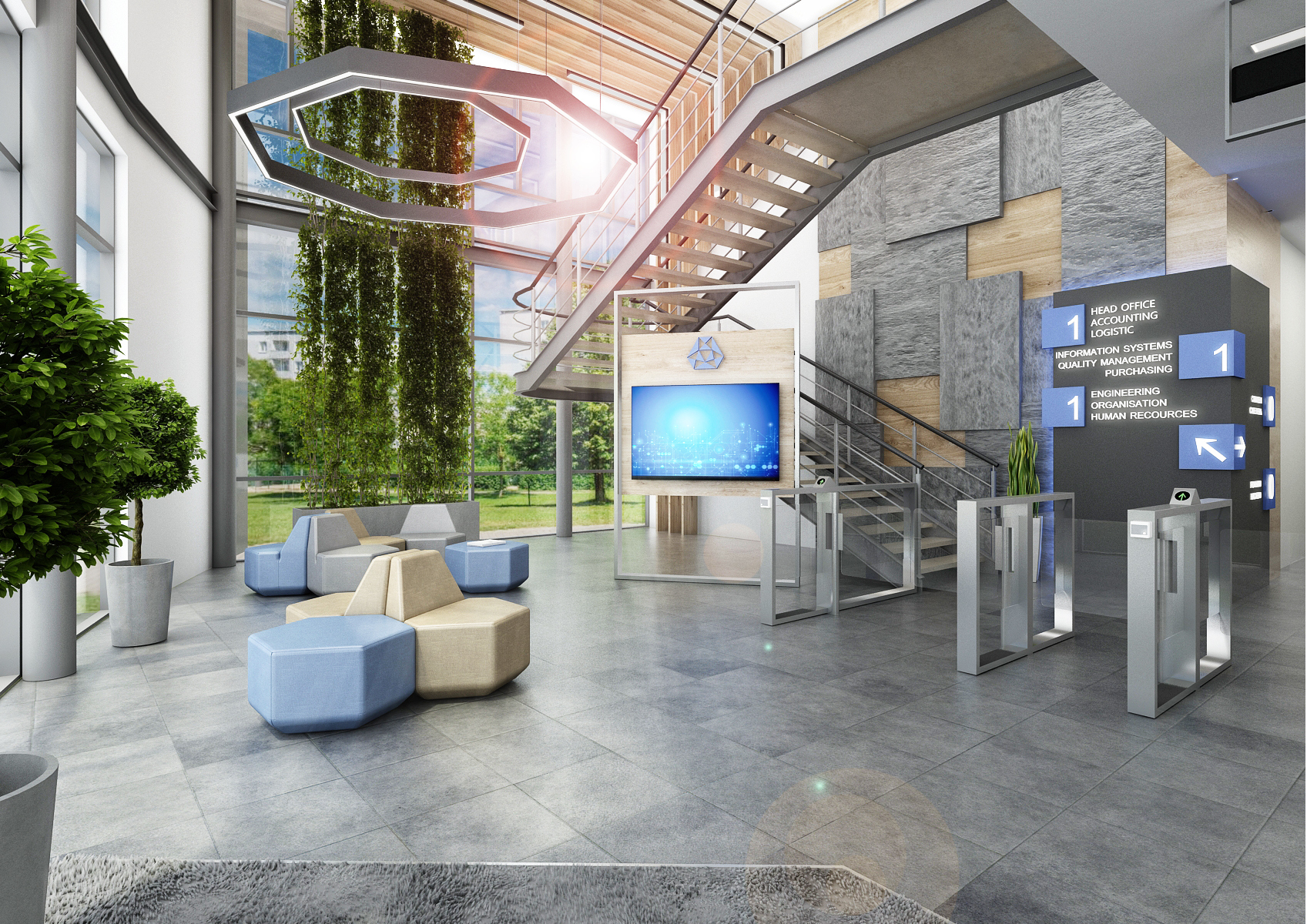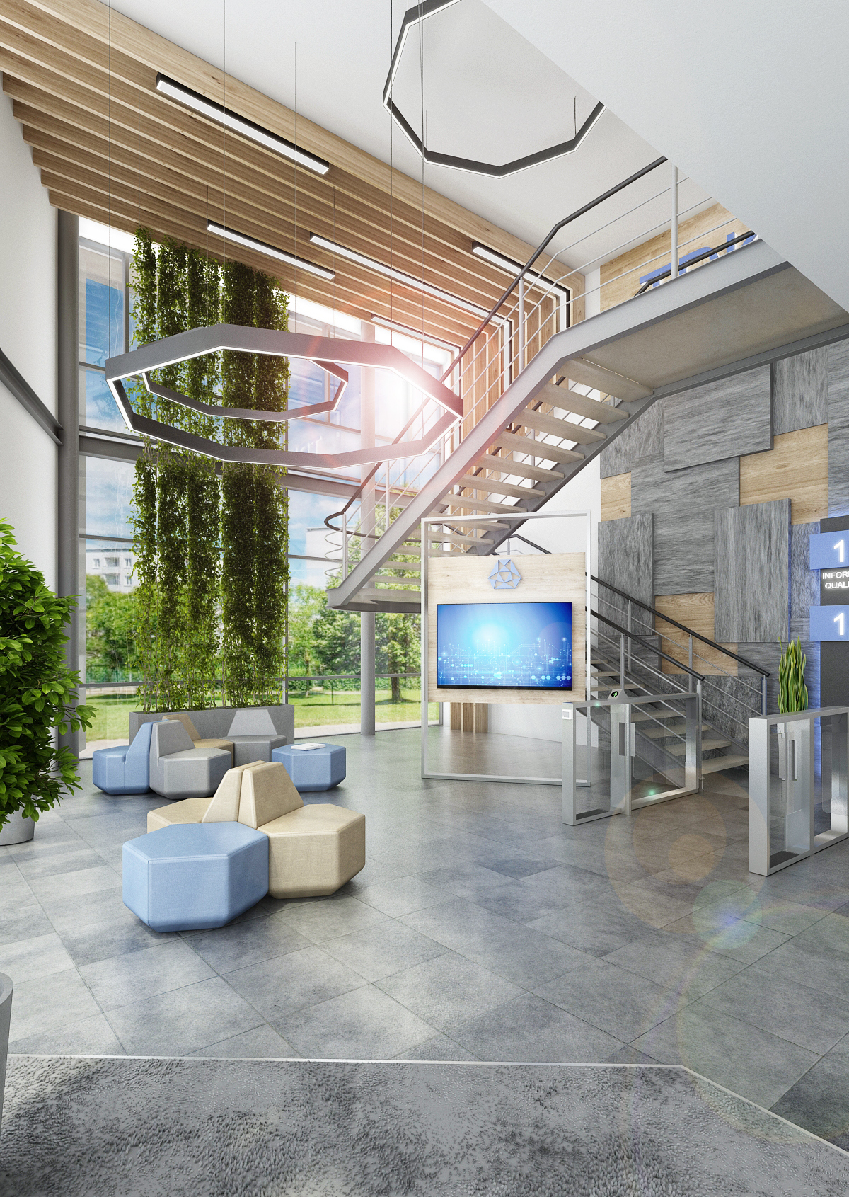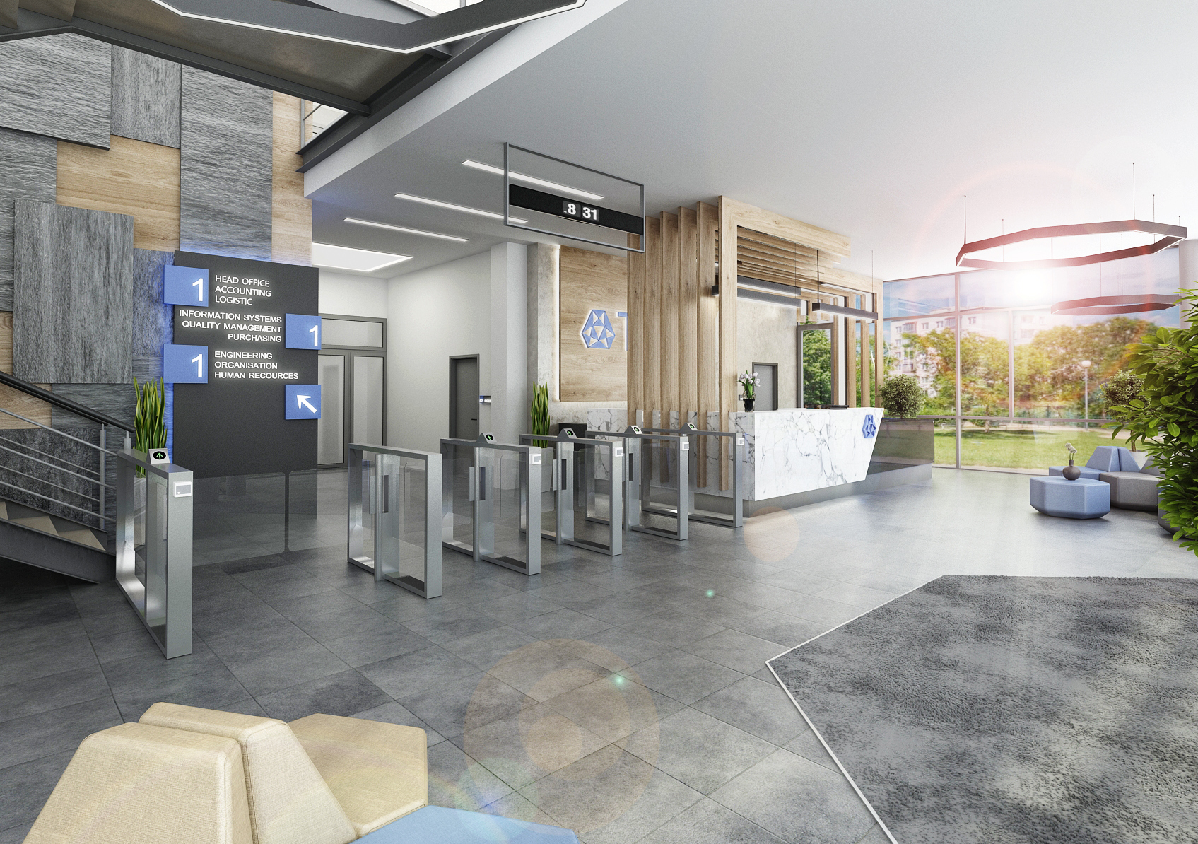 Podle vstupní haly a recepce si tvoříme první dojem. Materiály jako černý Lacobel, žula a dřevěné obložení je dostatečně reprezentativní. Taburety v loby mají tvar nepravidelného šestiúhelníky, kopírují tak tvar firemního znaku. Prosklená jednací místnost nad schodištěm připomíná spíše obývací pokoj. Stejně vkusně je zařízena i kuchyňka s posezením pro zaměstnance, vystavěná v nevzužitém technickém prostoru.