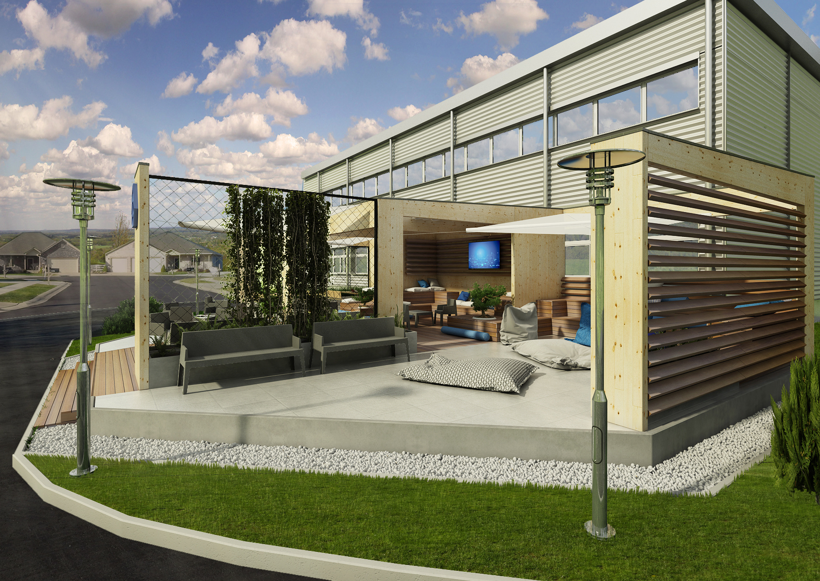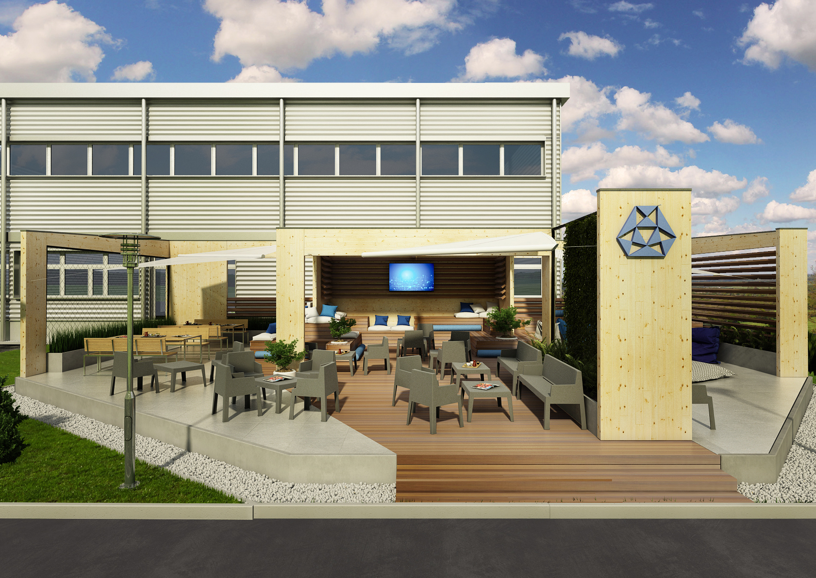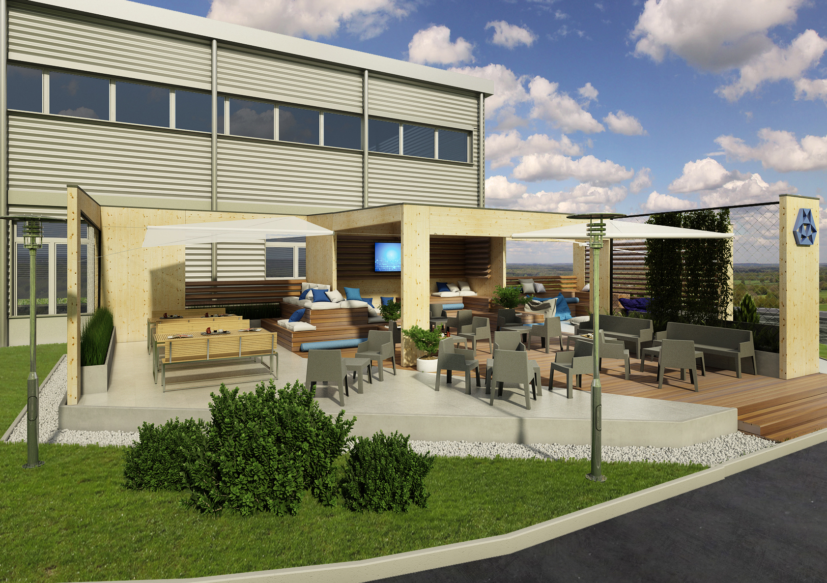 Od práce je potřeba si odpočinout. Proto jsme pro společnost EPCOS, dceřinou společnost známé TDK navrhli relaxační zónu, která je součástí exteriérů areálu a navazuje na prostory stravovacího zařízení.