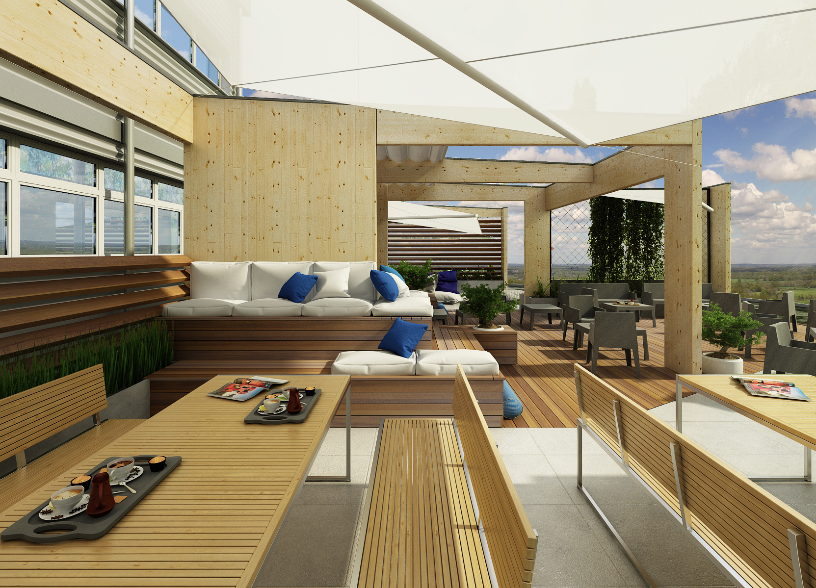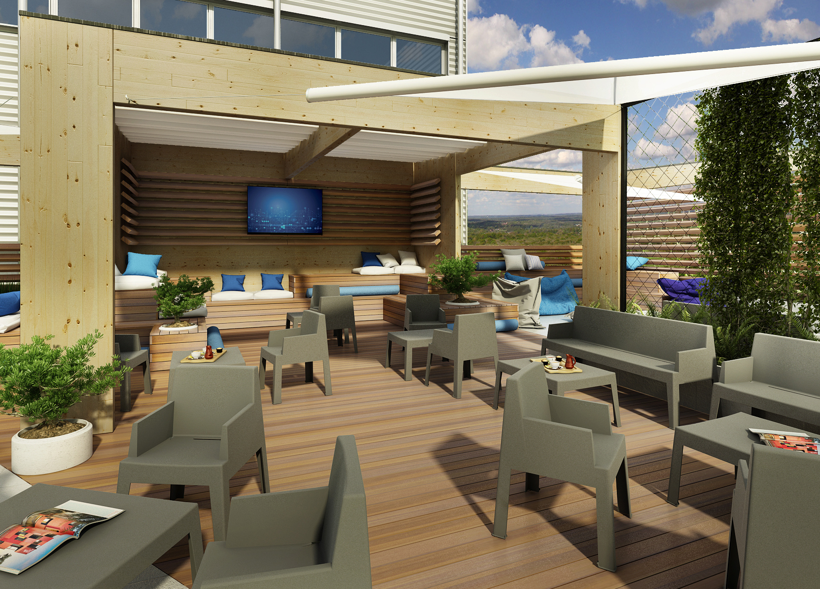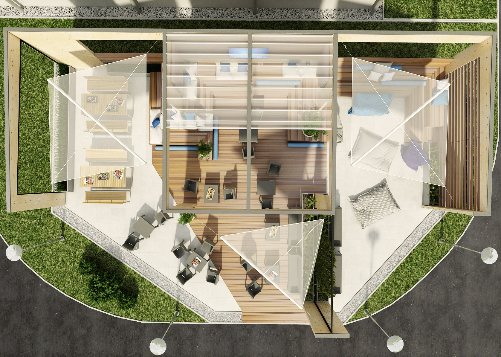 Prostor je zařízen tak, aby kombinoval různé druhy sezení a způsoby komunikace mezi lidmi. Funguje jako obytná krajina a nabízí mnoho různých zákoutí. Prostor je dělený na části, které jsou zcela ve stínu, částečně zastřešeny, nebo části, kde se dá plně absorbovat sluníčko pro získání potřebného vitamínu D :)