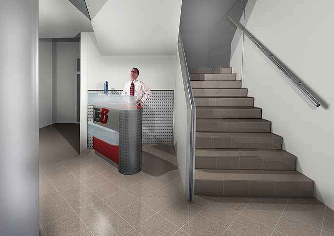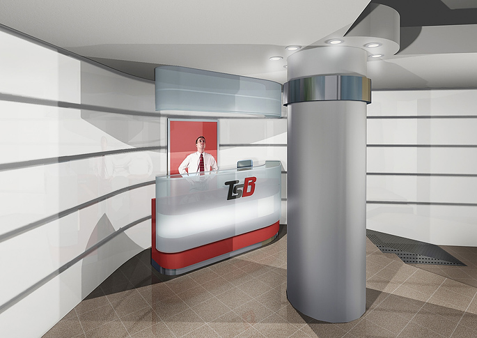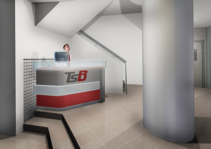 Interiér vstupní haly s rohově tvarovanou recepcí působí jednoduše. Použití homopalu a podsvíceného mléčného skla dodává místnosti moderní vzhled a o čistý design se stará kombinace bílé barvy se světlým odstínem dlažby. Jednoduchá skleněná recepce nese zpestření v podobě červené barvy korespondující s logem firmy. Zajímavým prvkem je široký podpěrný sloup s bodovými světly po obvodu. Celý prostor je v kombinaci s hnědou dlažbou.
