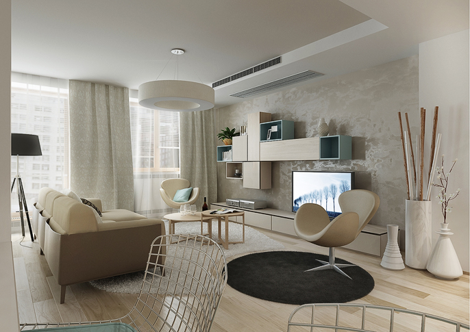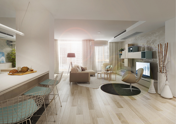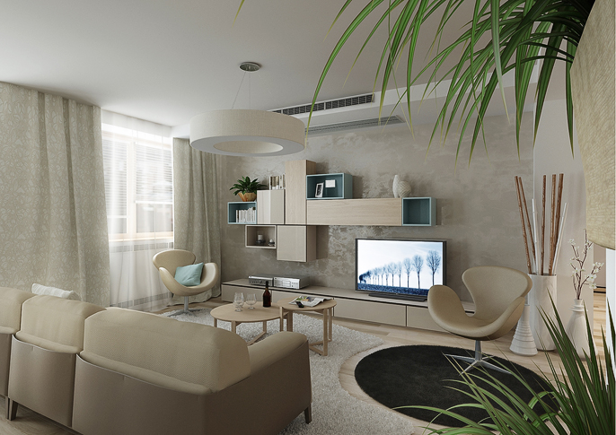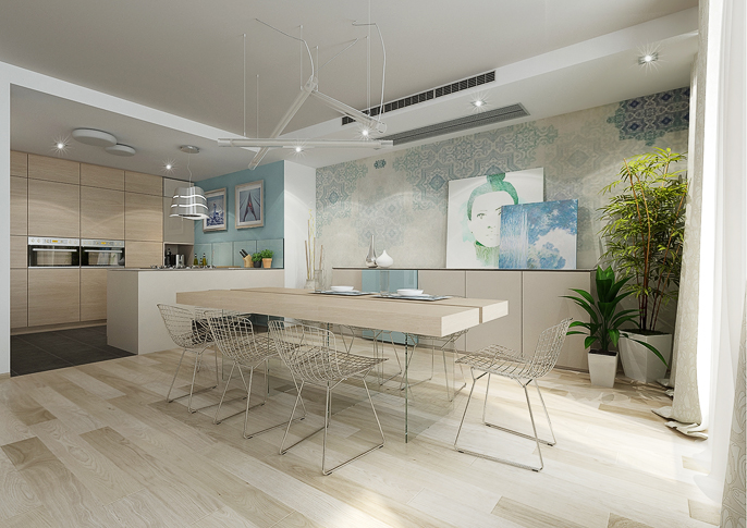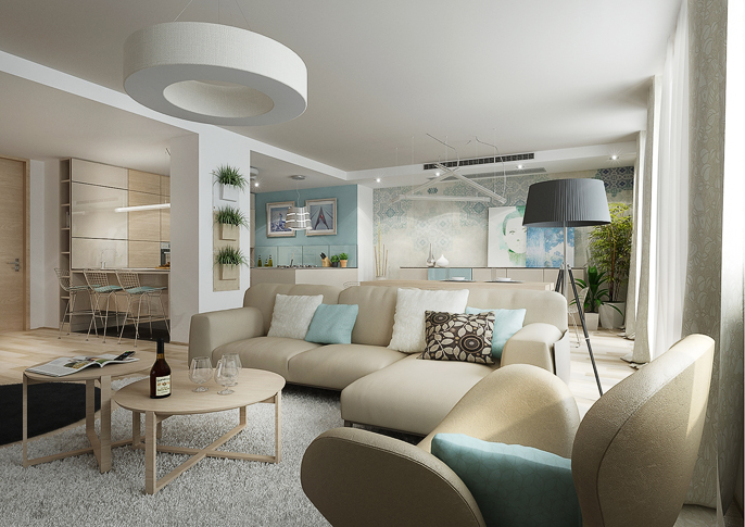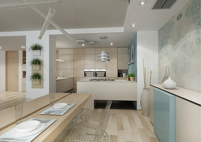 V tomto interiéru jsou použity, dle přání klienta, krémové a tyrkysové pastelové barvy, které jsou doplněny velkoplošnou tapetou od španělské firmy Tres Tintas. V kombinaci s béžovými doplňky, světlým dřevodekorem a bílou barvou působí prostor jednoduše a čistě.
