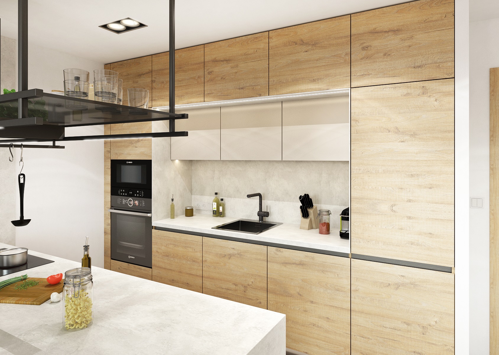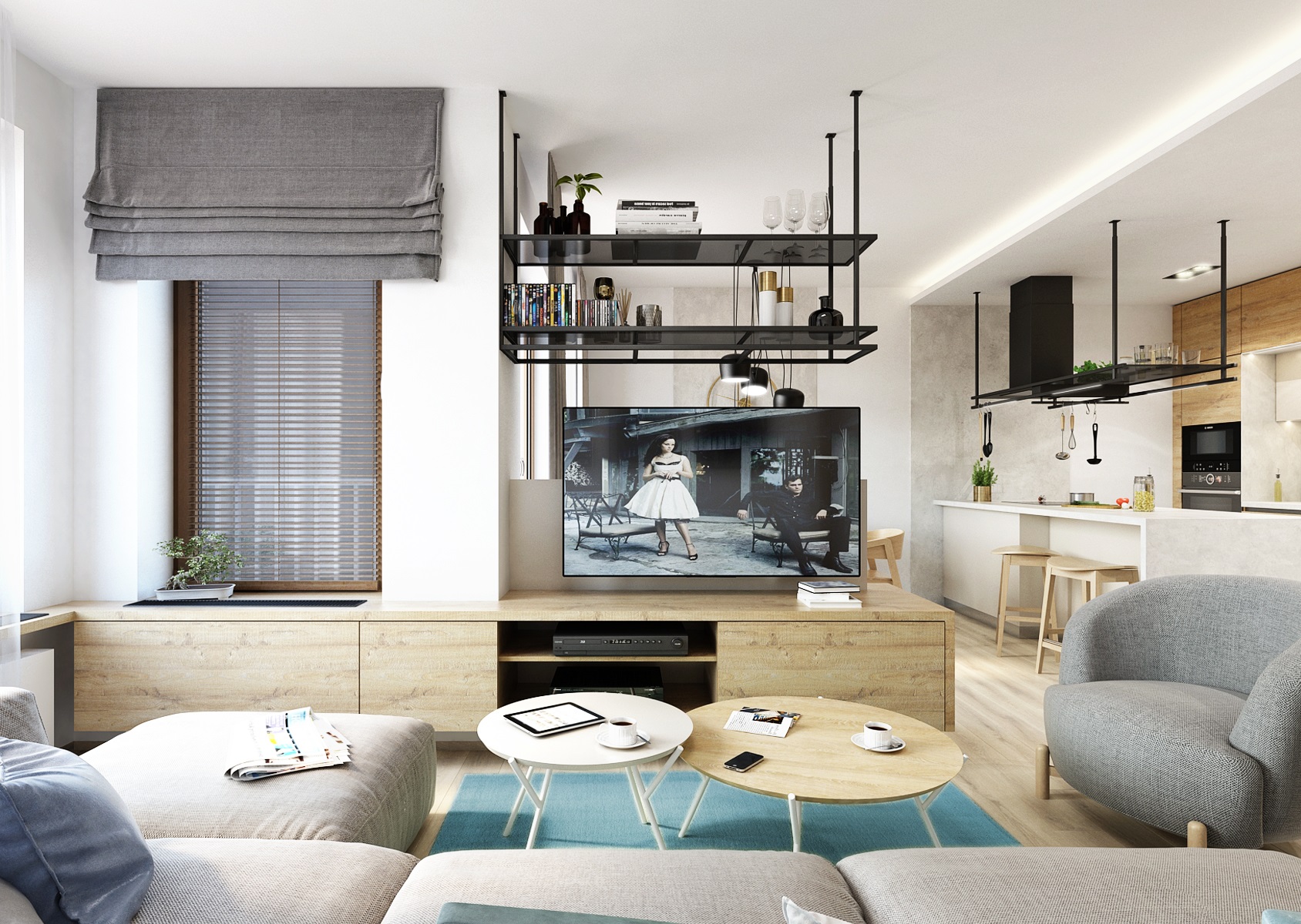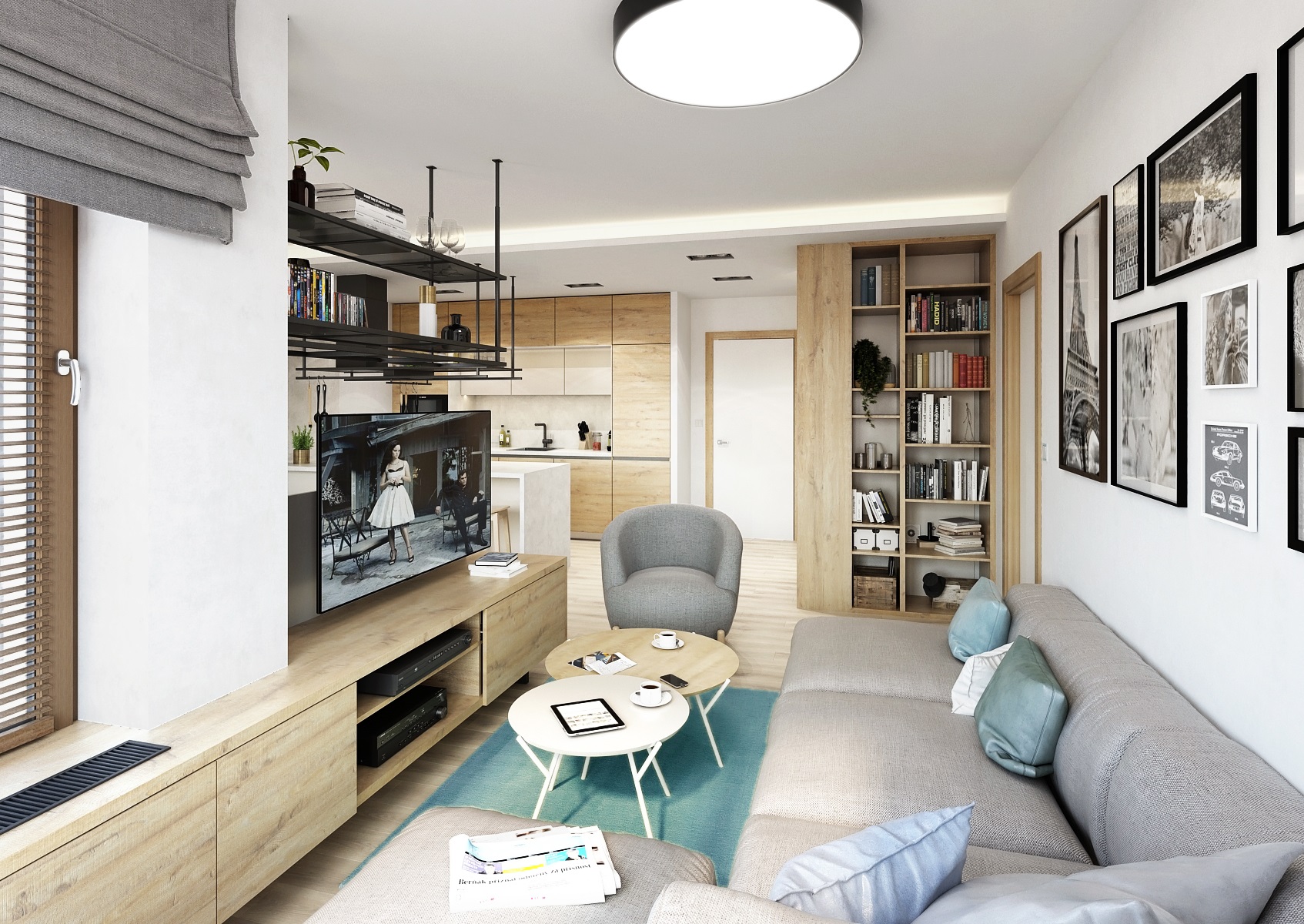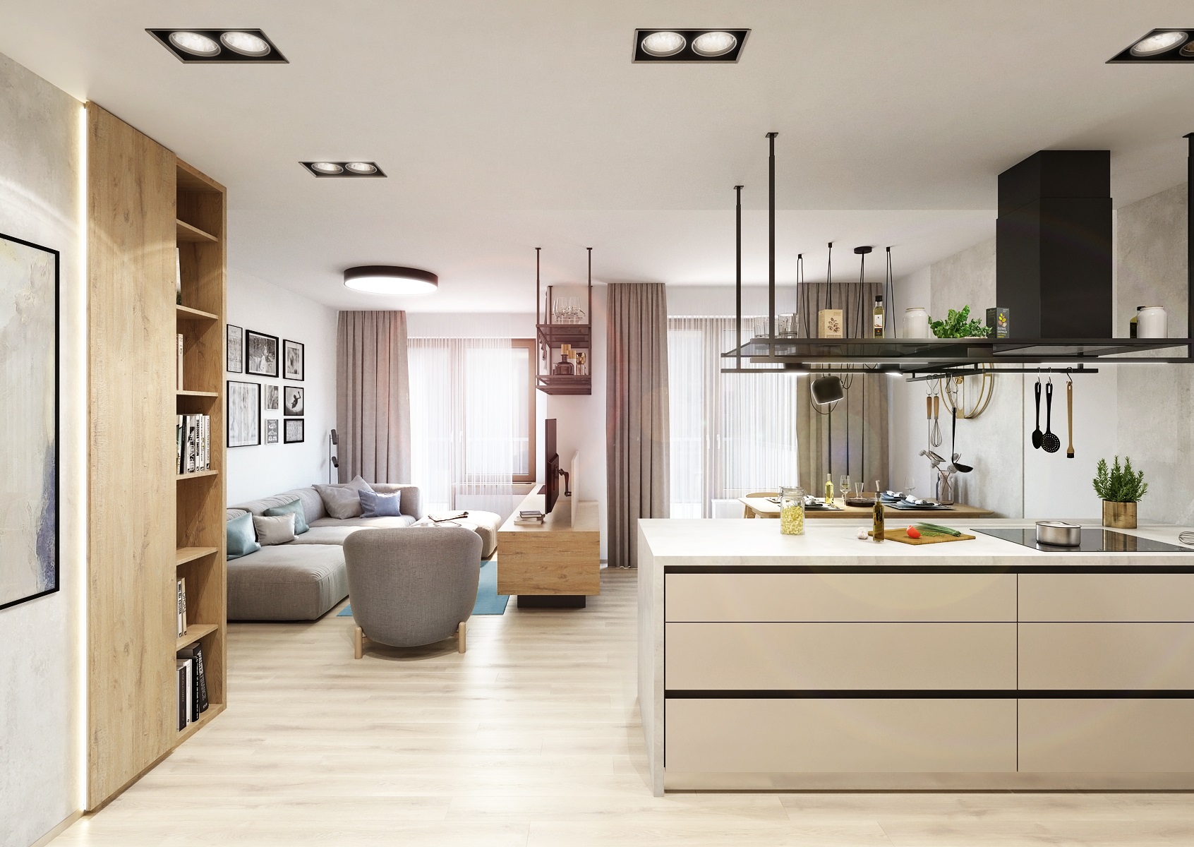 Hned při vstupu do místnosti zaujme pozornost netradiční umístění TV ve středu místnosti a to především kvůli možnosti polohování TV k jídelnímu stolu a kuchyňské části. Umístění sedací soupravy podél stěny pak dává i pocitově lepší přehled o dění (nesedí zády/bokem ke vchodu) v pokoji. Kuchyňská linka je navržena z kombinace dřevodekoru dubu (Dub Bruno), lesklé cappuccino LTD, pracovní a zádové desky ala křídová kamenná keramika z nabídky Egger, kdy se stejný dekor objevuje i u vertikálních panelů na stěnách.