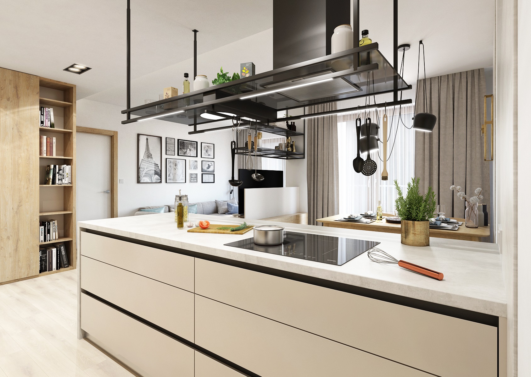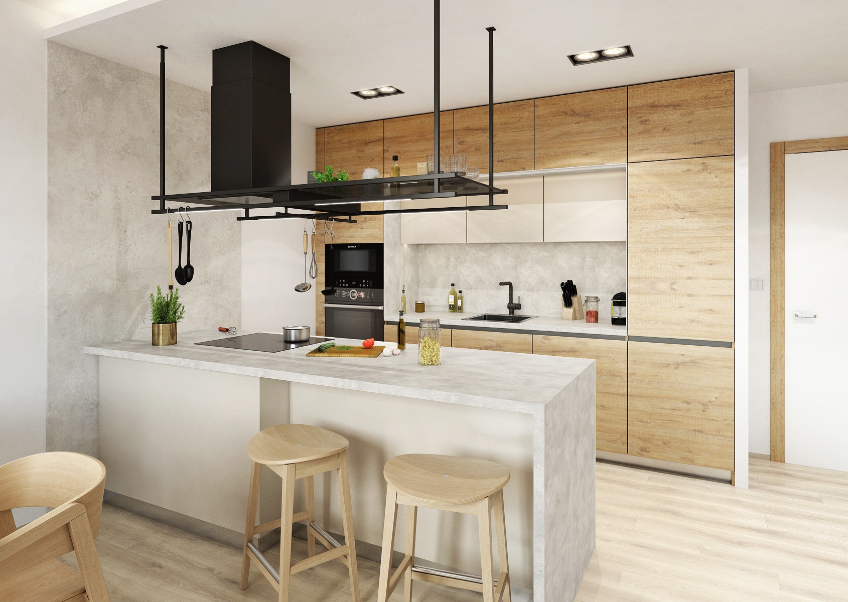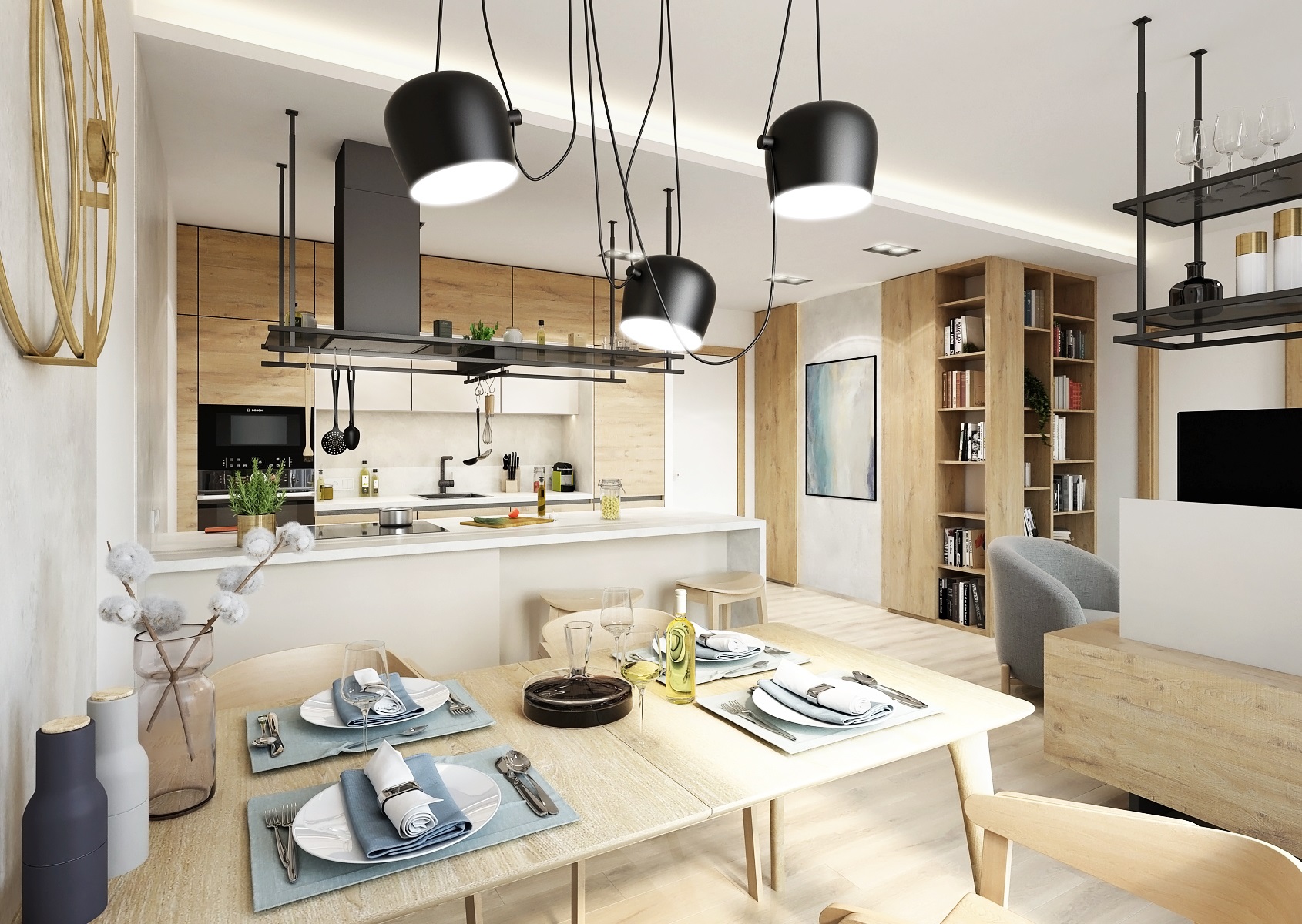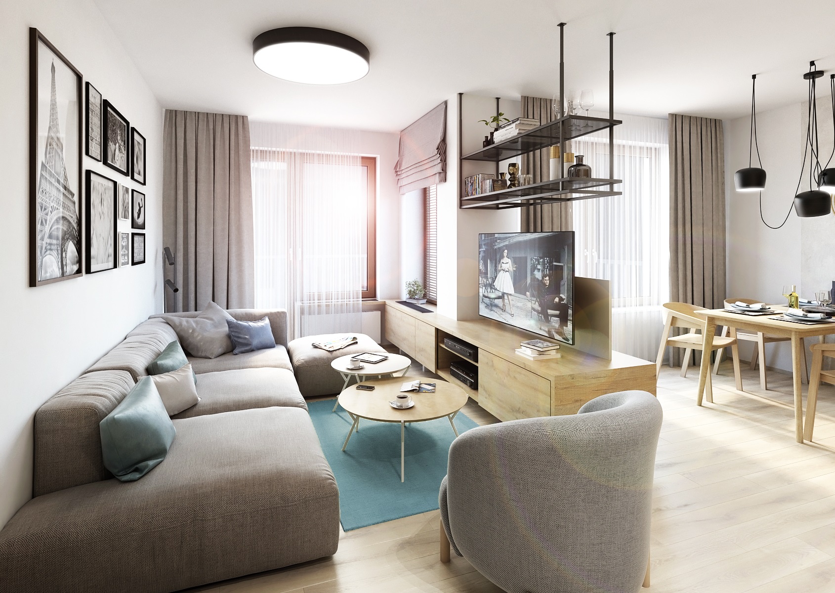Hned při vstupu do místnosti zaujme pozornost netradiční umístění TV ve středu místnosti a to především kvůli možnosti polohování TV k jídelnímu stolu a kuchyňské části. Umístění sedací soupravy podél stěny pak dává i pocitově lepší přehled o dění (nesedí zády/bokem ke vchodu) v pokoji. Kuchyňská linka je navržena z kombinace dřevodekoru dubu (Dub Bruno), lesklé cappuccino LTD, pracovní a zádové desky ala křídová kamenná keramika z nabídky Egger, kdy se stejný dekor objevuje i u vertikálních panelů na stěnách.