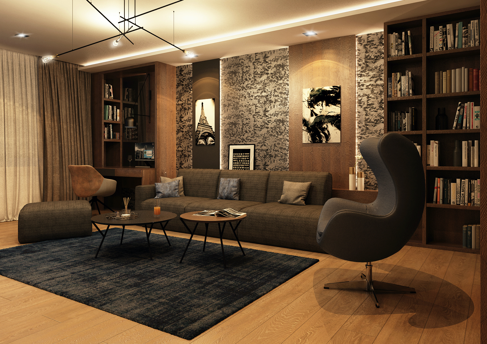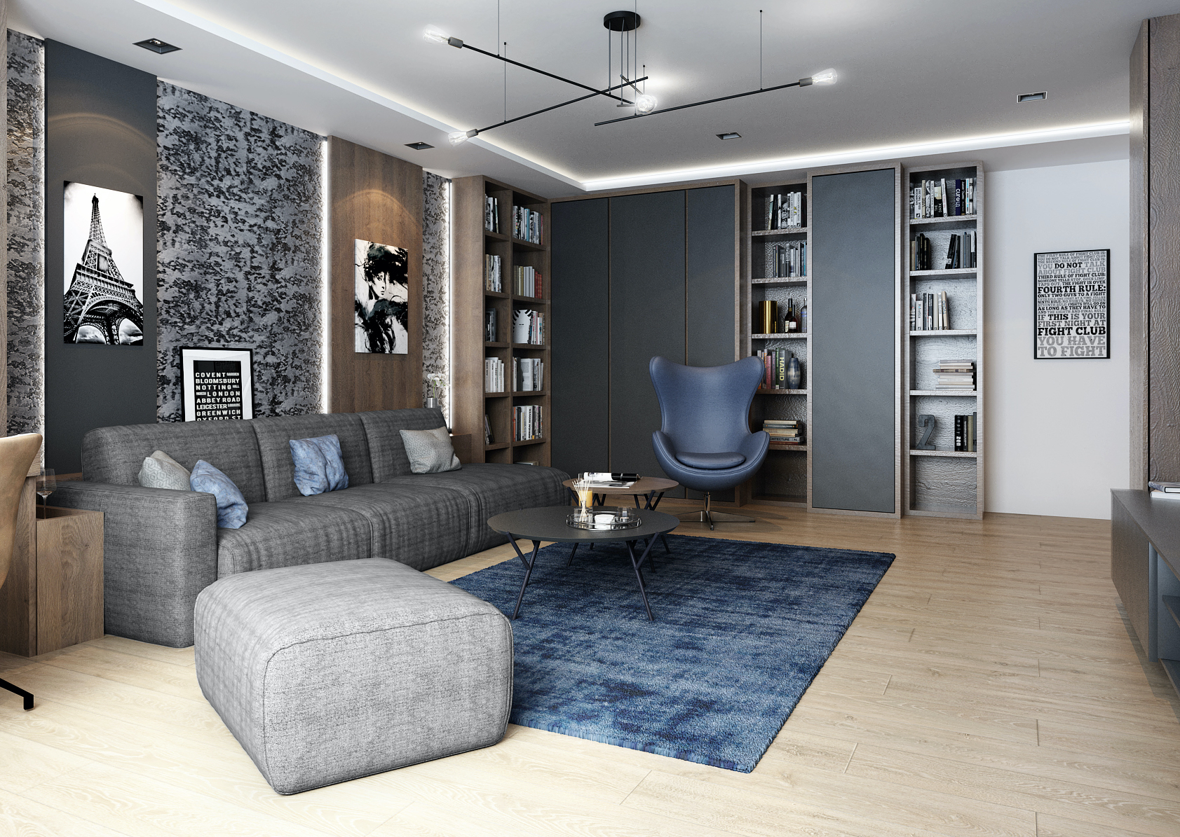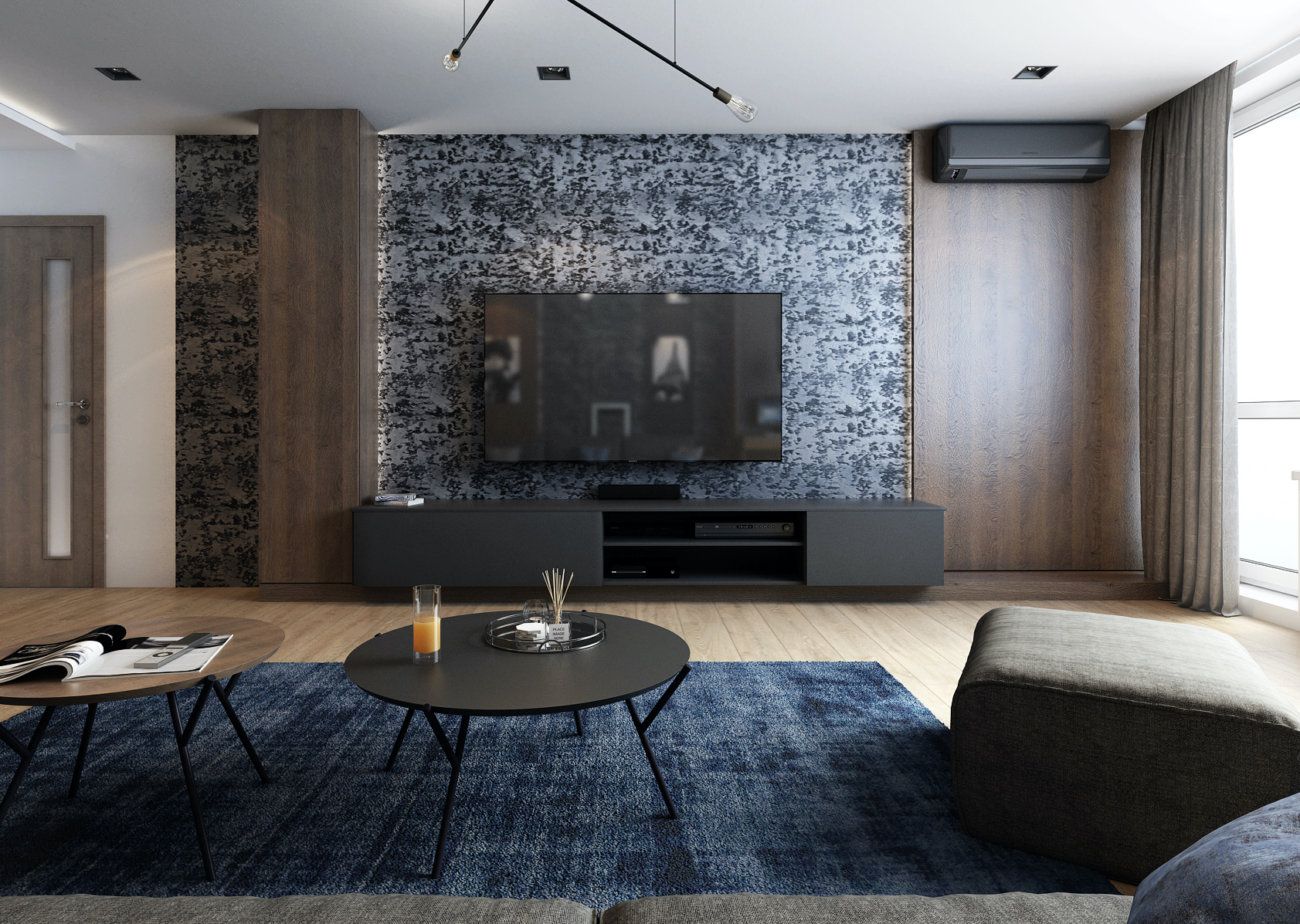 Obývacímu pokoji dominují tmavé výrazné tóny, které jsou doplněny o ocelově modrou barvu v podobě doplňků a nábytkových prvků. Světlo hraje v tomto interiéru taktéž velkou roli. V nočních hodinách prostor působí velice útulně a podsvícené vertikály nijak nenarušují domácí pohodu.