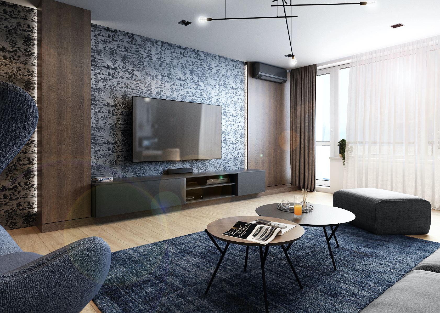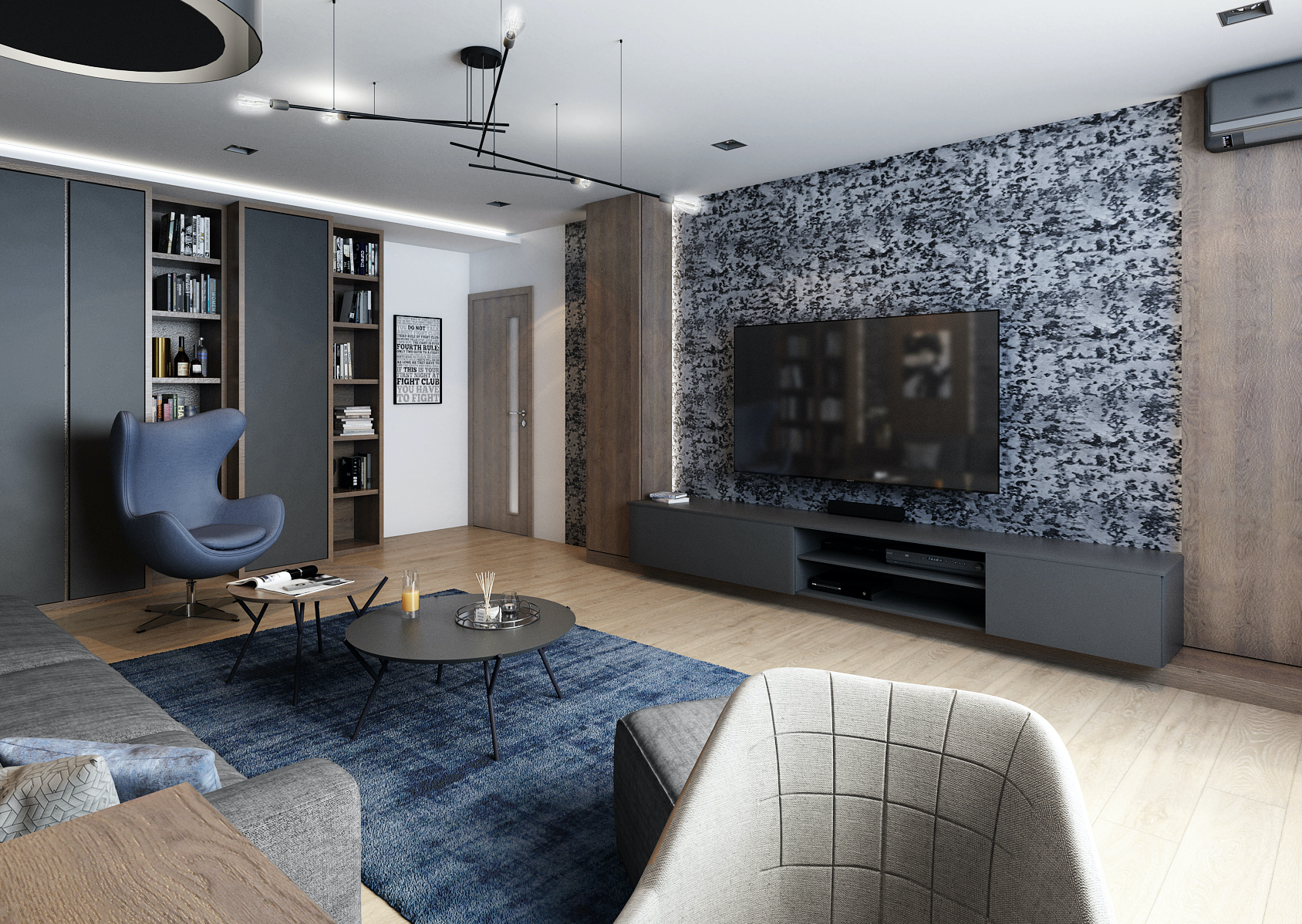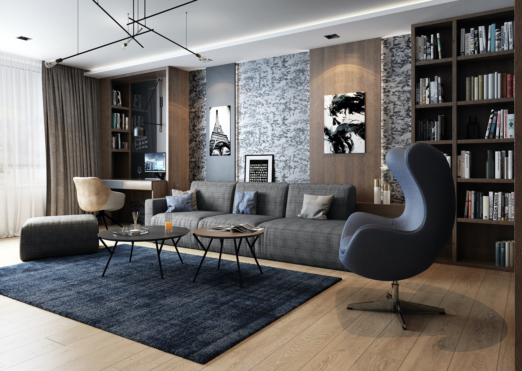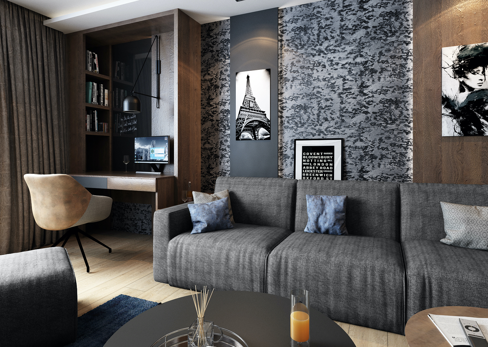 Obývacímu pokoji dominují tmavé výrazné tóny, které jsou doplněny o ocelově modrou barvu v podobě doplňků a nábytkových prvků. Světlo hraje v tomto interiéru taktéž velkou roli. V nočních hodinách prostor působí velice útulně a podsvícené vertikály nijak nenarušují domácí pohodu.