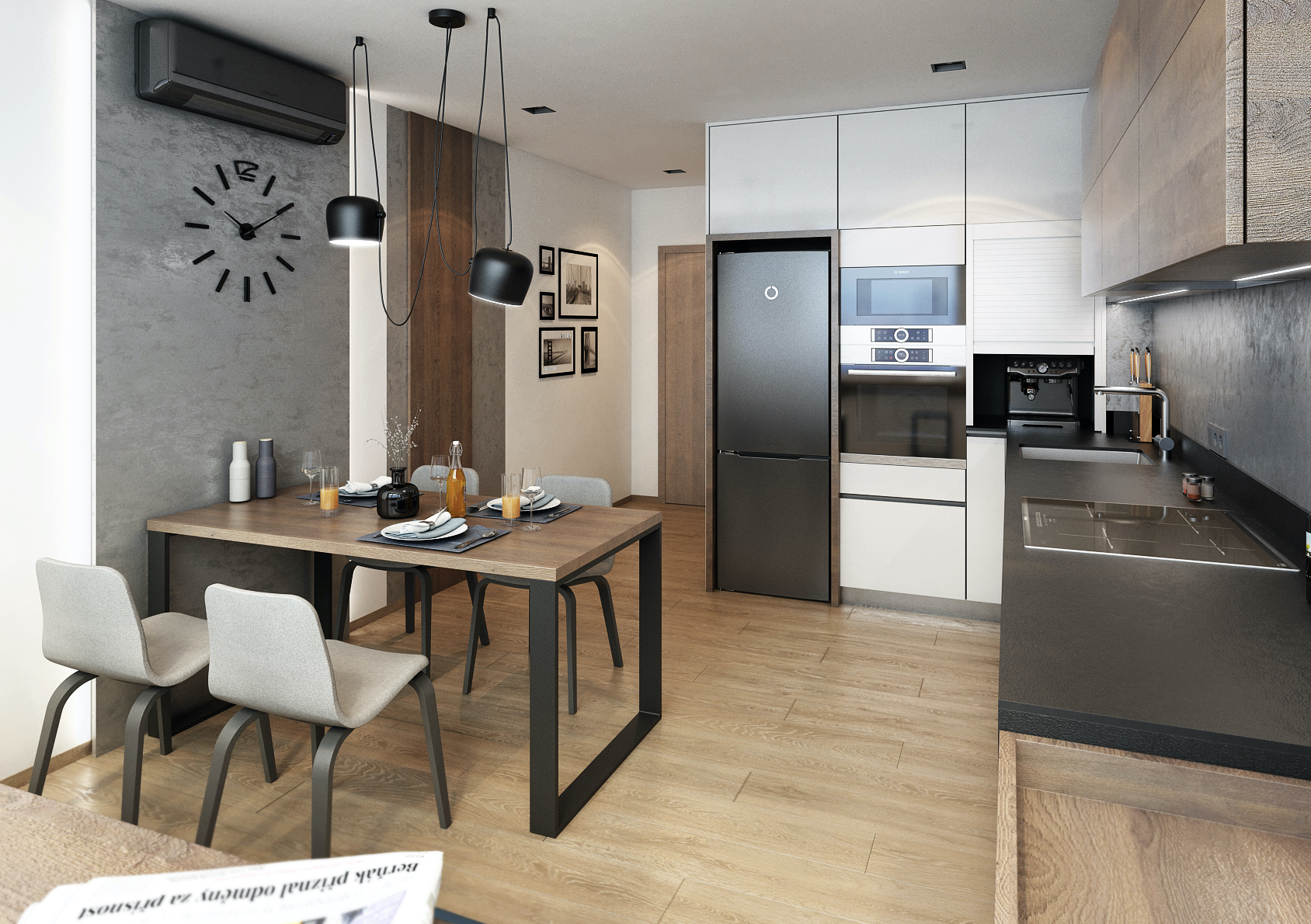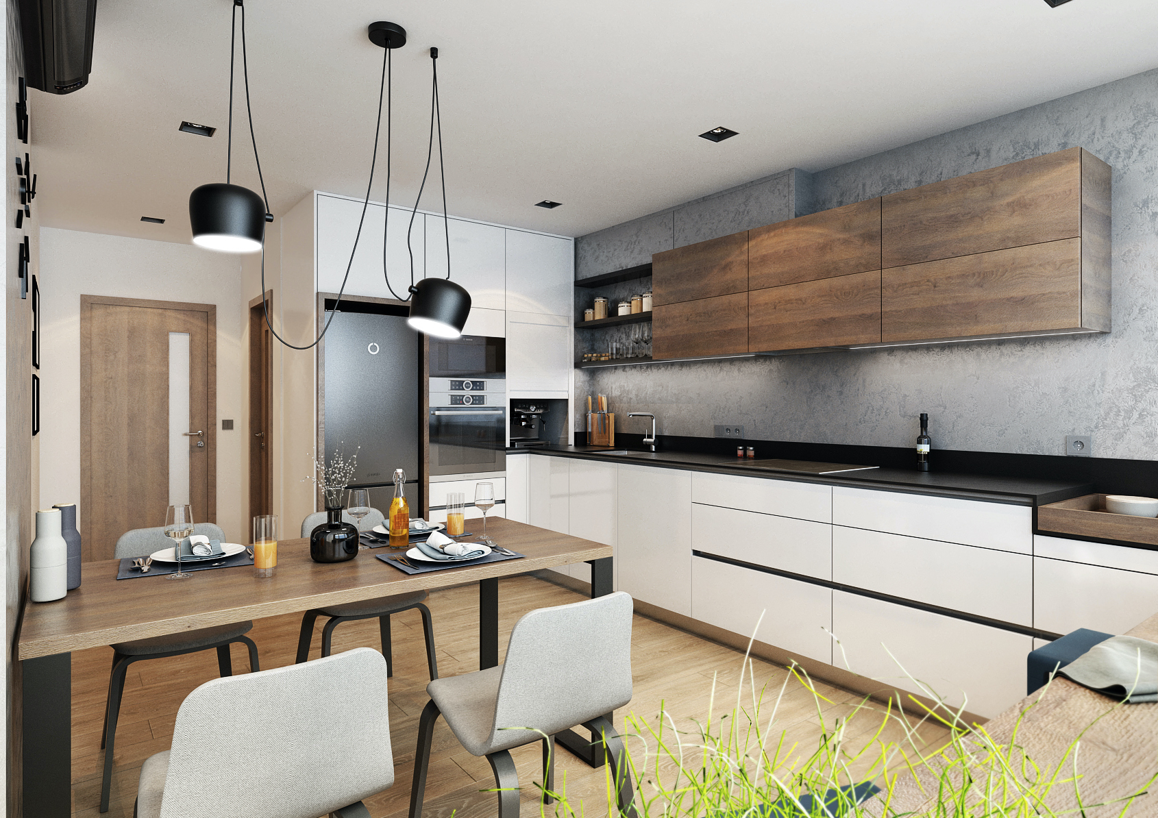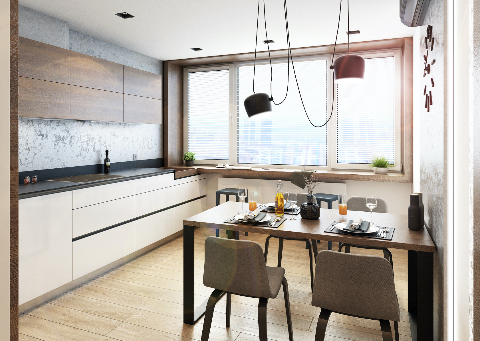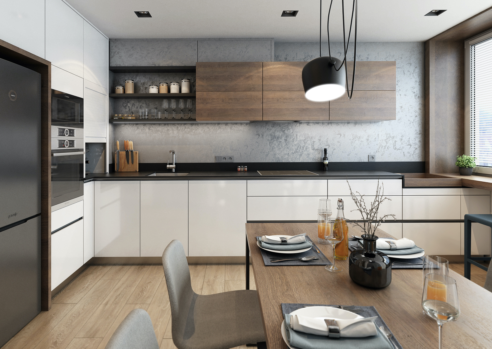 V prostorách kuchyně byl parapet využit jako barový pult, čehož bylo dosaženo prodloužením kuchyňské linky, která ladně přechází přes parapetní barový pult do špalety okna. Zdi jsou zde zpestřeny šedou dekorativní stěrkou v kombinaci s černými nábytkovými prvky a vybavením.