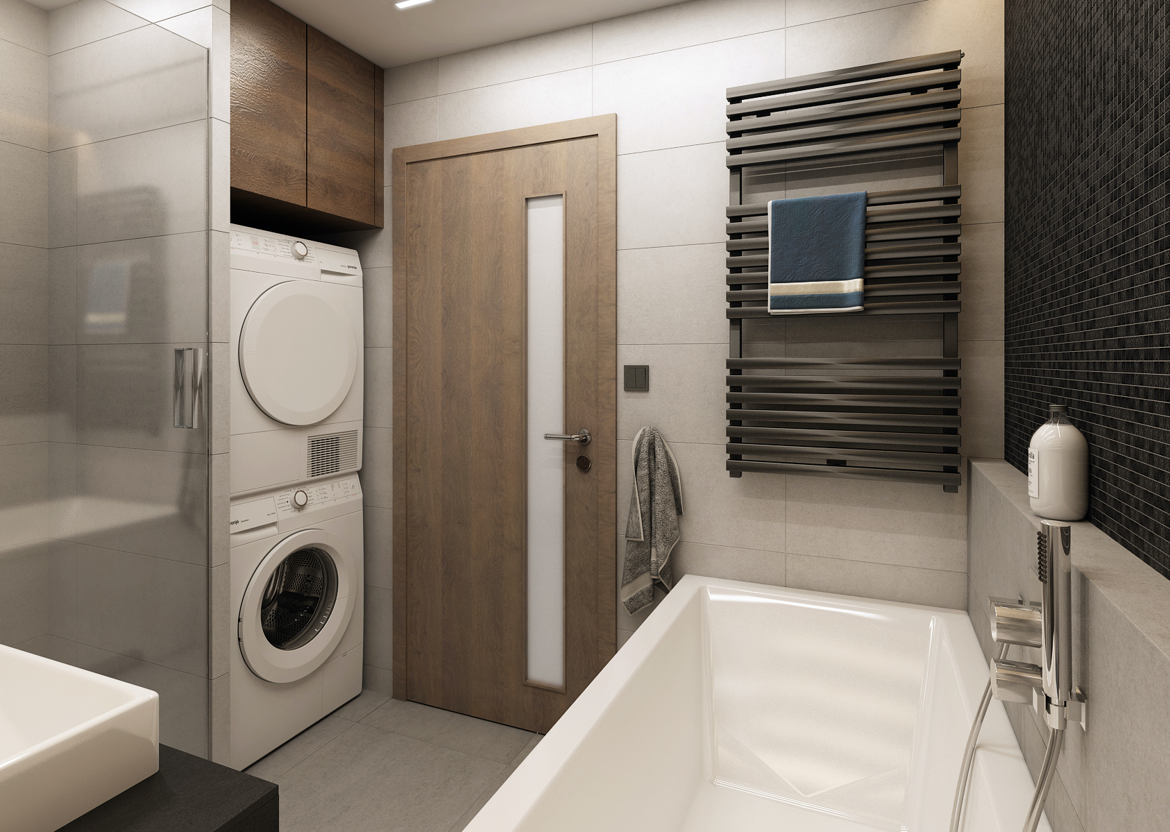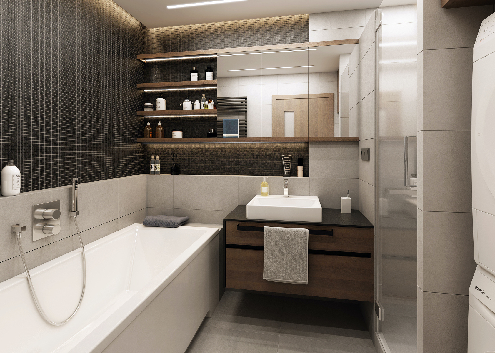 Světlý obklad v koupelně je kombinován s tmavými nábytkovými prvky a mozaikou za odkládacím prostorem kolem prostorné moderní vany. Díky odsazenému odkládacímu prostoru působí prostor velice čistě a minimalisticky. Nechybí zde ani sprcha s dešťovým proudem. Zároveň je zde velice prakticky řešené uložení sušičky s pračkou.