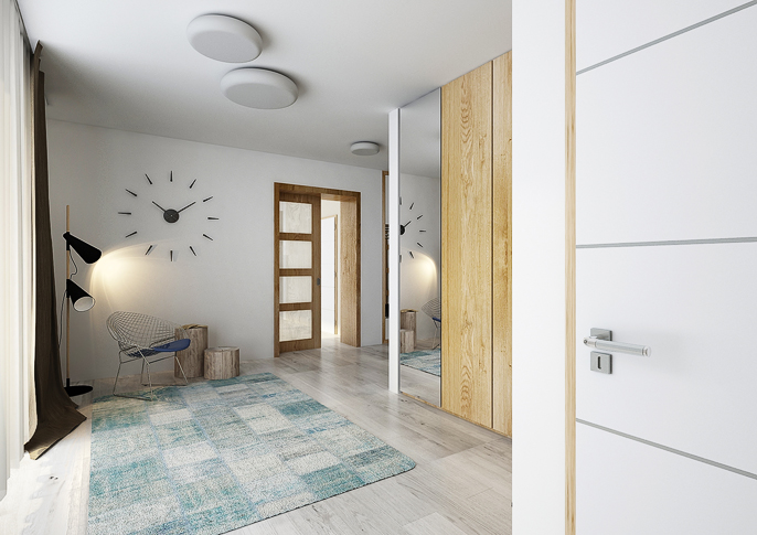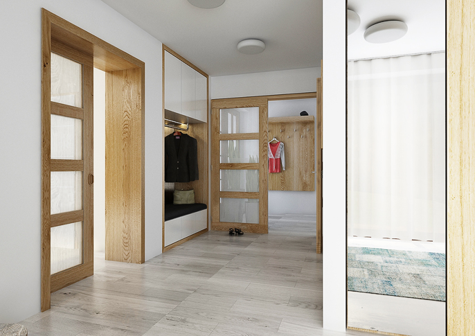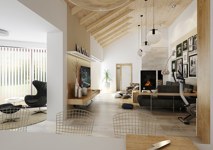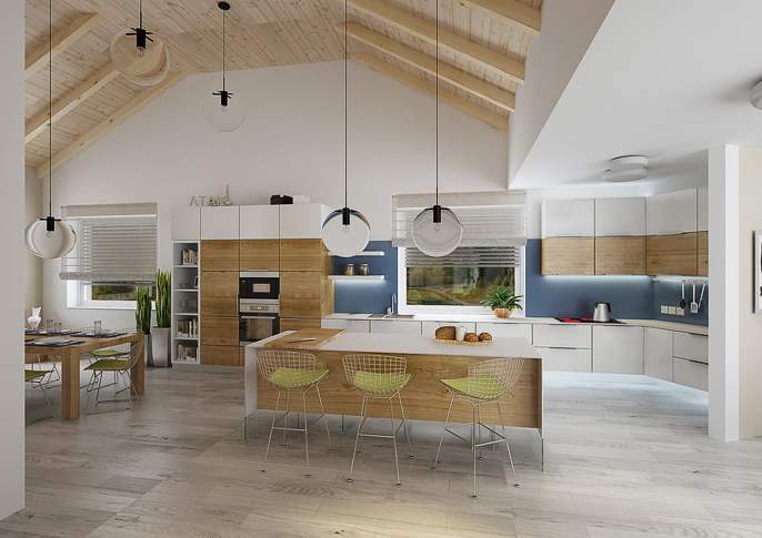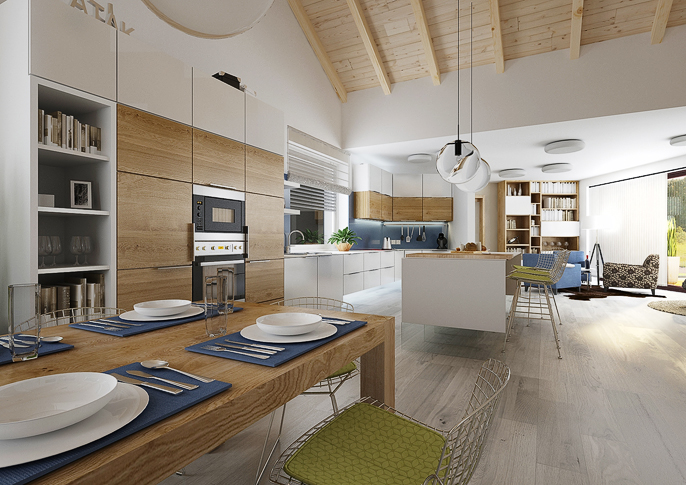 Návrh interiéru rodinného domu na venkově. Velký společný prostor s kuchyní a obývacím pokojem s dřevěným stropem. Jednolitá podlaha v dekoru šedého dubu a dřevodekor medového dubu na nábytku prochází všemi místnostmi. V domě je pracovna i samostatný byt pro babičku s vlastní kuchyní.