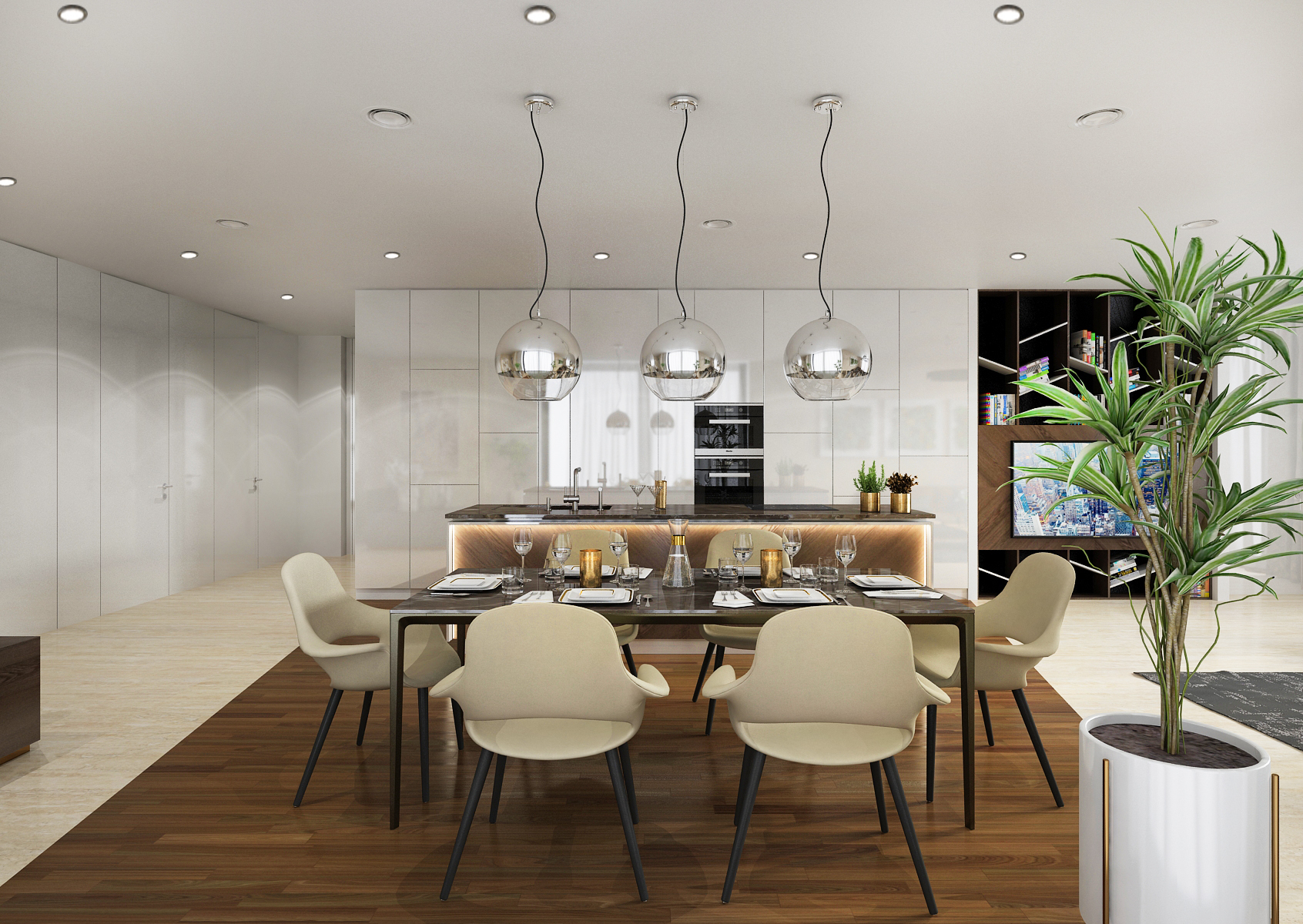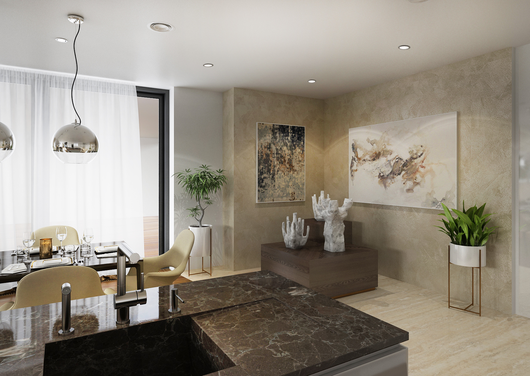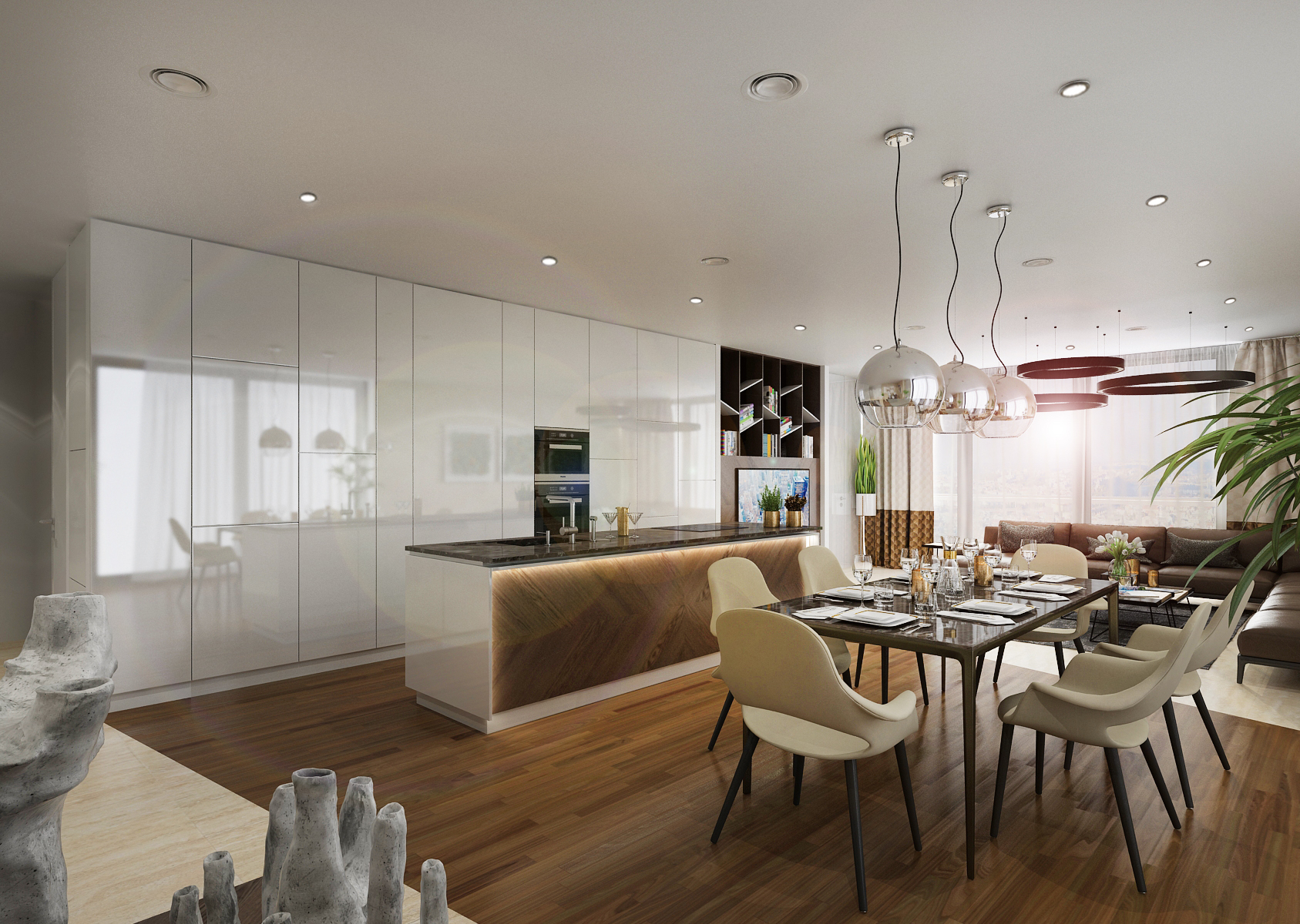 Prostorná kuchyně s kuchyňským ostrůvkem sahá od podlahy až ke stropu, nabízí tak spoustu úložného prostoru a díky bezúchytovým dvířkám v lesklé bílé působí čistě. Kamenná deska ostrůvku je doplněna podsvícením, díky kterému vynikne dřevěný motiv baru. Ten ladí s tmavou podlahou oddělujíc tak vizuálně část s kuchyní a jídelním stolem od zbytku obytného prostoru.