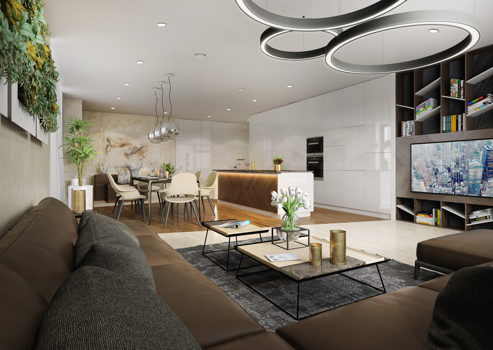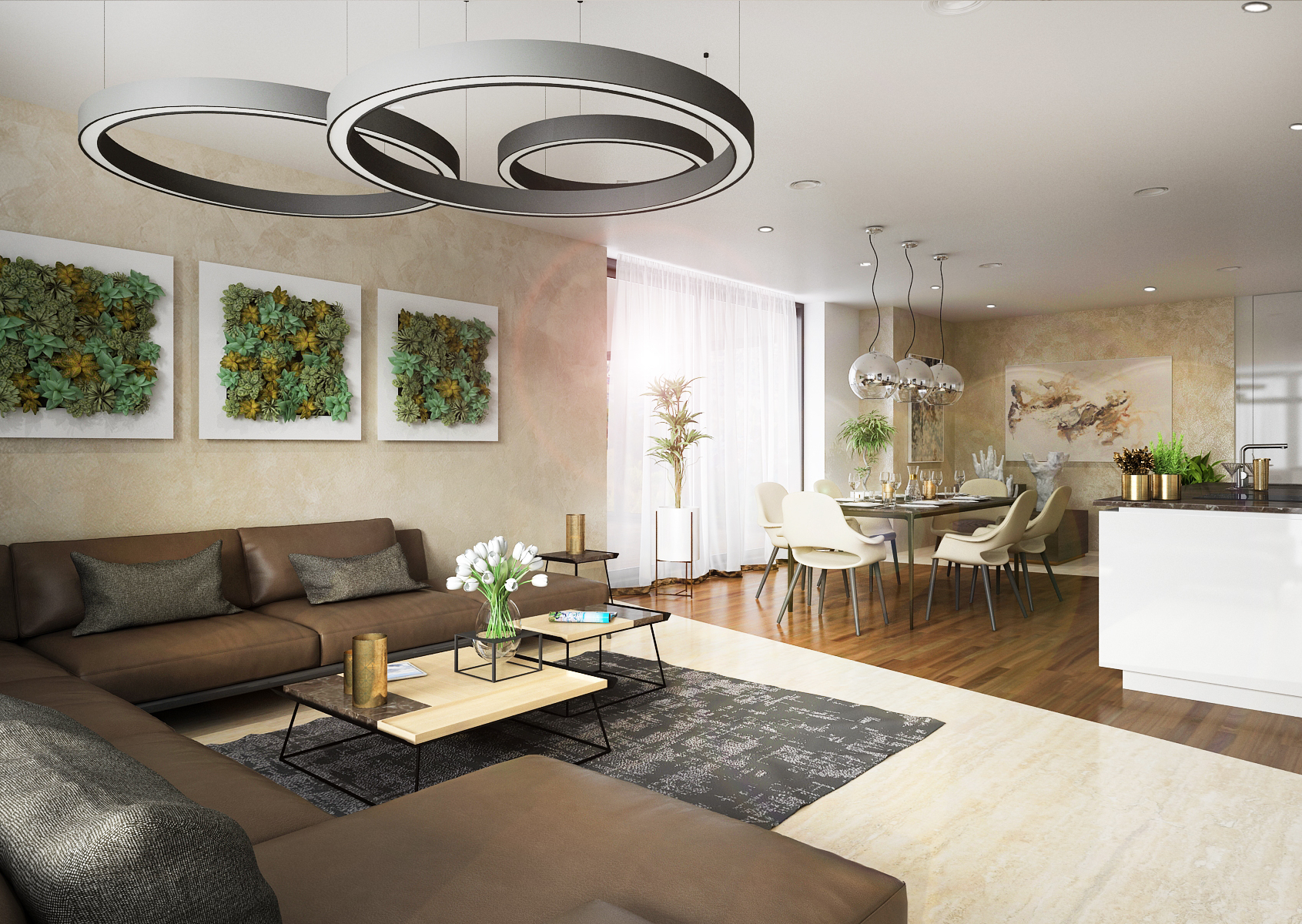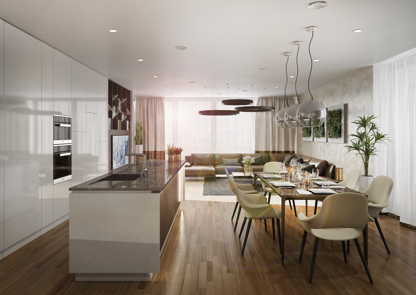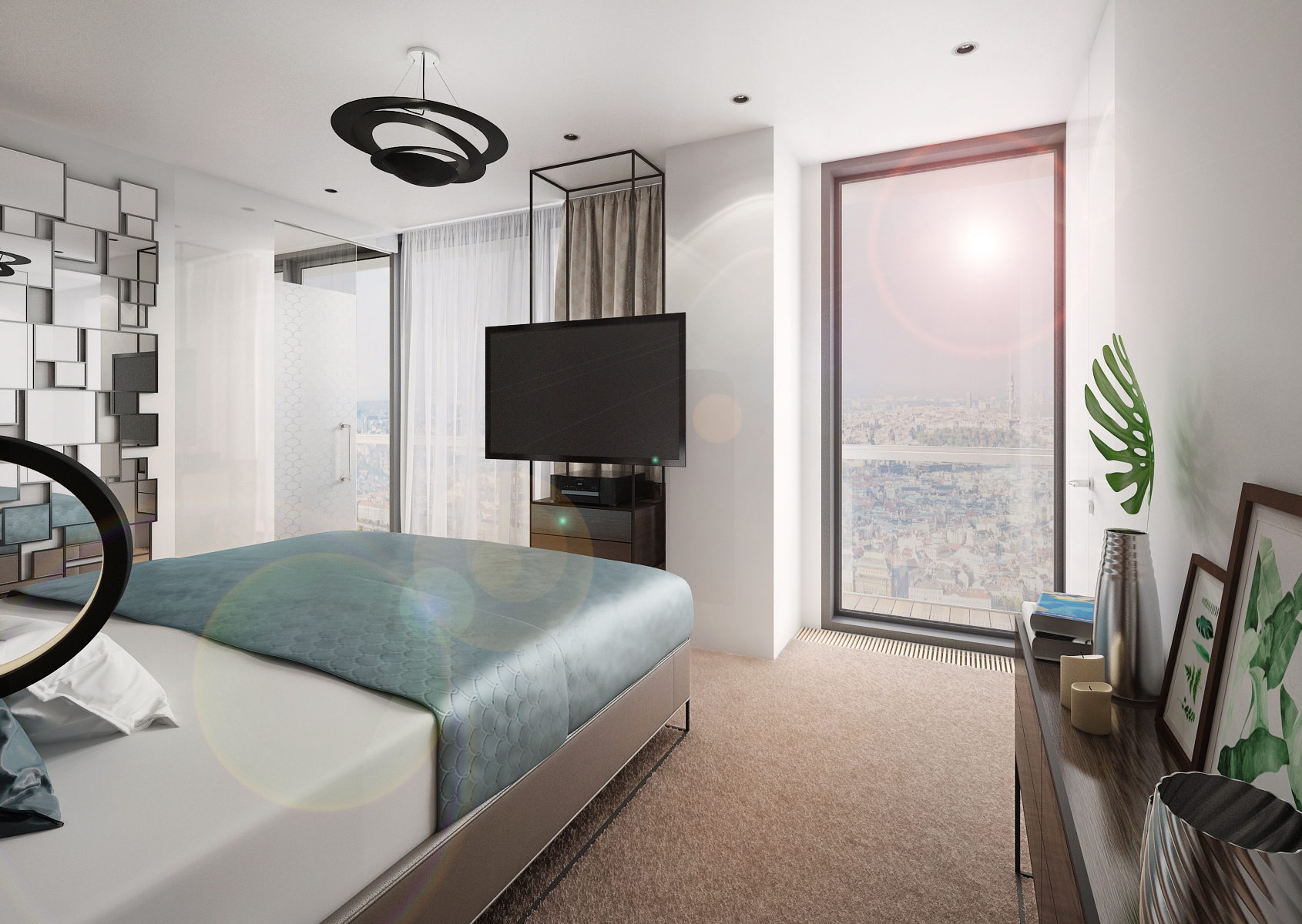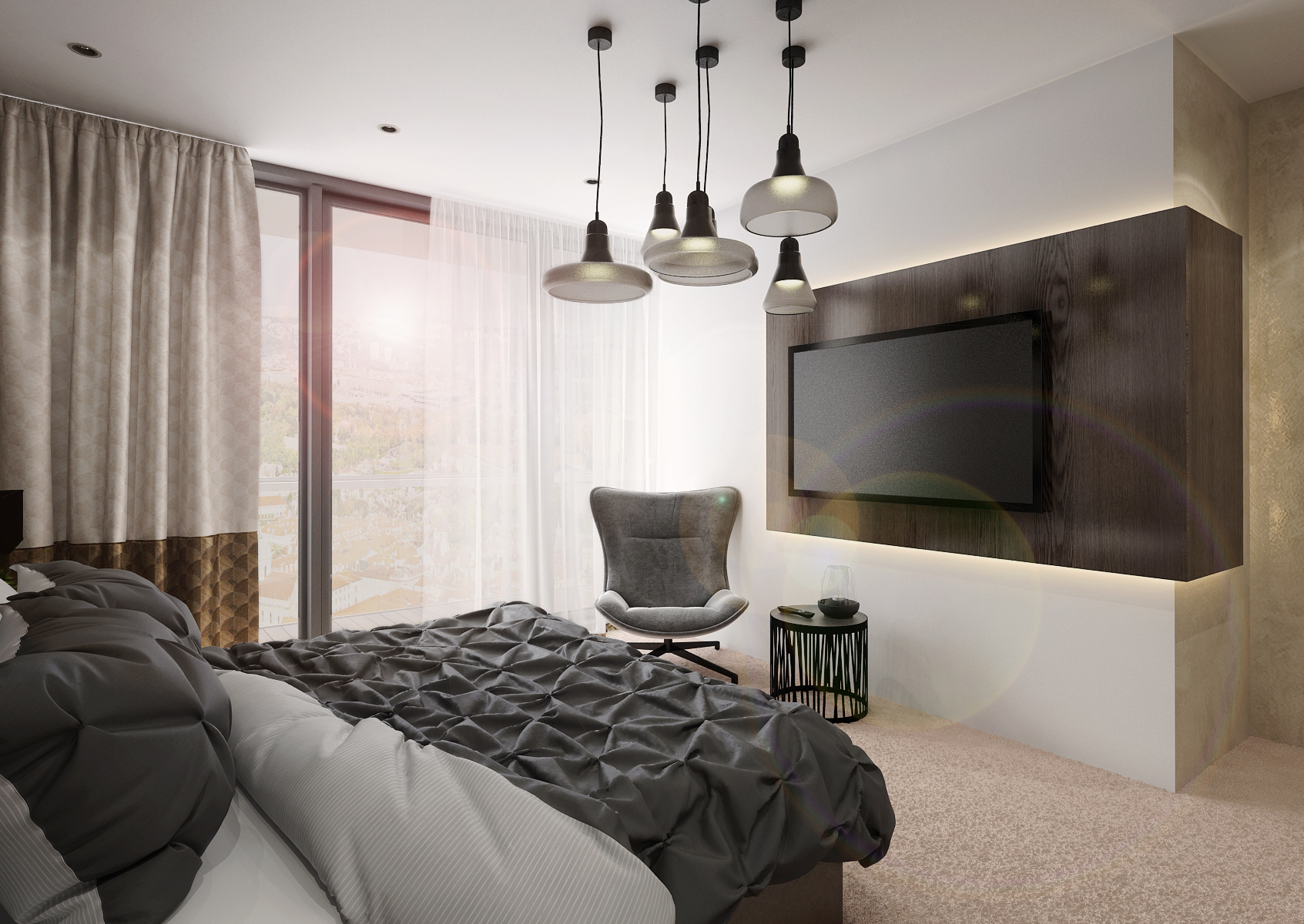 Byt v bytovém domě V Tower je vybaven pomocí nábytkových prvků a bytového textilu, které dohromady budí dojem elegance a luxusu.