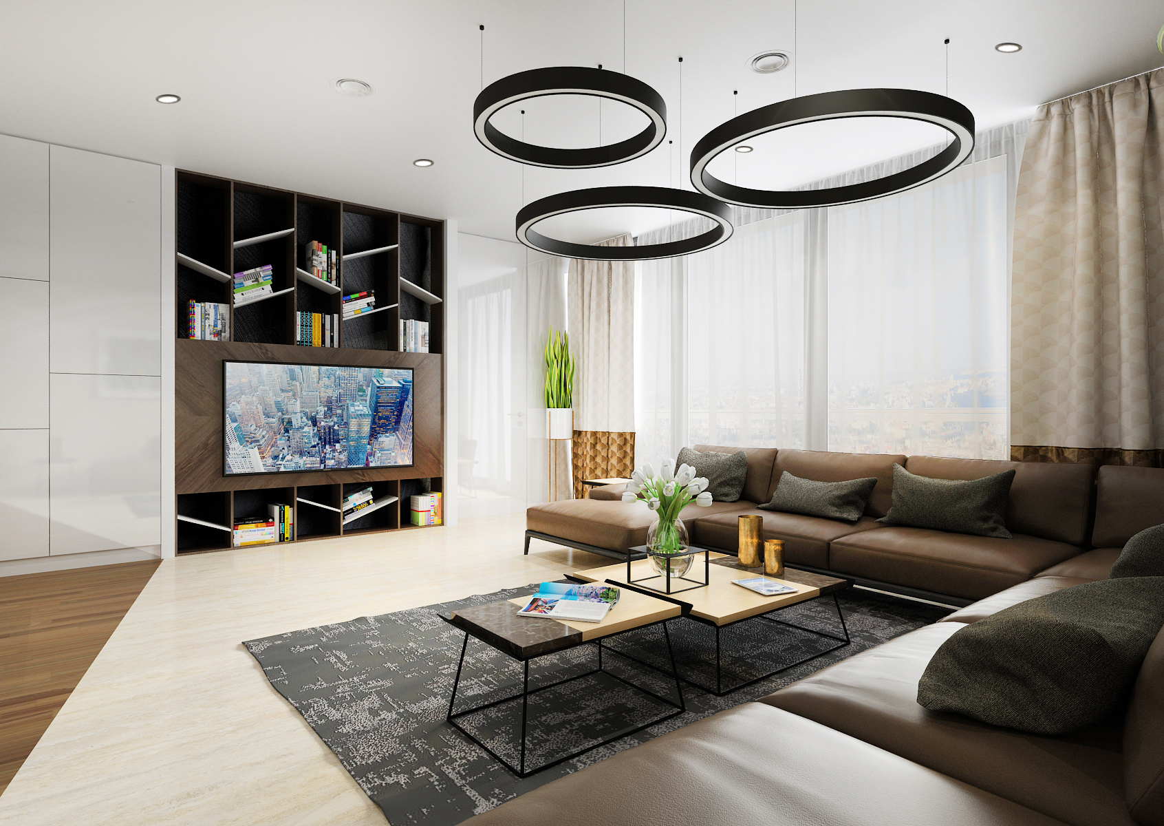 Kuchyňské vestavěné skříně navazují plynule na knihovnu s atypickými policemi, která je součástí televizní stěny. Dostatek pohodlí zaručuje prostorná rohová kožená sedací souprava v hnědé.