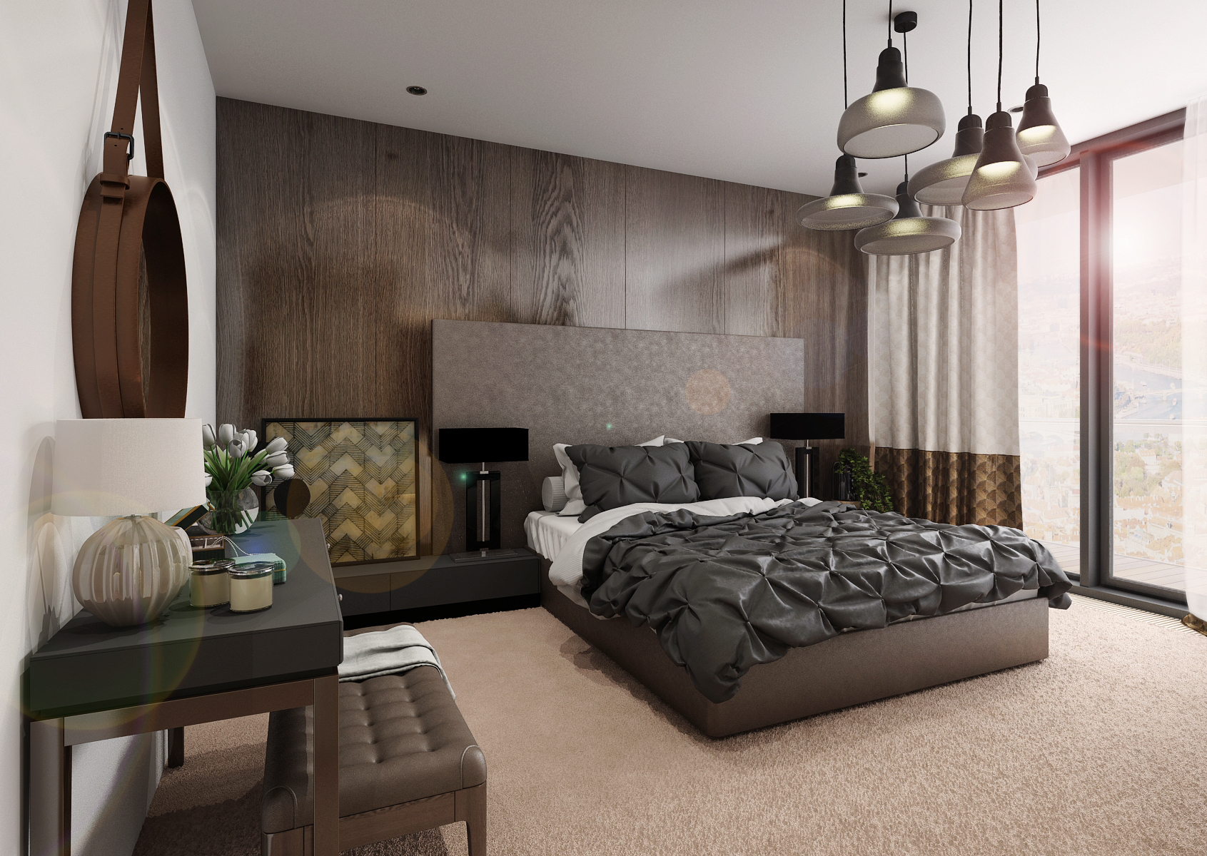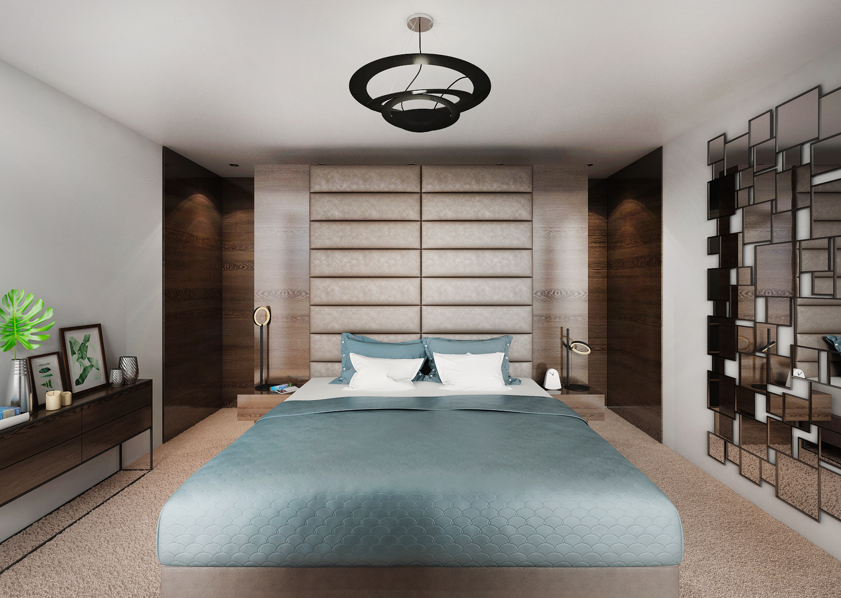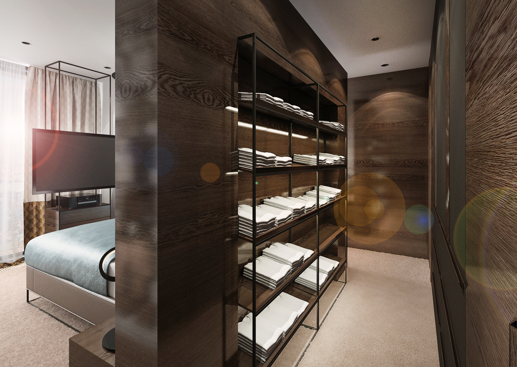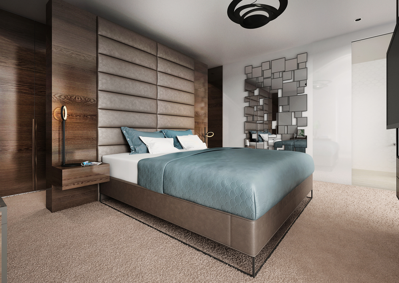Ložnici v tmavém ořechu dominuje dvoulůžková postel s čalouněným čelním panelem sahajícím až ke stropu. Vedle lůžka se nachází zrcadlová dekorace tvořena z různých velikostí čtvercových zrcadel. Za stěnou s postelovým šelem se nachází šatna s vestavěnými skříněmi. Druhá ložnice je navržena v podobném stylu, opět se zde objevuje ořechová dýha za postelovým čelem či v podobě podsvíceného panelu s televizí.