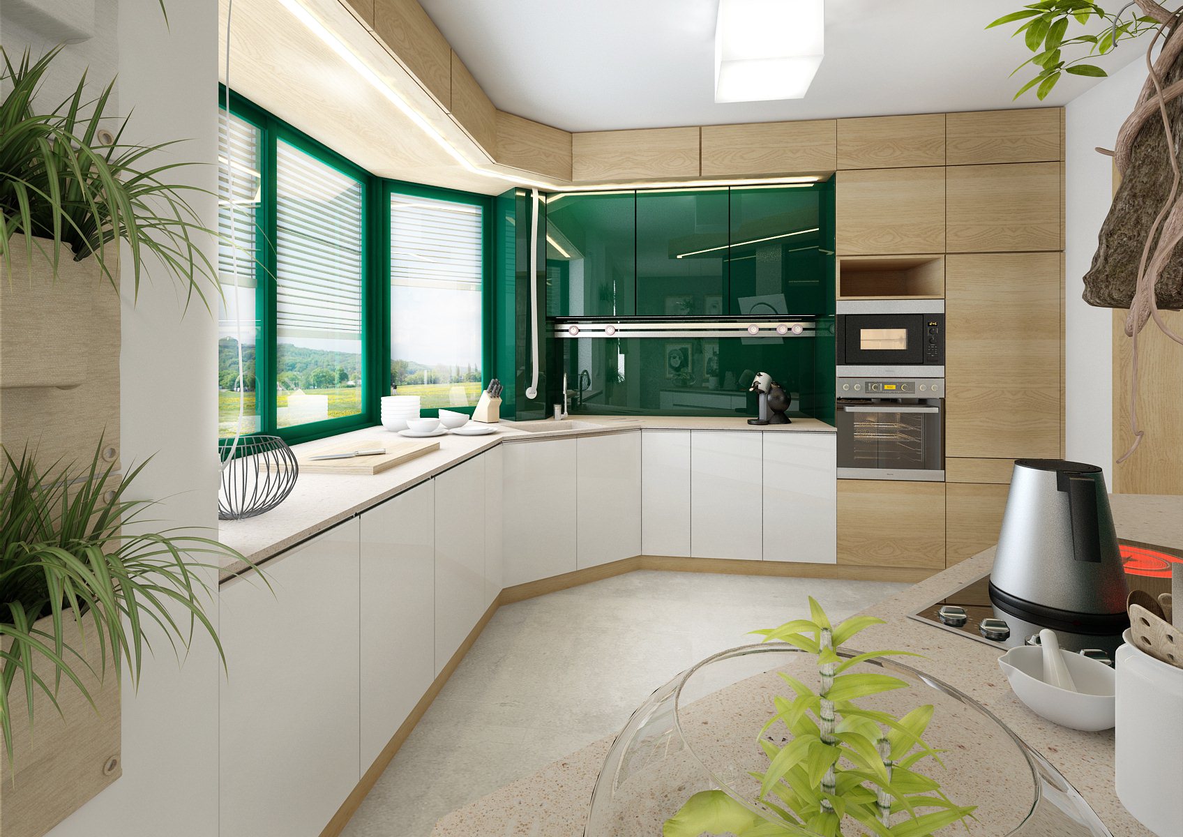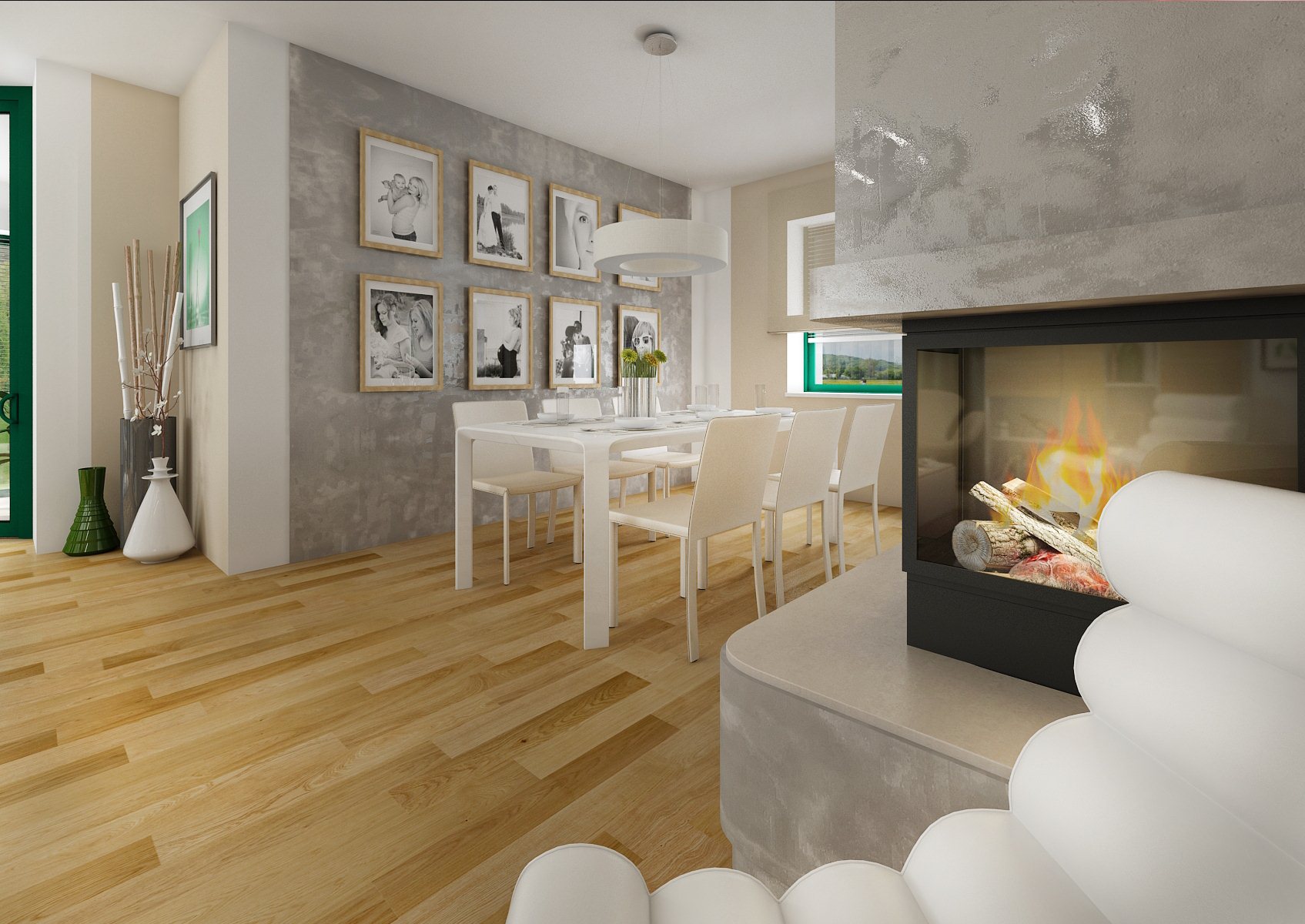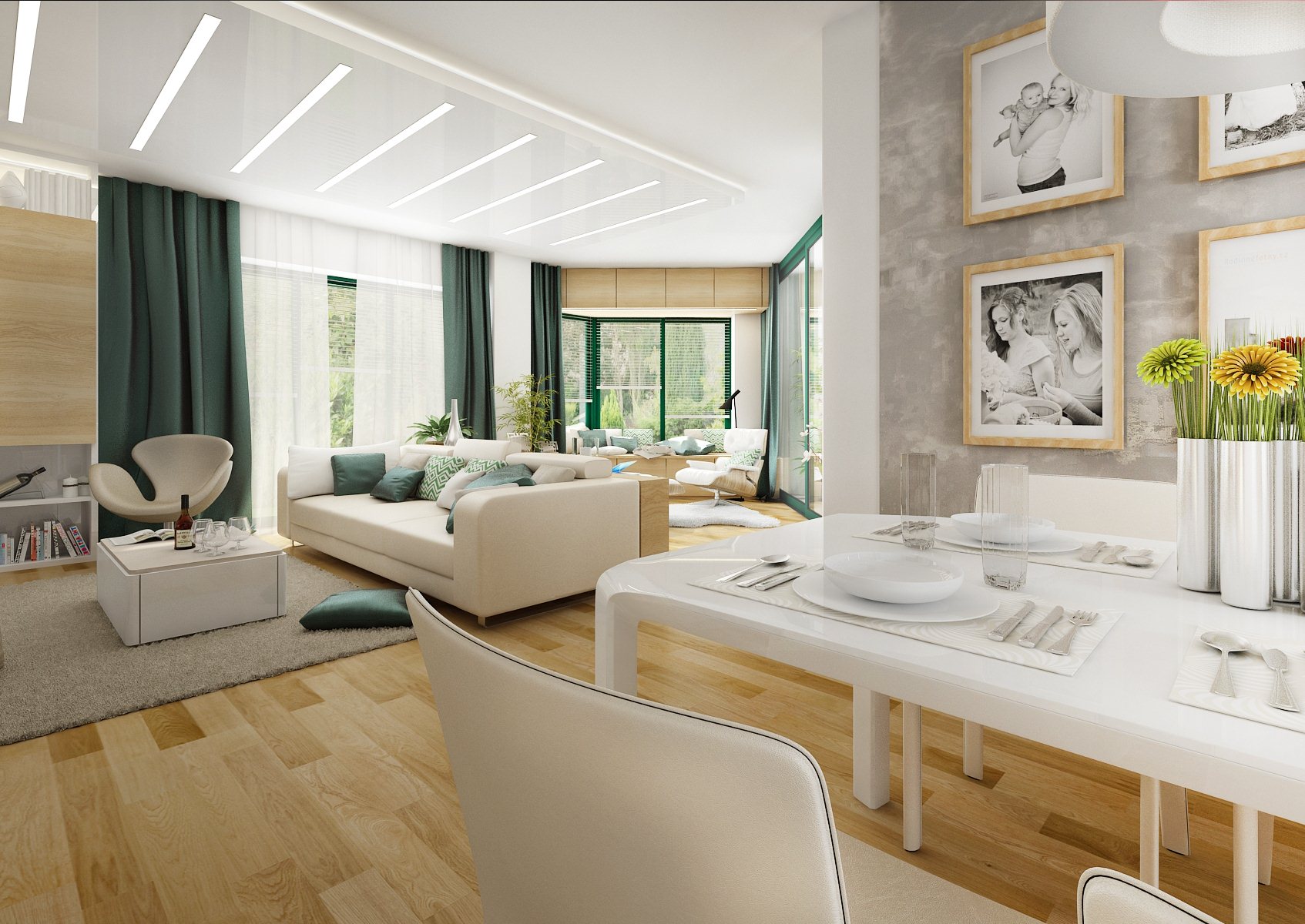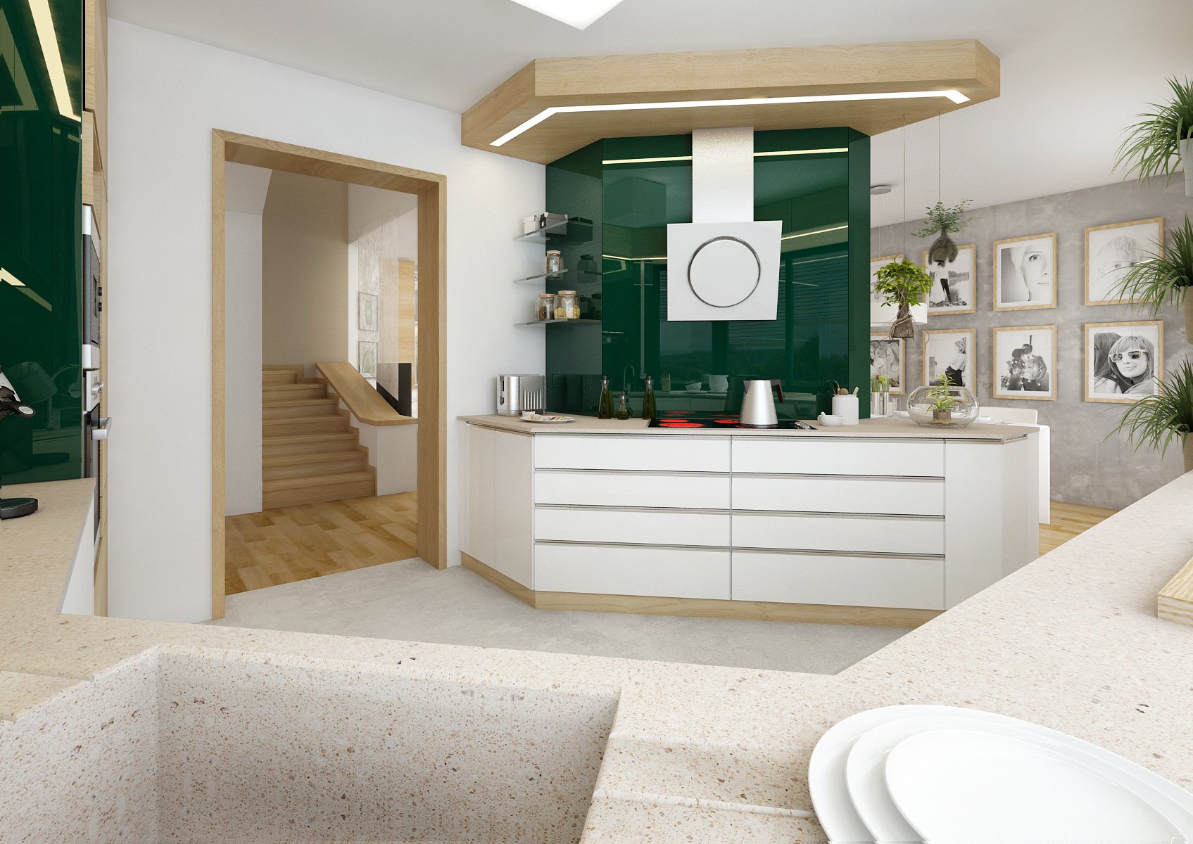V tomto interiéru rodinného domu je použita dubová dýha, která se objevuje i na drobnostech jako nástěnné rámy na fotografie a v kombinaci s betonovou stěrkou tak sjednocuje celkový styl. Výrazným prvkem jsou dvířka a obložení kuchyně ze zeleně lakovaného skla Lacobel, které doplňují závěsy ve stejném odstínu.