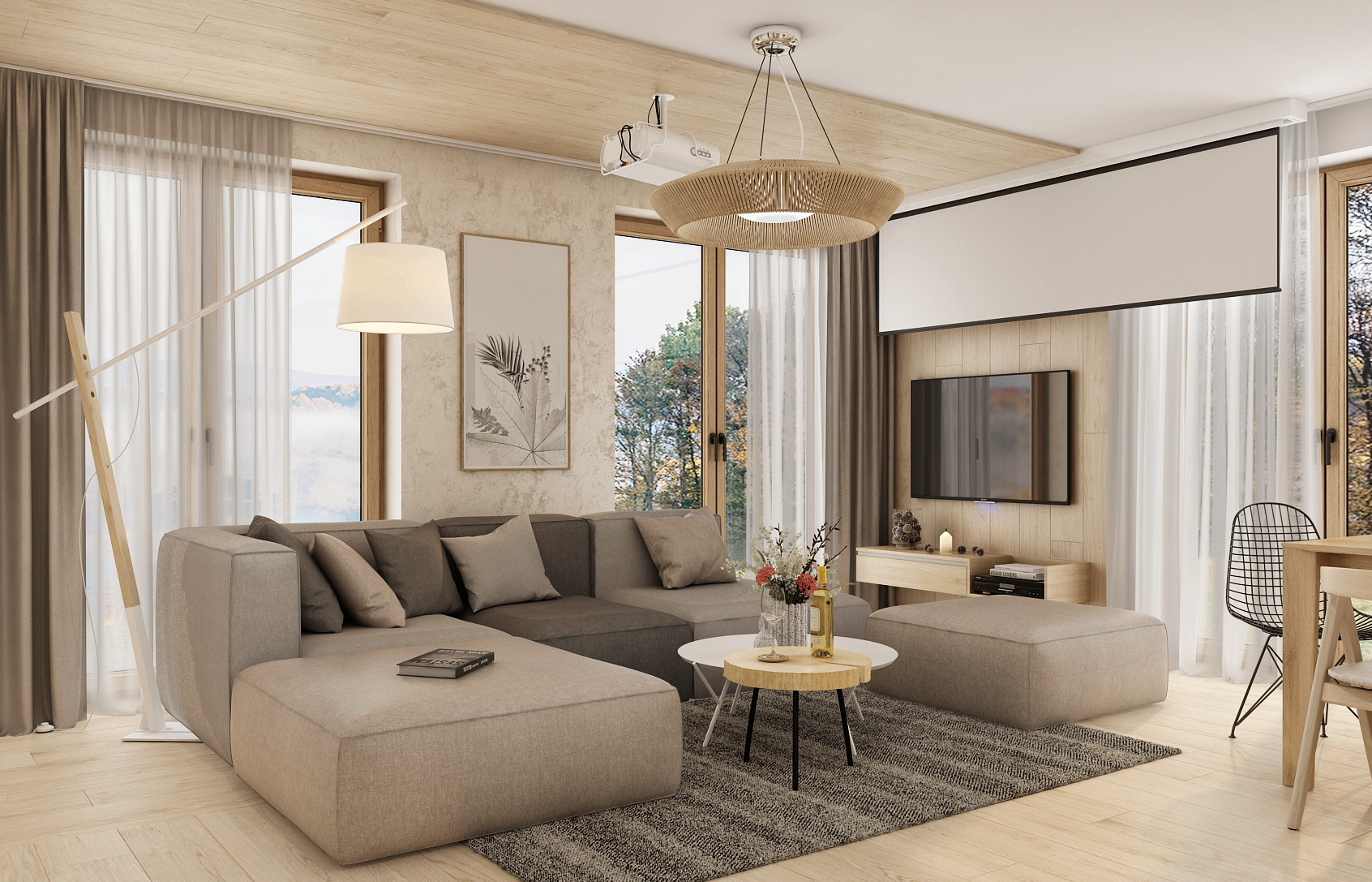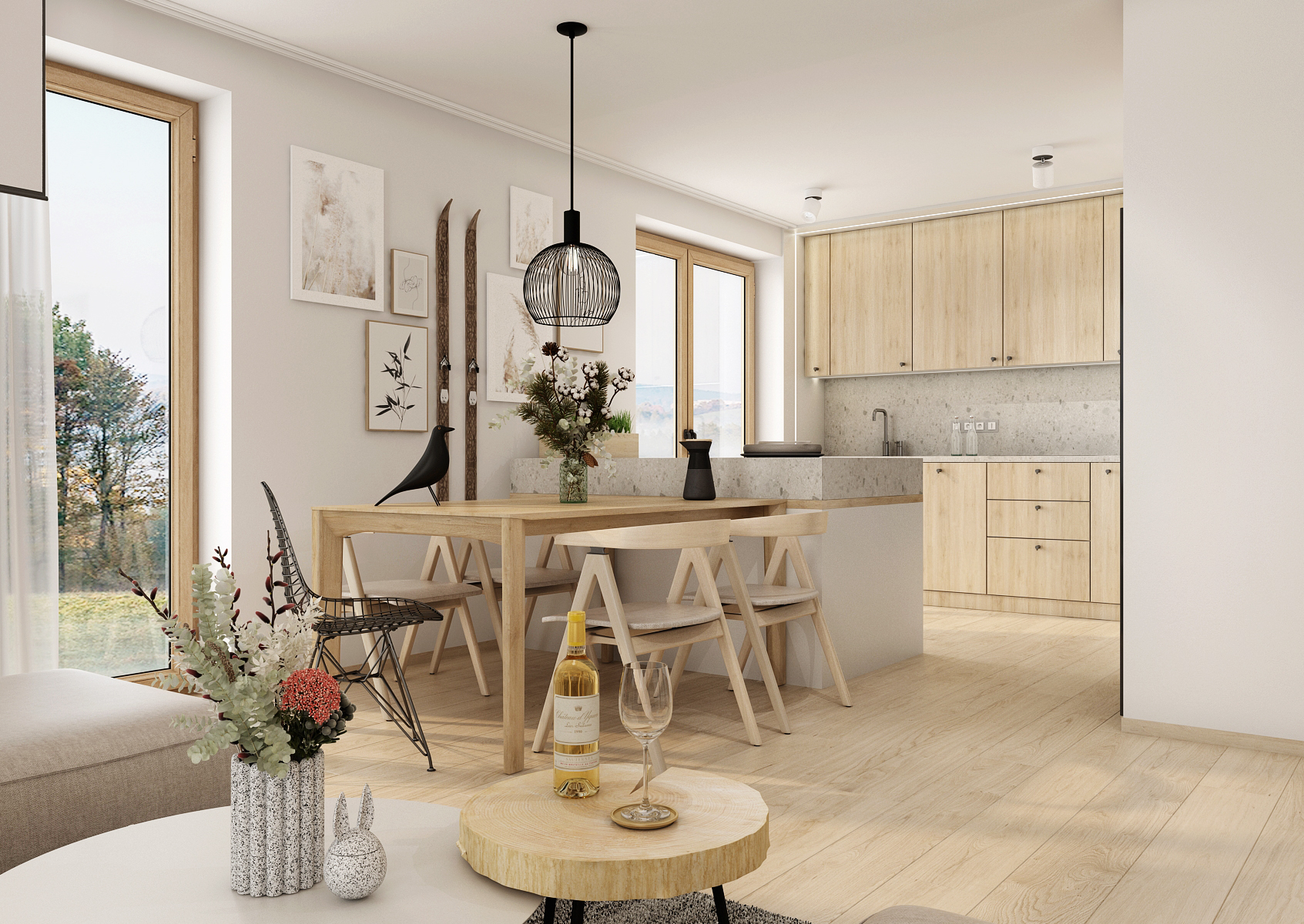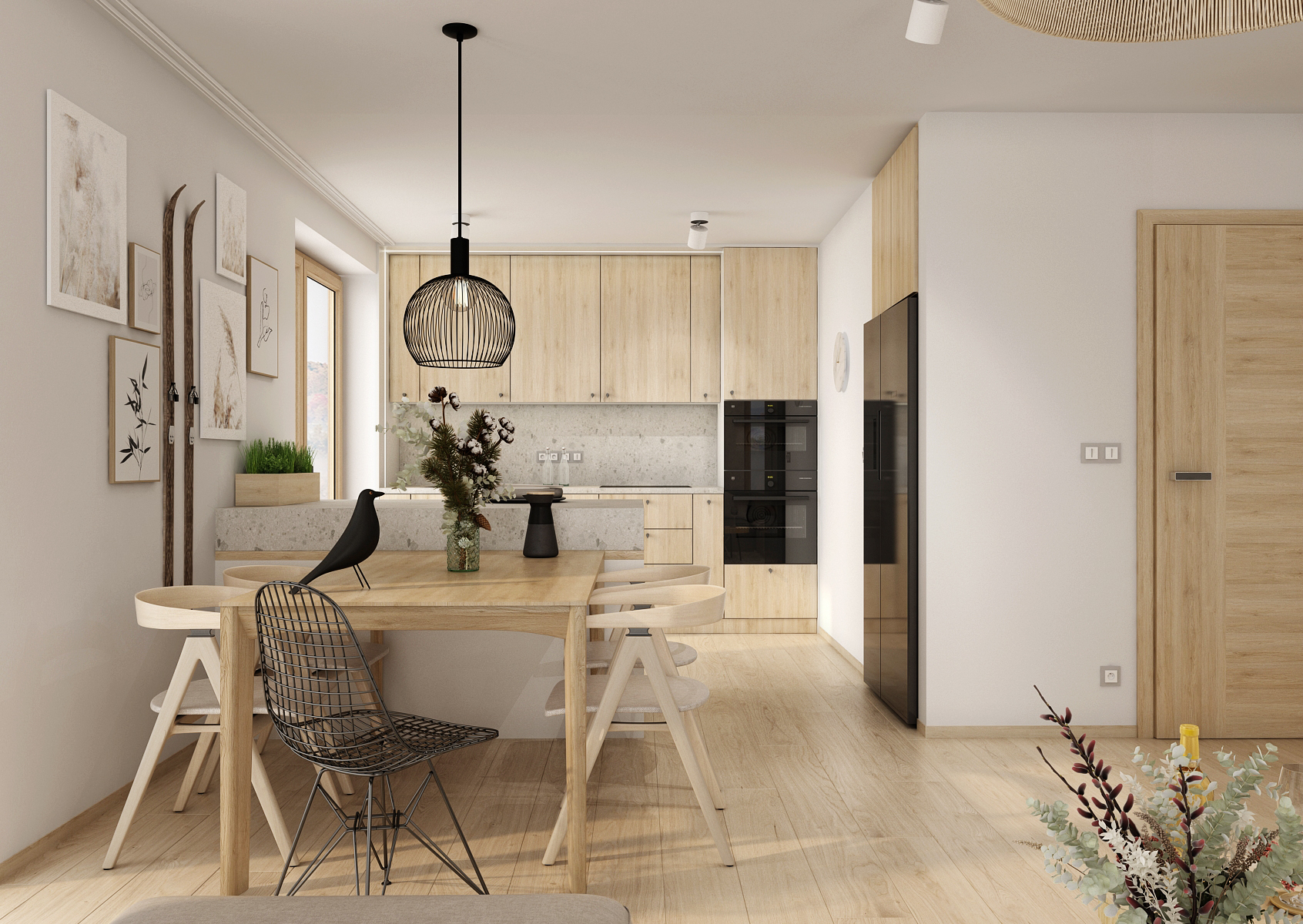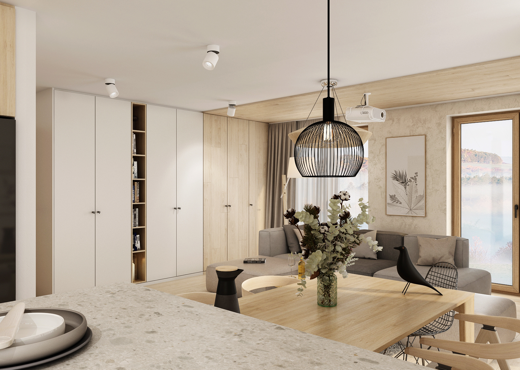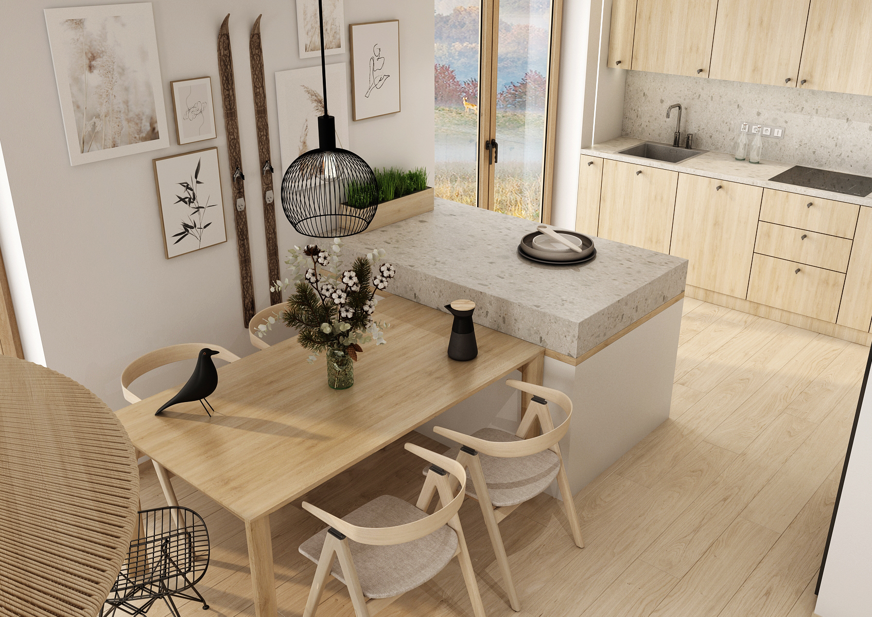 Interiéru moderního víkendového apartmánu dominují hlavně přírodní materiály, jako je dřevo v různých podobách či kámen.